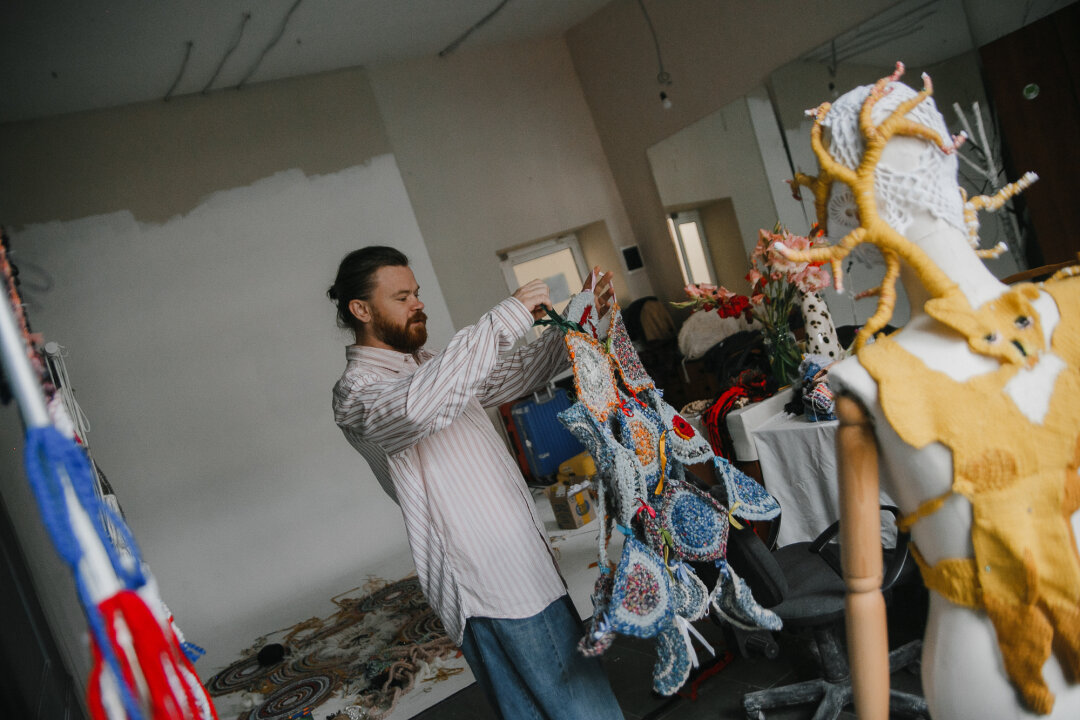 Да, они мне подарили свой сарафан, который возможно скоро переродится в голову оленя. А я снимался в коврах Vereja, которые на последнем показе стали одеждой. Но теперь я снова вернул их в состояние панно и решил дорабатывать и выставлять как предметы искусства.