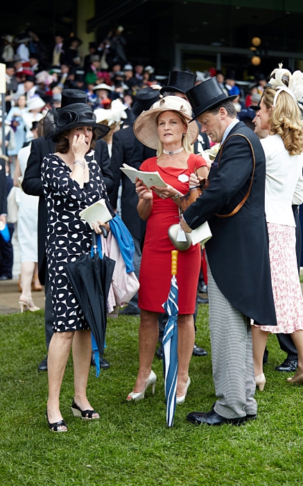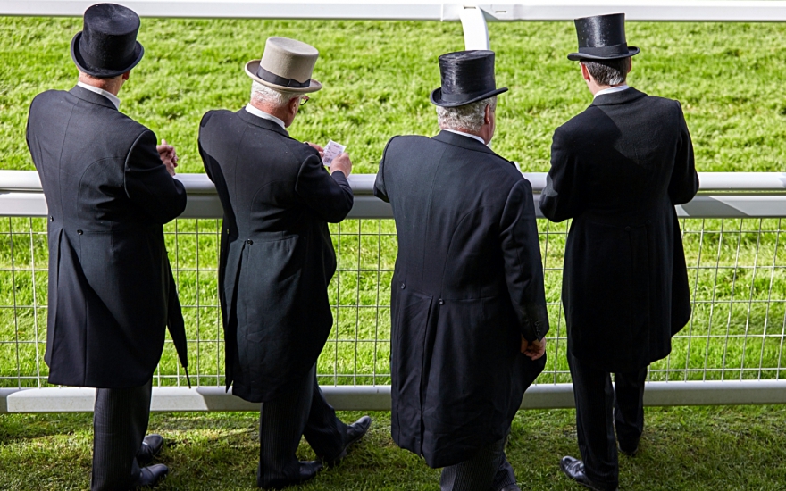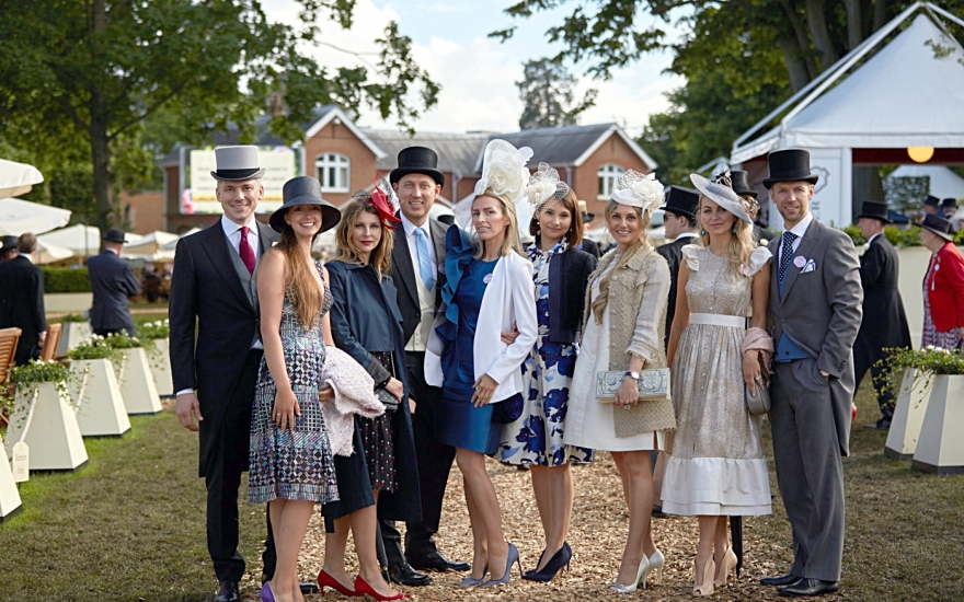 Вместе с приглашением на скачки в красивой коробке организаторы присылают брошюру с подробным описанием дресс-кода. Меня удивило, что девочки и мальчики, начиная с 10 лет, должны одеваться, как леди и джентльмены. Основа мужского дресс-кода — morning dress. Удачный перевод на русский – костюм «визитка», подвид сюртука. Он отличается от фрака cкругленными фалдами, найти такой в России нам не удалось: мы обошли Kiton, Corneliani, Pal Zileri, сделали запросы в Москве — ничего. На удивление, сотрудники некоторых магазинов мужского костюма никогда не слышали о «визитке» — и упорно предлагали мне мужскую визитницу. В Лондоне же традиционный morning dress можно найти как во множестве магазинов готового платья вроде Hackett или Gieves and Hawkes, так и сшить на заказ в дорогих ателье на Savile Row (или взять напрокат за 30% от стоимости). Скачки этого года предполагали черный или серый «верх», такого же цвета «низ» и цилиндр, оказавшийся очень важной частью мужского гардероба. Когда мой муж вышел на пару минут из ложи без головного убора, ему вежливо указали на отсутствие цилиндра. Оказалось, в нем нужно находиться все время, кроме того, когда ты за столом в ресторане.