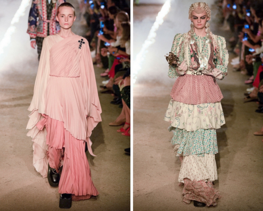 В сэт-дизайне шоу и месте проведения (Алессандро решил показать круизную коллекцию на кладбище Аликамп во французском городке Арле) очевидны отсылки к средним векам. Впрочем, дизайнер не остановился исключительно на исторической привязке к местности, использовав в круизной коллекции БДСМ-атрибутику, элементы одежды священнослужителей, головные уборы а-ля чумной доктор и даже принт с названием голливудского отеля Chateau Marmont, известного своей скандальной репутацией.