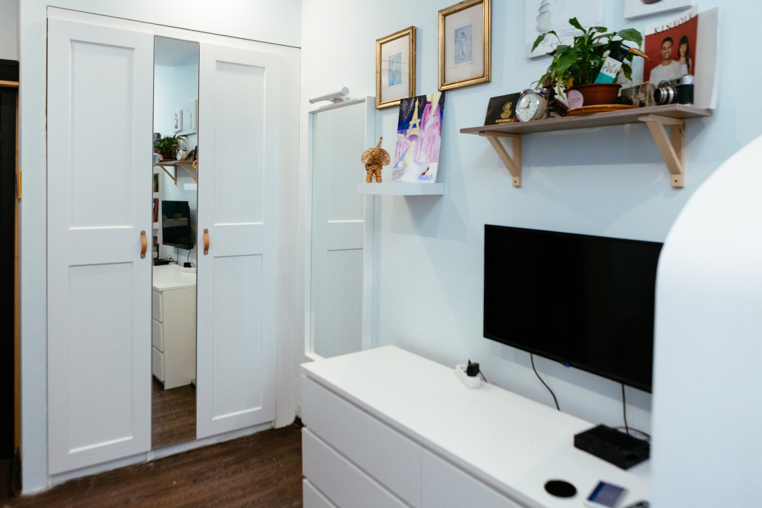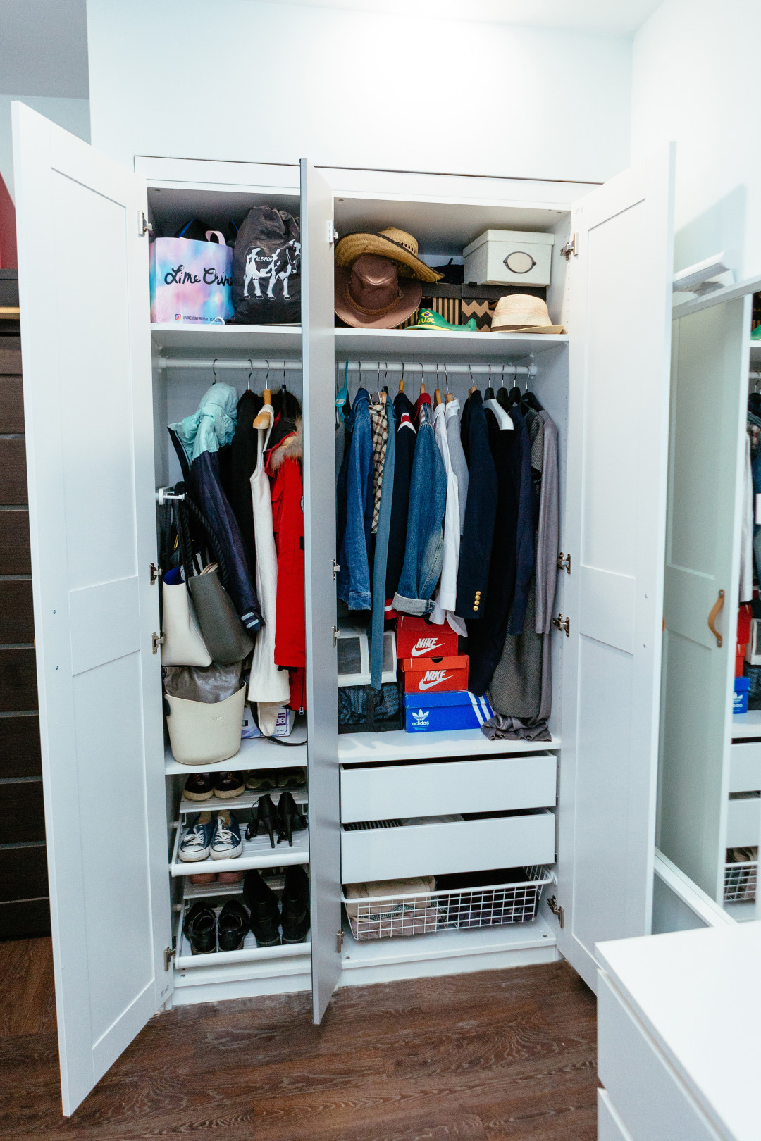 Отверстие для шкафа было в комнате еще целый год после ремонта. Там просто были полки и перекладина, на которой висели вещи, без дверей или каких-либо ящиков. Идея сделать там толковую гардеробную сидела у меня в голове, но никак не могла воплотиться в жизнь по многим причинам. Нужна была четкая спланированная схема и счастливое стечение обстоятельств! Я выбрала самый простой вариант привлечения фортуны – поставила хештег конкурса #bestdressednn под фото, где я одета, как оказалось, очень даже стильно. И в итоге выиграла специальный приз от Икеа – подарочный сертификат на гардеробную.