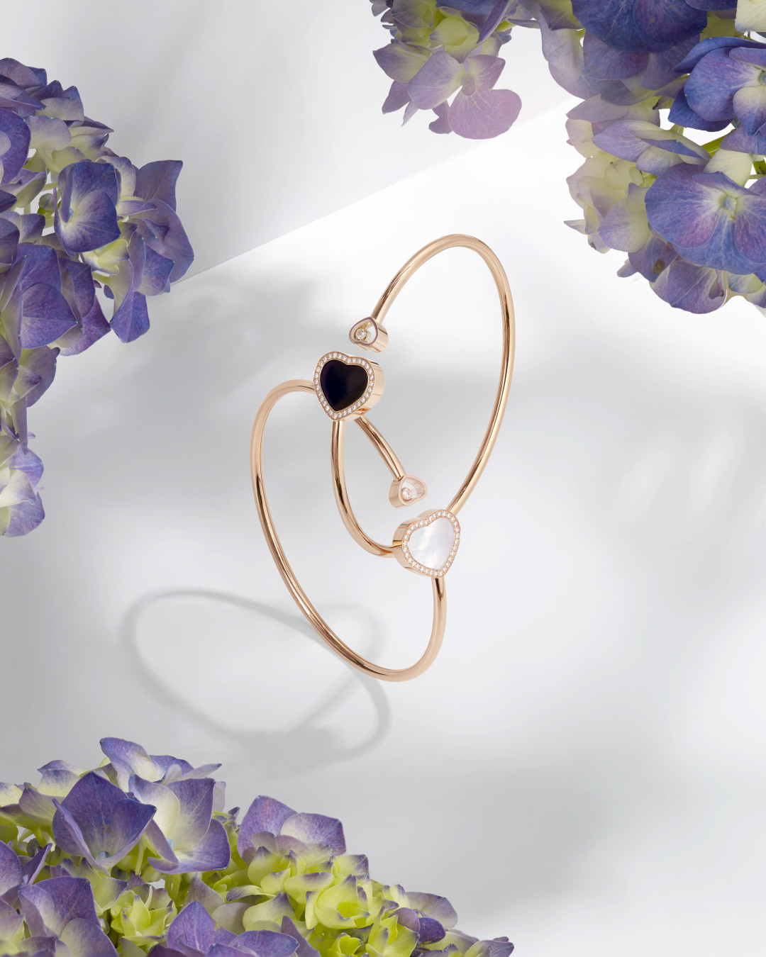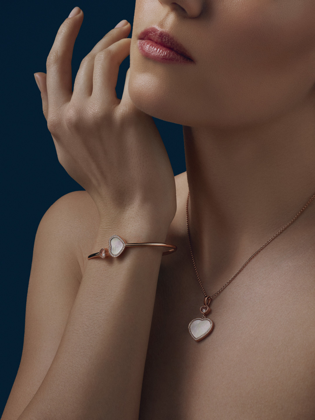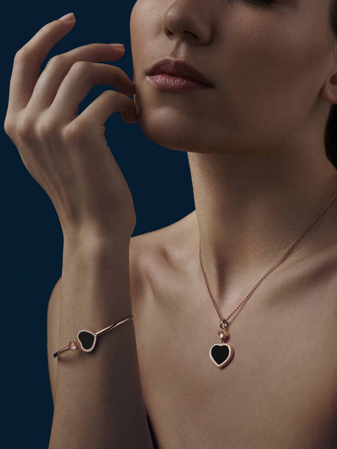 В основе трех новых подвесок и трех жестких браслетов композиция из двух сердец — крупного и небольшого. Первое украшено плавающим бриллиантом, который находится между двумя сапфировыми стеклами, второе сердце, более крупное, выполненное из перламутра, оникса или красного камня, и отделано бриллиантами.