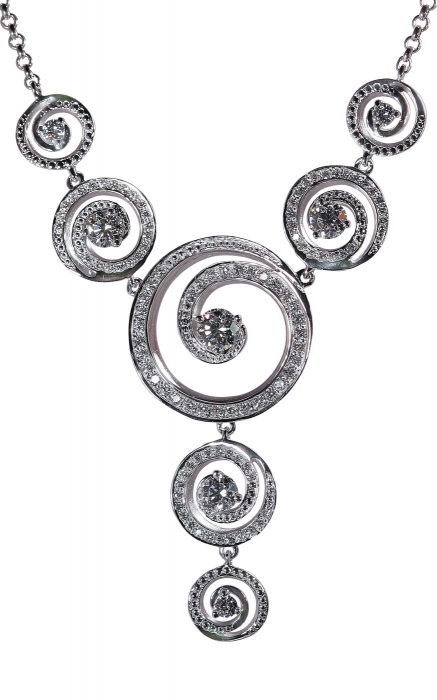 Вихревая дорожка у этой подвески из белого золота тянет на 1,15 карата и вопреки законам физики никакого сопротивления у тела, с которым соприкасается, не вызывает. («Смоленские бриллианты»)