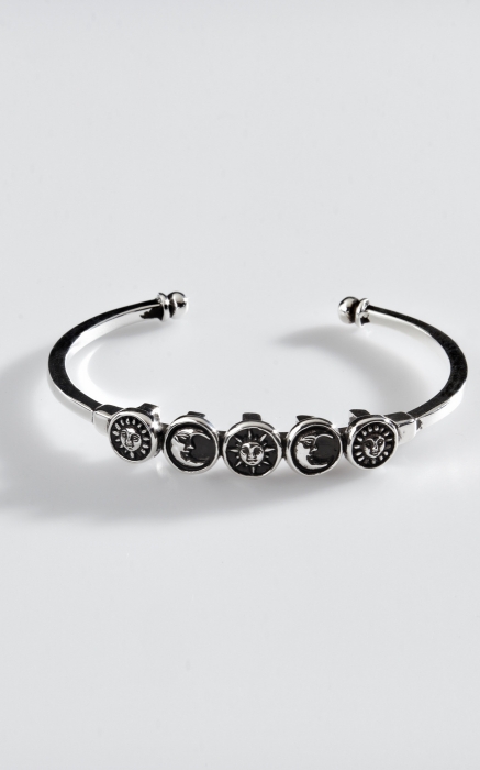 Открытый бэнгл из посеребренной бронзы демонстрирует график дежурства небесных светил: бодрое солнце чередуется со стареющим месяцем. (Галерея Sergio Bustamante)