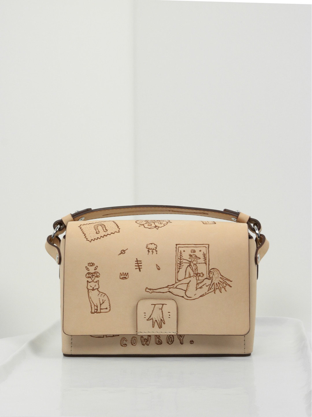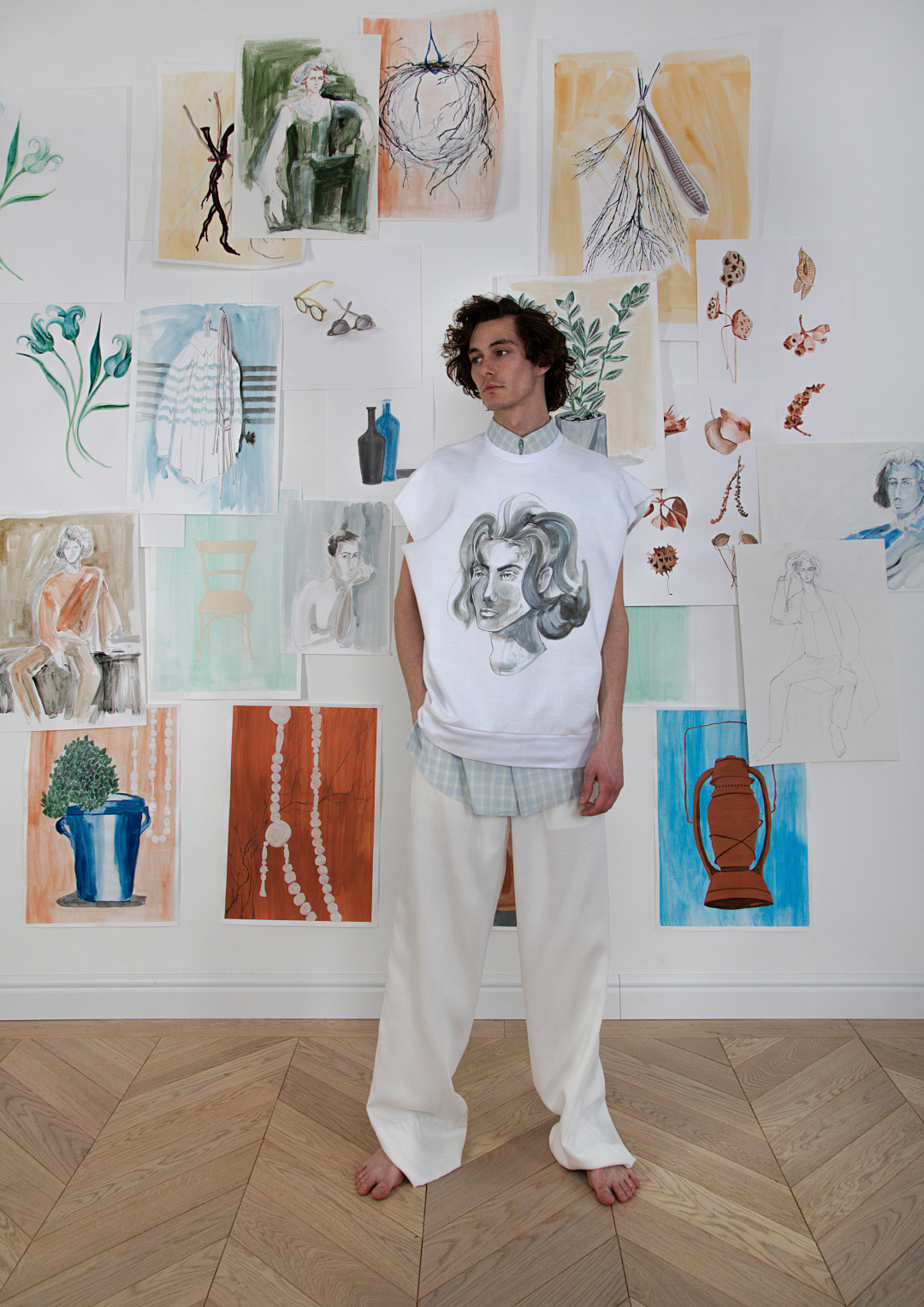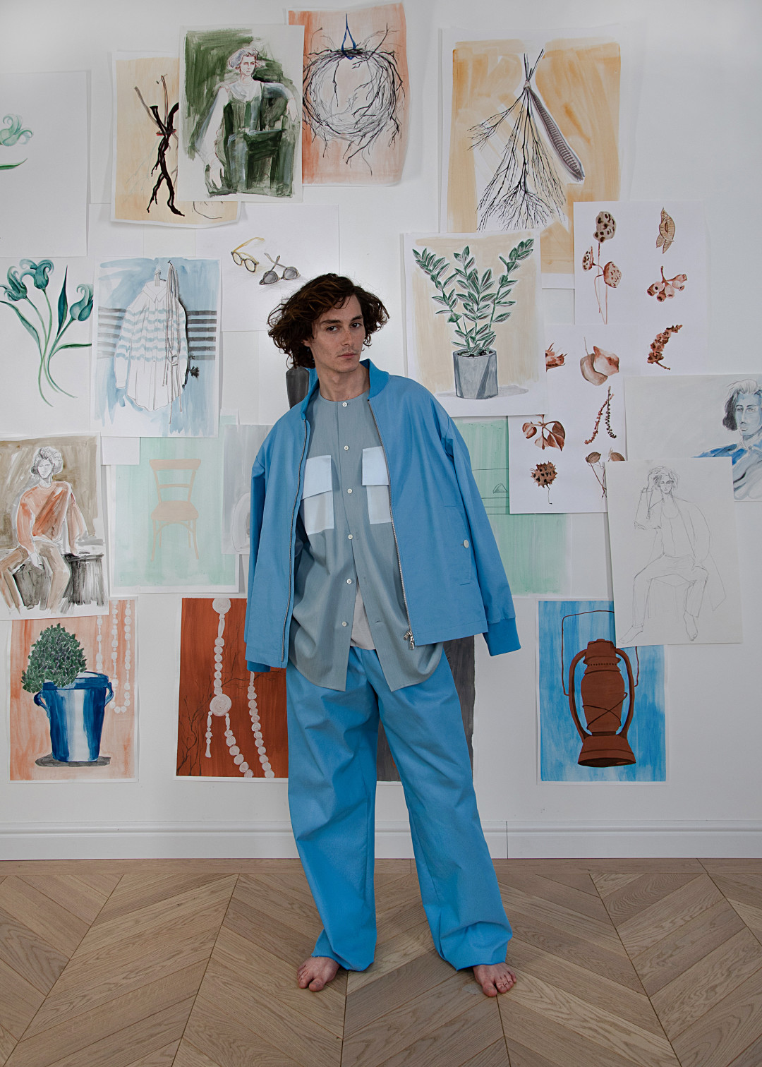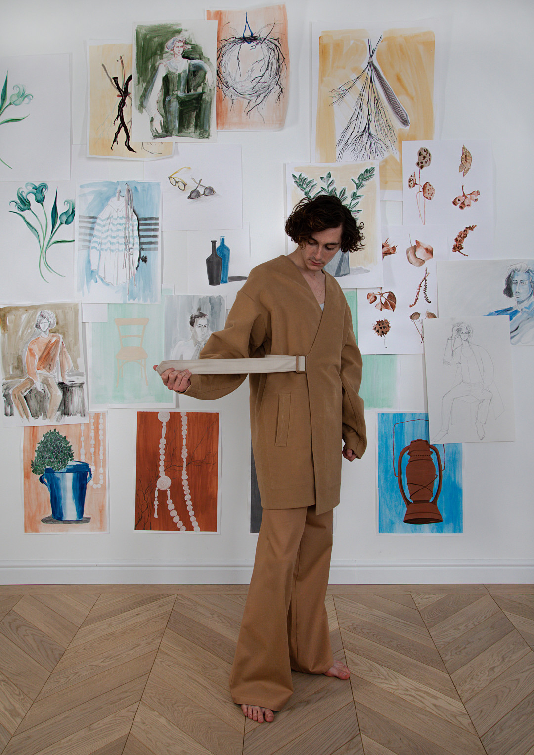 В коллекцию вошли плащи и куртки из хлопкового денима и бархата с ассиметричной застежкой и карманами на полочке похожей на передник художника, свитшоты с объемными рукавами из хлопкового трикотажа и сатина, хлопковые рубашки с накладными карманами, напоминающие о гавайских пальмах, сорочки из тонкого хлопкового батиста без рукавов, футболки с живописными принтами, дорожные костюмы: бомбер с молнией и брюки на кулиске из хлопкового денима, трикотажные джемперы из шерсти мериноса неотбеленных естественных оттенков и многоцветный джемпер связанный в технике «интарсия», отсылающий к пейзажам, которые видно из окна самолета. В качестве аксессуаров — тубусы для воды и кожаные сумки. Рисунки на них — не просто принты, а татуировки авторства петербургского тату-мастера Тимура Война Кошки.