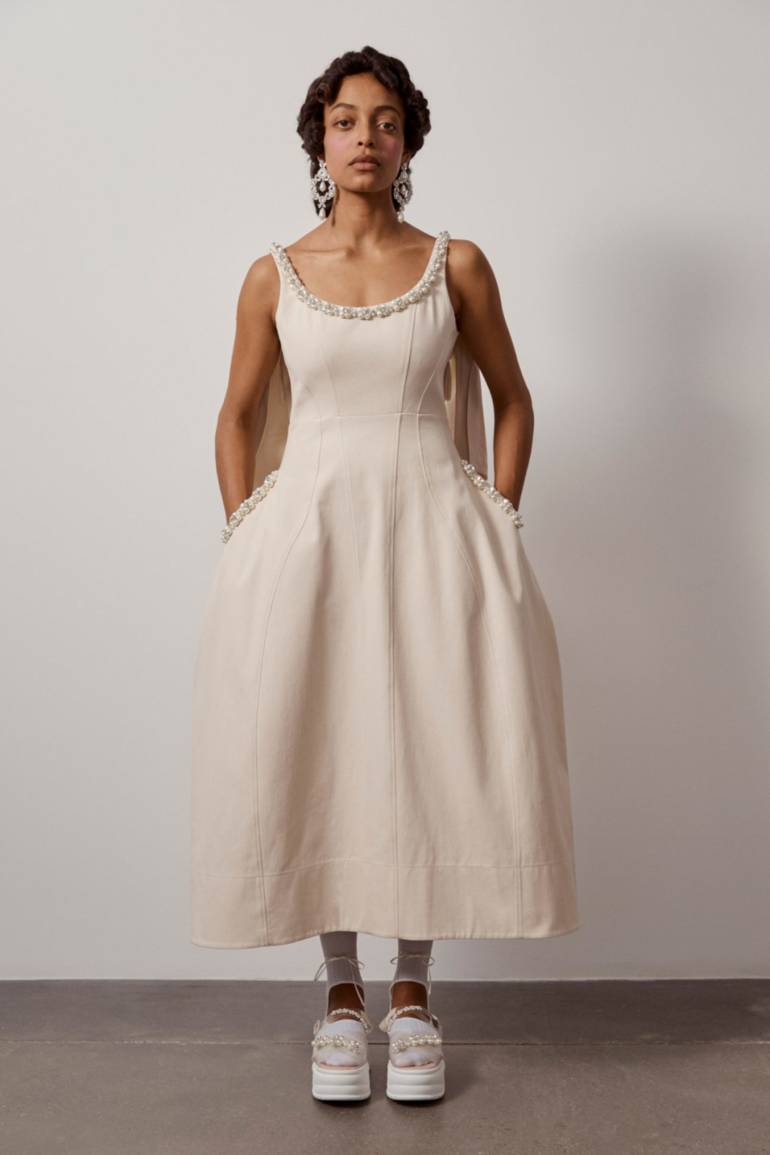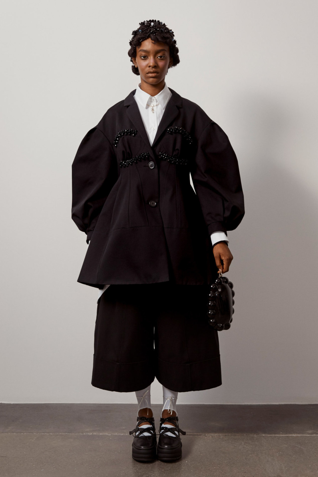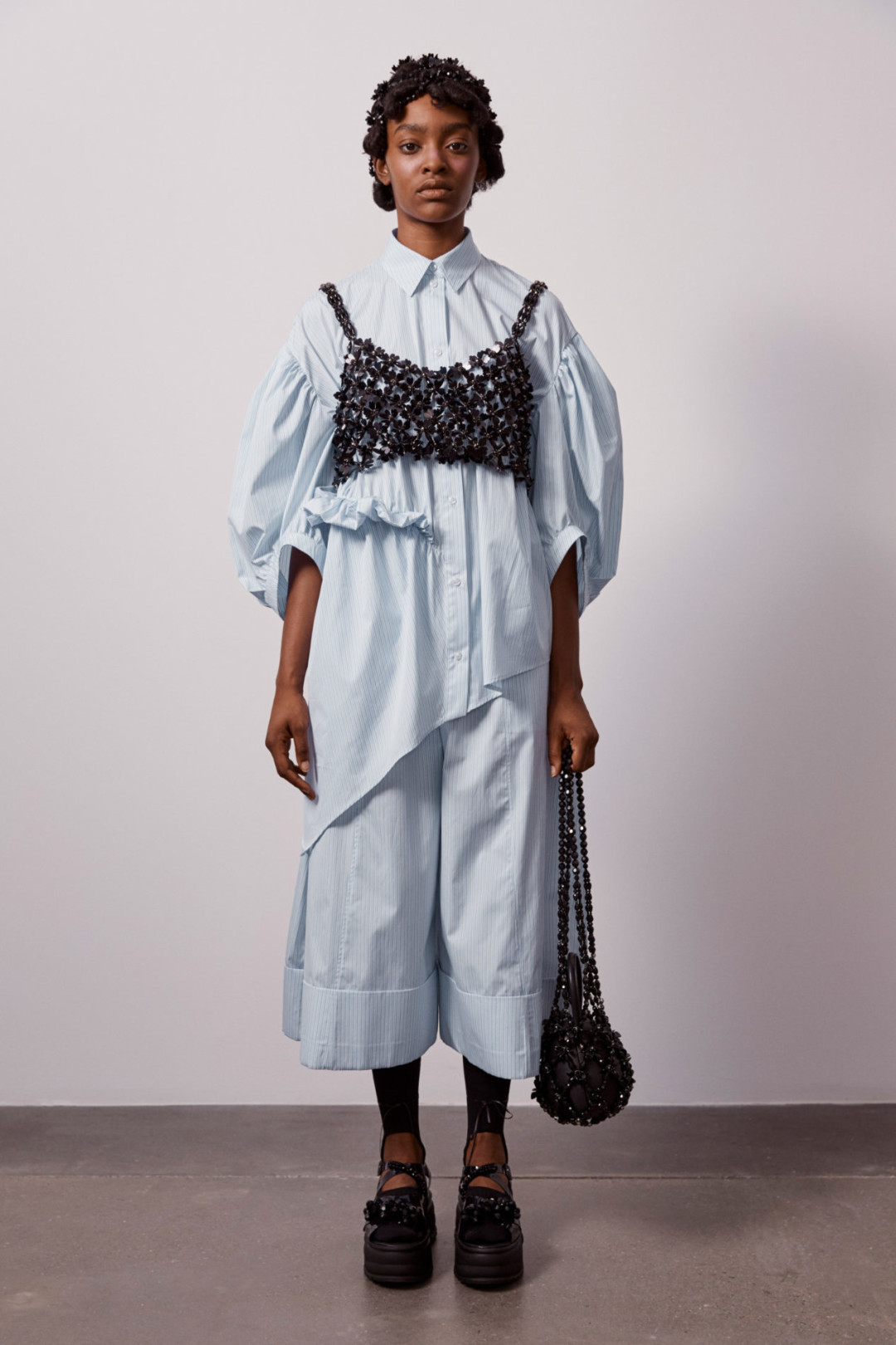 Кроме них в коллекцию весна-лето 2021 вошли платья на манер бальных с подчеркнуто талией и объемными рукавами, оверсайз плащи, костюмы с удлиненными рубашками-платьями, круглые сумки и авоськи из жемчуга. Главные цвета: сдержанные бежевый, белый, голубой и черный.