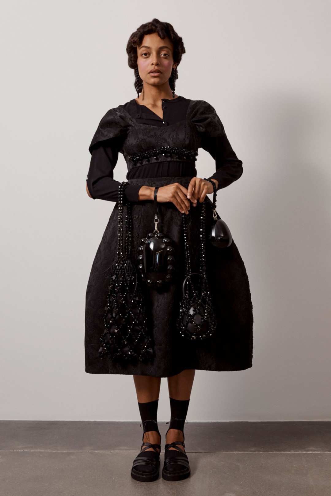 Креативный директор бренда Симон Роша не изменяет себе и добавляет в казалось бы максимально феминные образы и силуэты элементы рыцарской эстетики. Так в новой коллекции появились современные интерпретации кольчуг и бандажи.