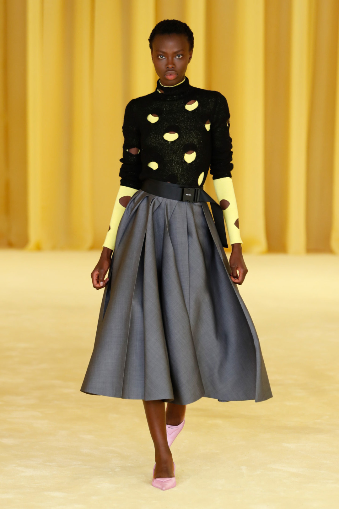 Коллекция объединила знаковые для обоих дизайнеров элементы и вещи, например, женственные силуэты Миуччи Прада и фирменные водолазки Рафа Симонса. Сет-дизайн показа включал презентацию моделей, принимавших участие в нем, — на экранах появлялось имя каждой участницы шоу. После трансляции (но показ проходил не в реальном времени), Симонс и Прада провели пресс-конференцию, где рассказали о совместной работе и ответили на вопросы зрителей.
