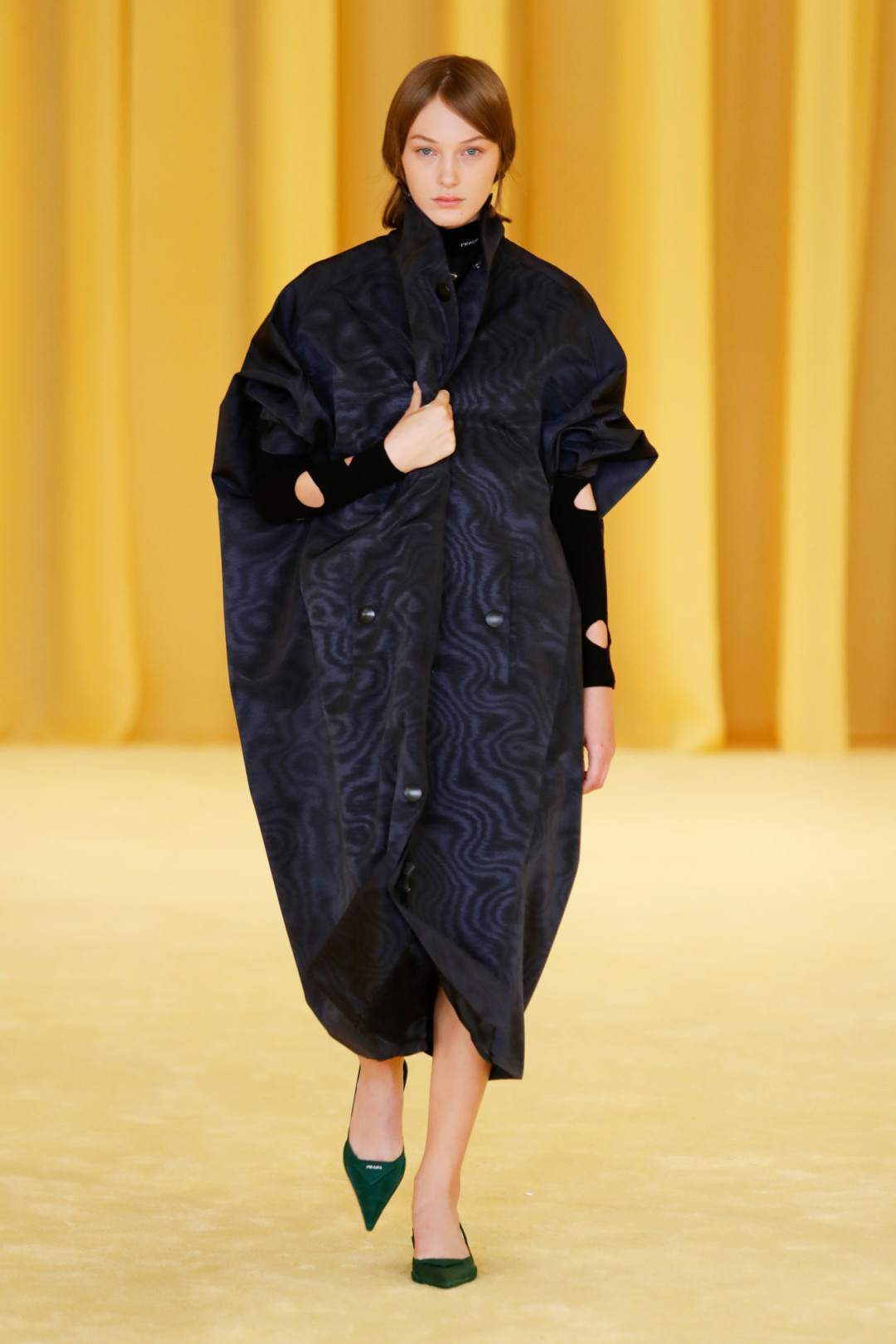 Над коллекцией Prada весна-лето 2021 Миучча Прада работала вместе с Рафом Симонсом, который присоединился к команде бренда в качестве второго креативного директора в этом году. Сегодня дизайнеры представили результат своего первого сотрудничества. Им стали тренчи и пальто без застежек, вещи с объемными карманами — альтернативой сумкам, платья и блузы с большим логотипом бренда на воротниках, лонгсливы и водолазки, декорированные миниатюрными дырами.
