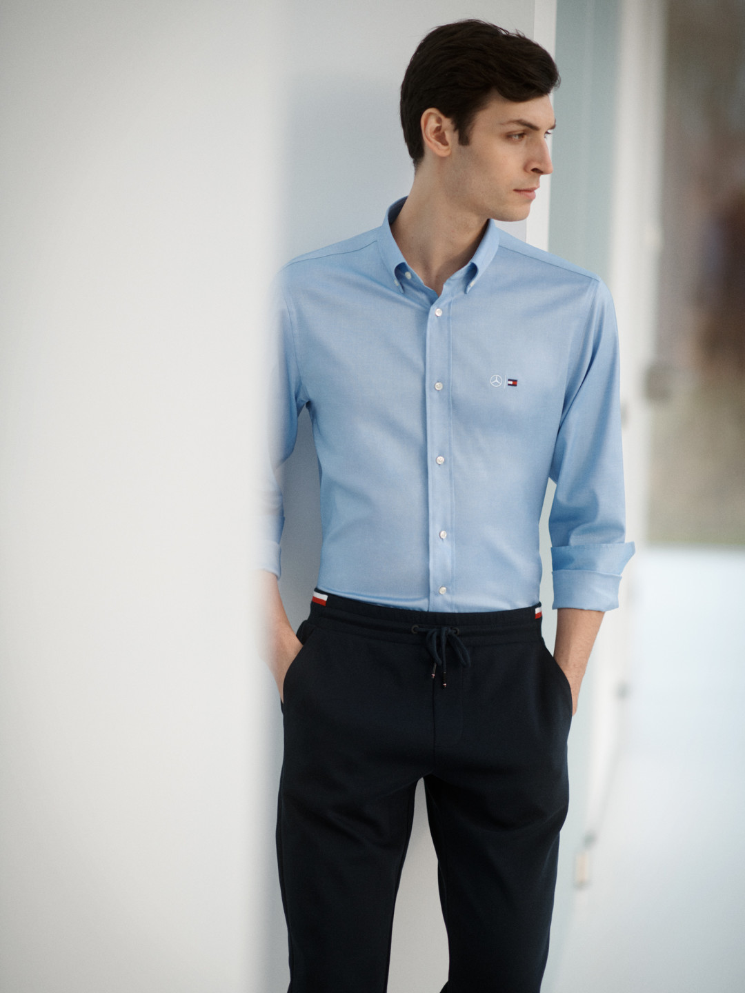 В капсулу вошли и более повседневные вещи, например, хлопковый свитер, толстовка, джоггеры, поло, рубашка и брюки чинос. Классическая для Tommy Hilfiger красно-бело-синяя цветовая палитра дополнена оранжевыми, светло-серыми и оливковыми оттенками. Среди принтов — полоска, фирменный флаг бренда и логотип Mercedes AMG Petronas.