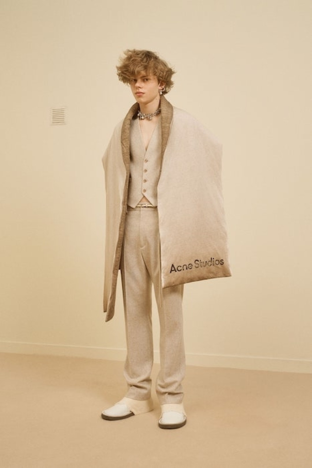 Acne Studios показали свою новую мужскую коллекцию, в основе которой рабочая униформа и поддельный логотип бренда. Дизайнер модного дома Джонни Йоханссон нашел его в интернете и решил превратить в принт. Так на шарфах, сумках и перчатках появилась фейковая надпись Acne Studios, которую использовали для создания подделок.