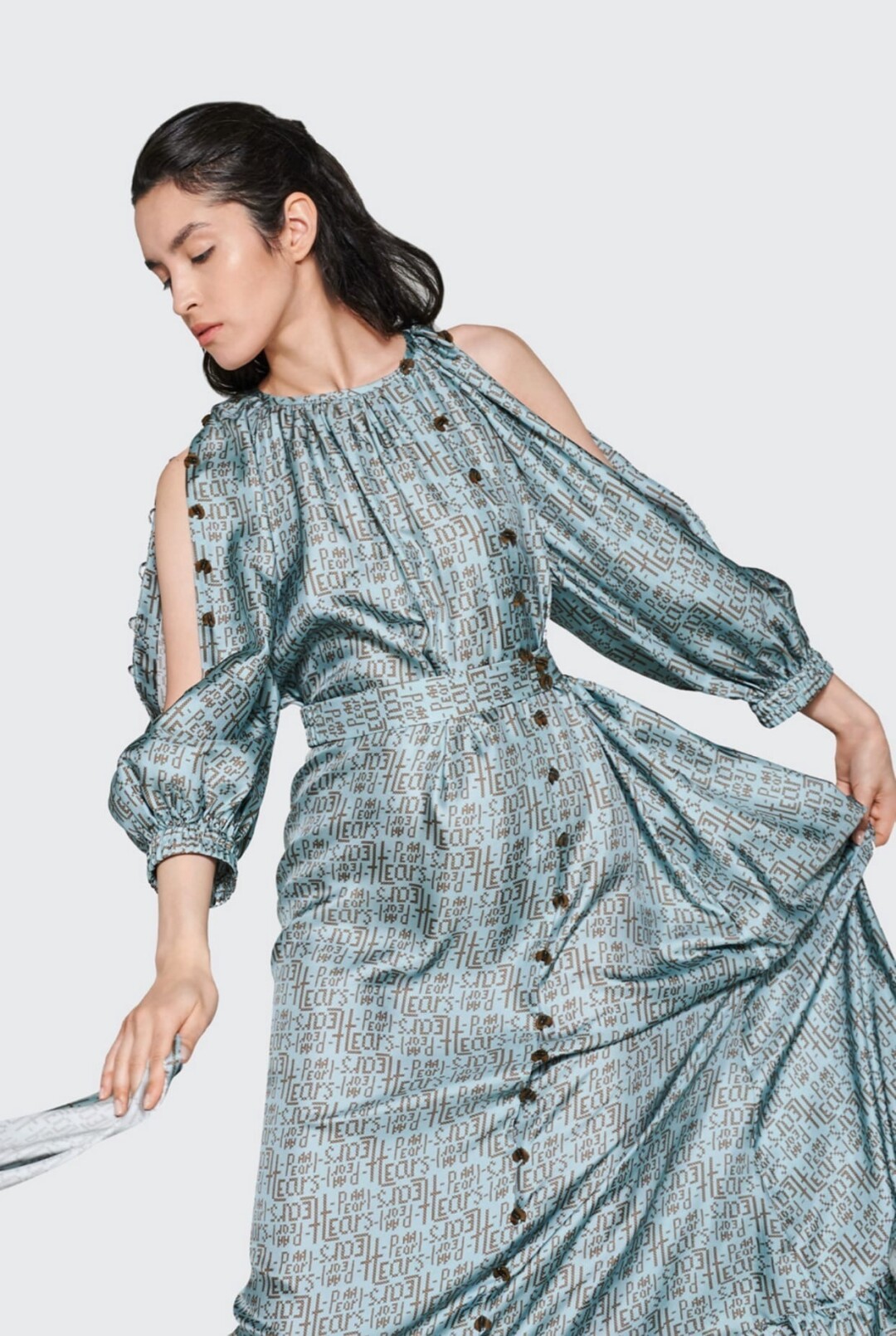 В этом образе соединились русские традиции и актуальные тренды. Платье из серо-бирюзового шелка с шрифтовым принтом, будто вышитым крестиком - элементы старинных русских узоров на тончайшей ткани. Изящная и волшебная интерпретация Снегурочки, украшенная сказочным северным орнаментом.