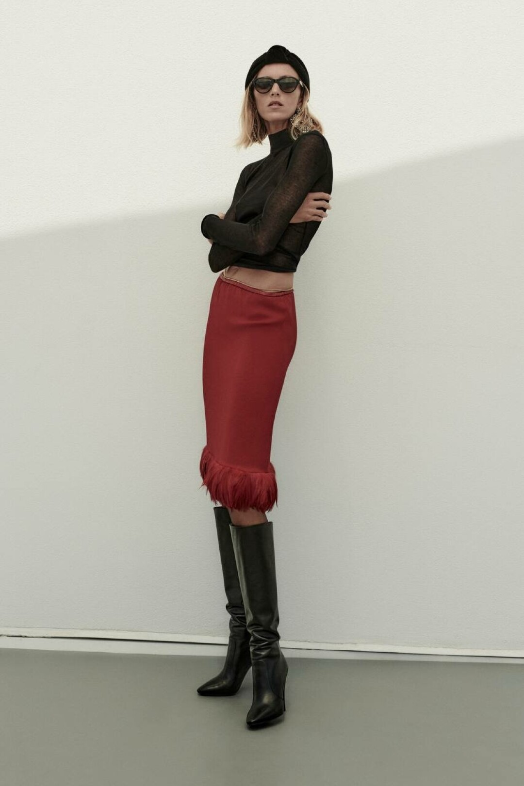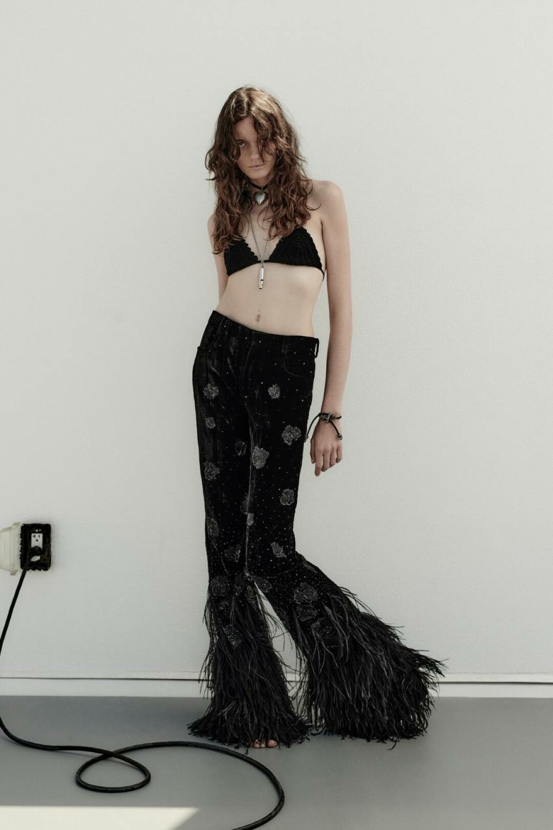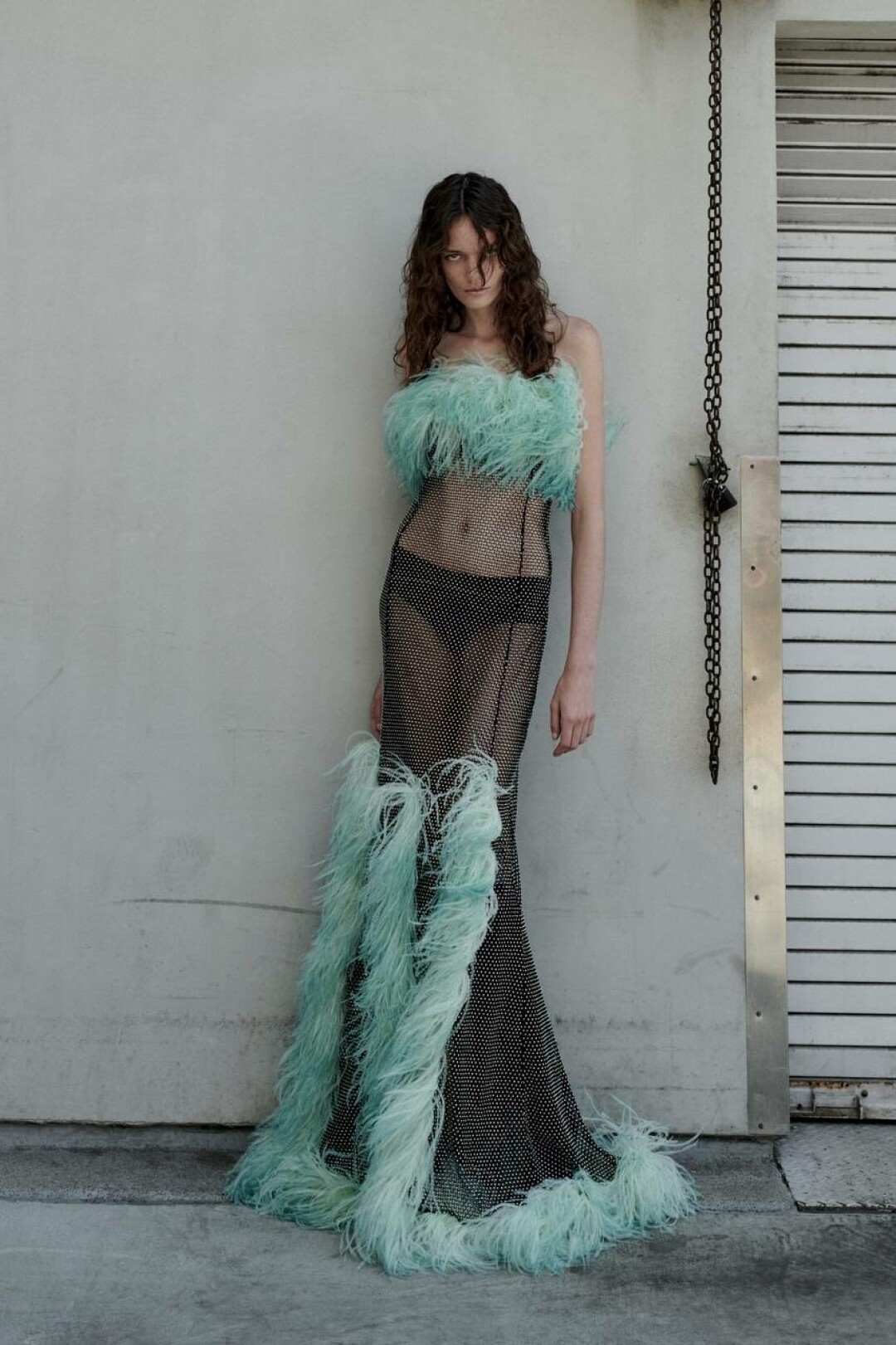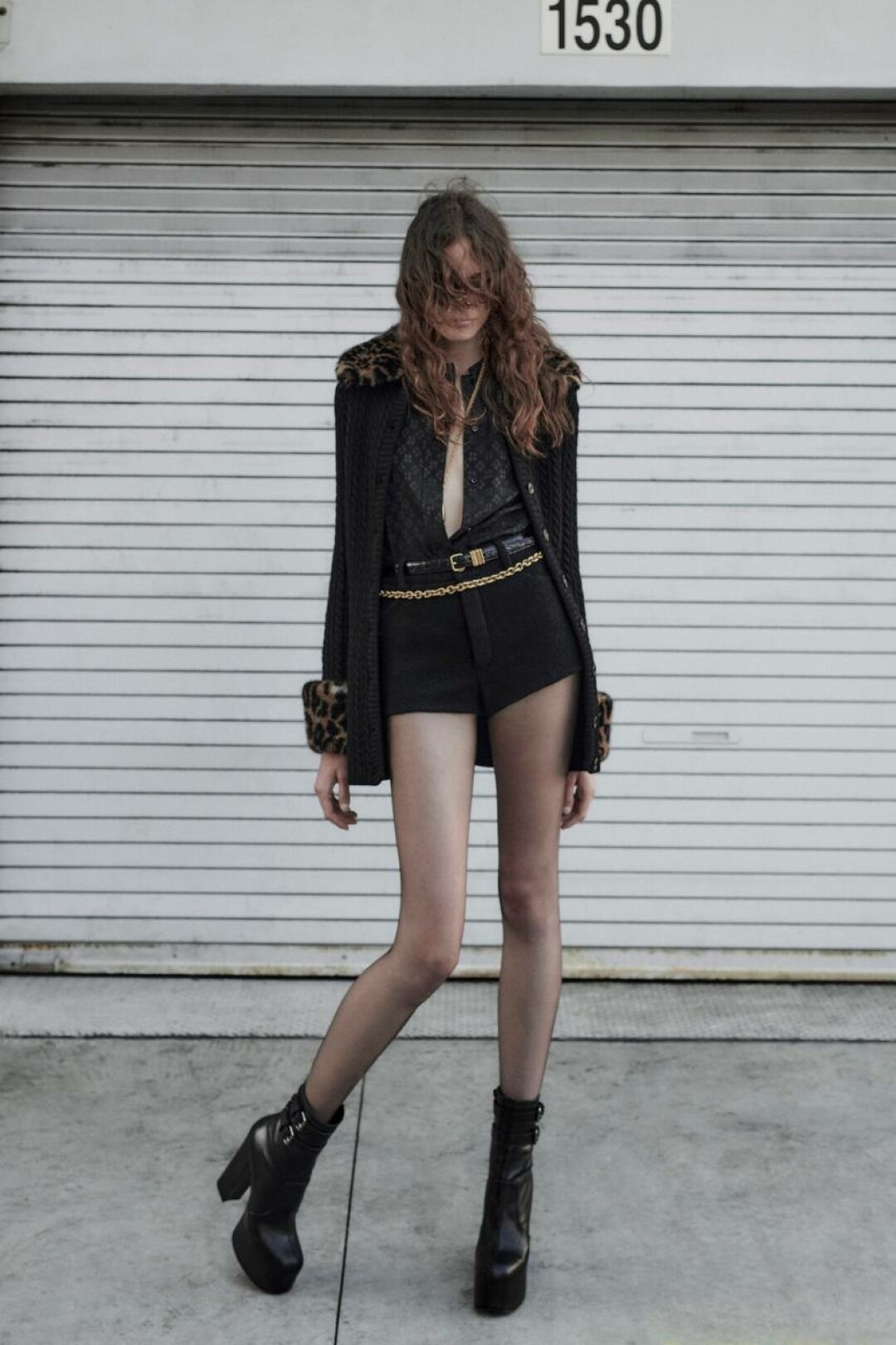 Коллекция состоит из голых платьев, платьев, юбок и брюк, украшенных перьями и стразами, прозрачных бра, кожаных и латексных плащей, шелковых рубашек с глубокими вырезами на груди и микрошорт. В новом лукбуке Saint Laurent снялась топ-модель Аня Рубик.