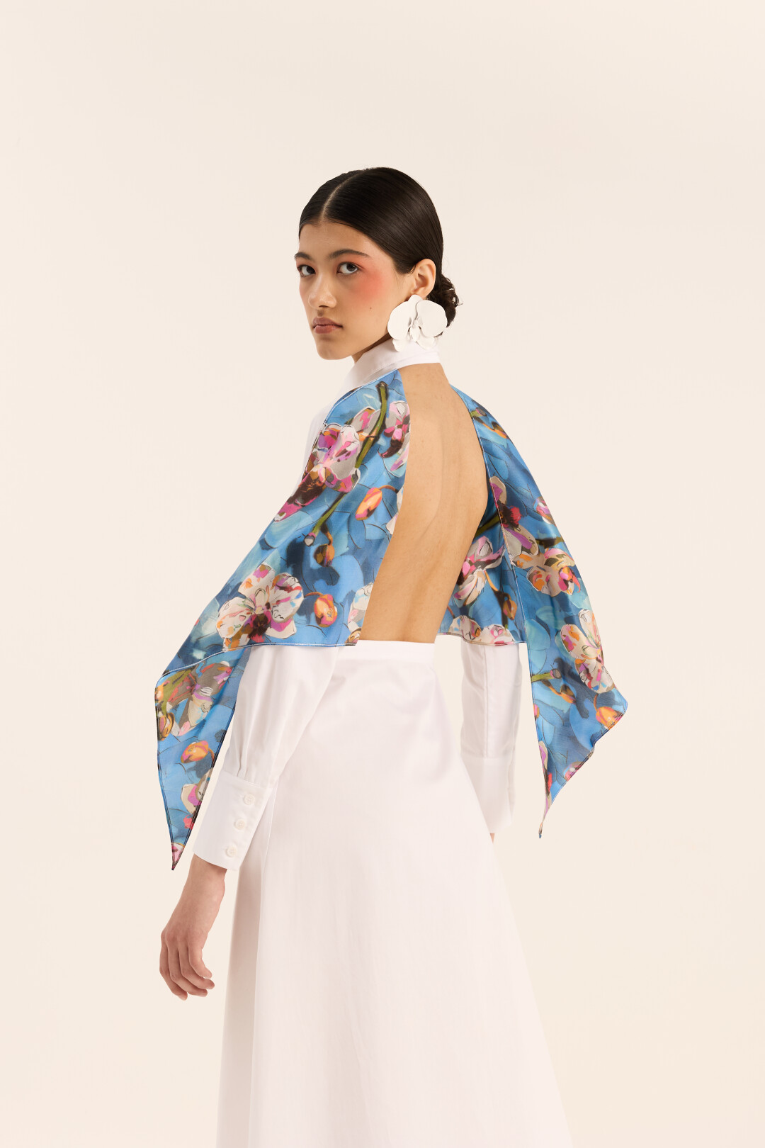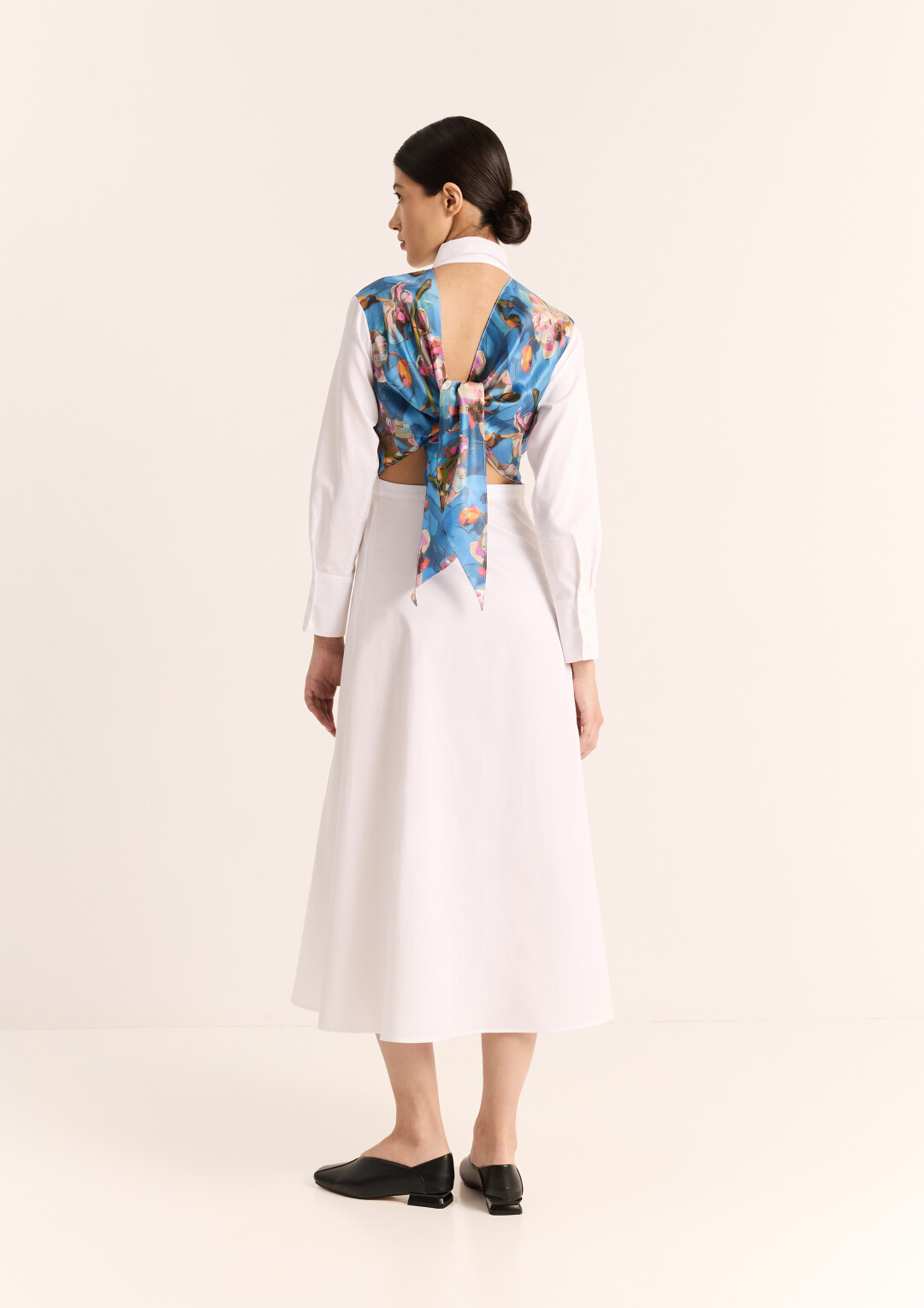 Платье-рубашка из летящего хлопка с шелковой спинкой нижегородского бренда Felamen позволит чувствовать себя роскошно на городских улицах или ужине в пляжном ресторане. Полуприлегающий силуэт подчеркивает талию, а свободная юбка струится при движении, придавая образу особый шарм. Шелковые детали спинки можно завязать или оставить развеваться по ветру — ориентируйтесь на погоду и своей настроение. Авторский принт на шелке был разработан основателем и дизайнером бренда Анастасией Сысориной.