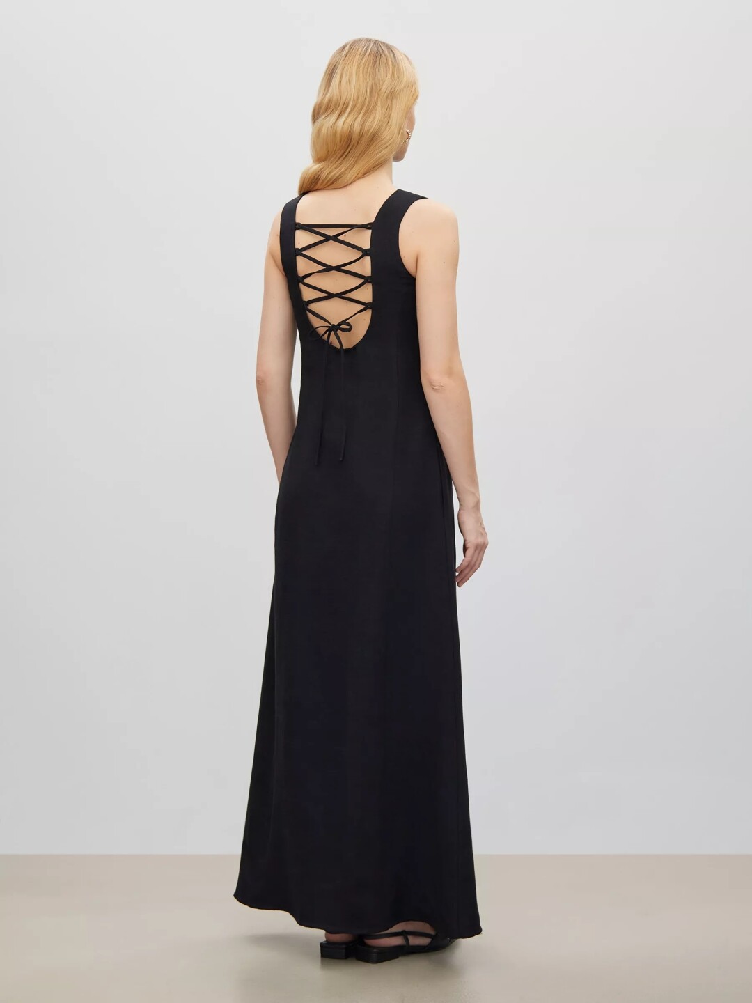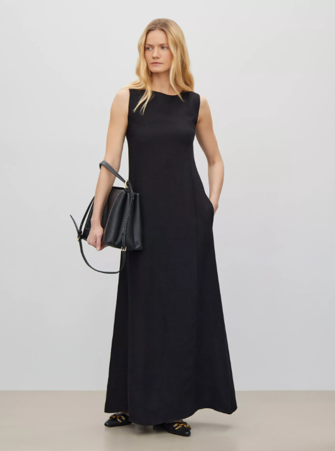 Лаконичное черное бренда EMKA из вискозы со льном — для независимых и самодостаточных. Очень простое спереди, она запоминается эффектной шнуровкой на спине. Достаточно скинуть пиджак, кардиган или жакет (а отсутствие рукавов облегчает подбор таких комплектов) — и скромный закрытый наряд превращается в вечерний вариант. Заказать платье можно на сайте, а совсем недавно бренд открыл свой офлайн-магазин в Нижнем Новгороде.