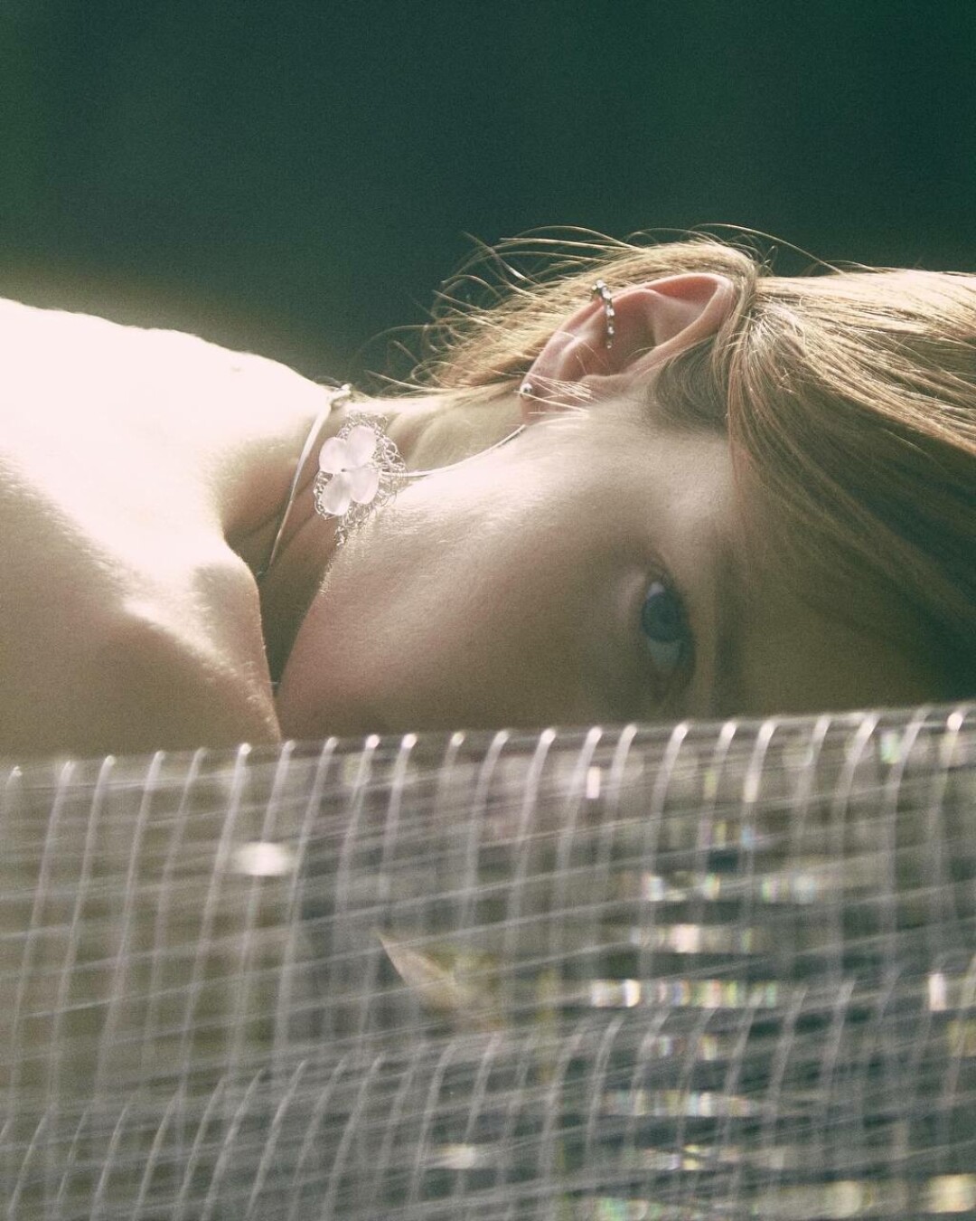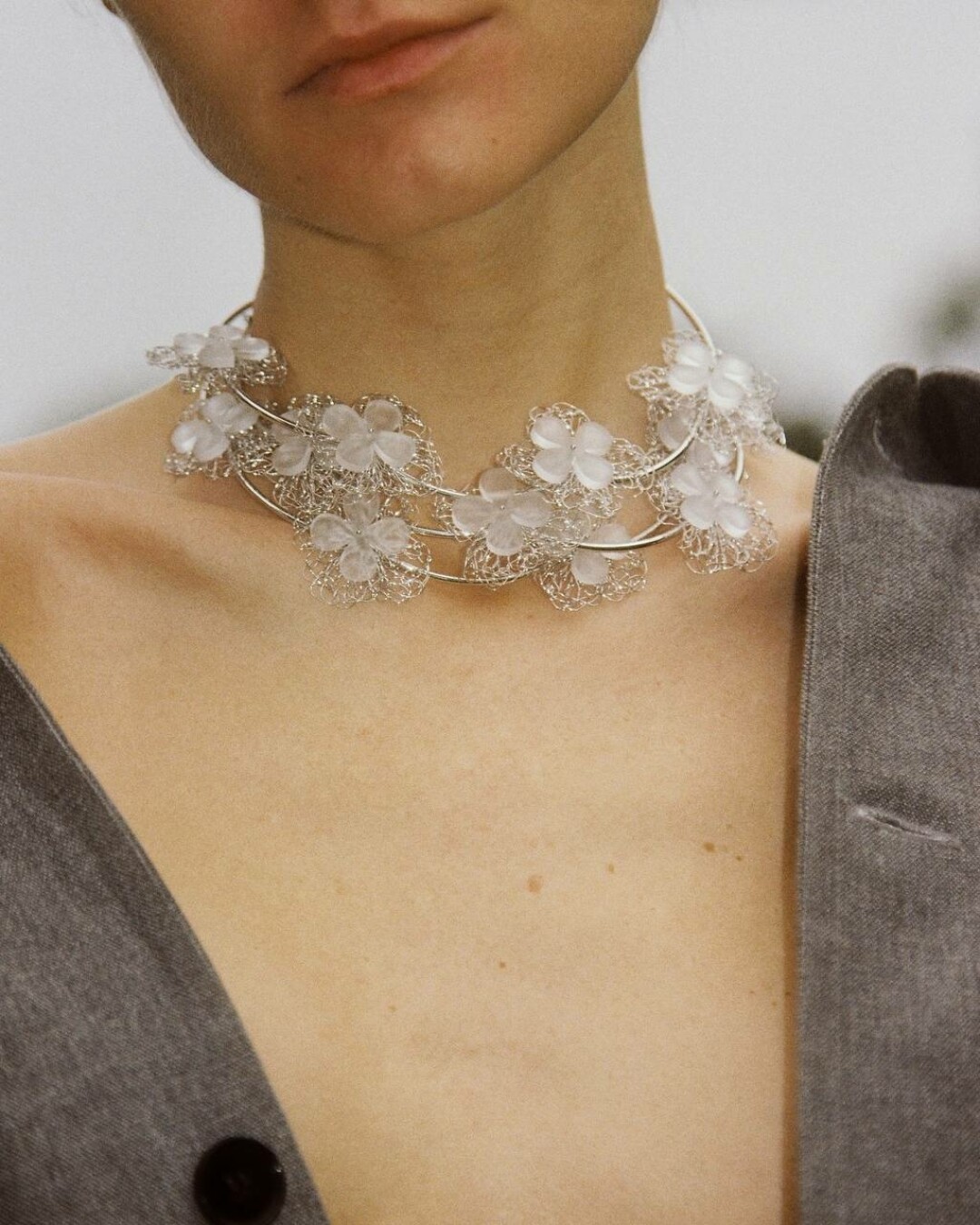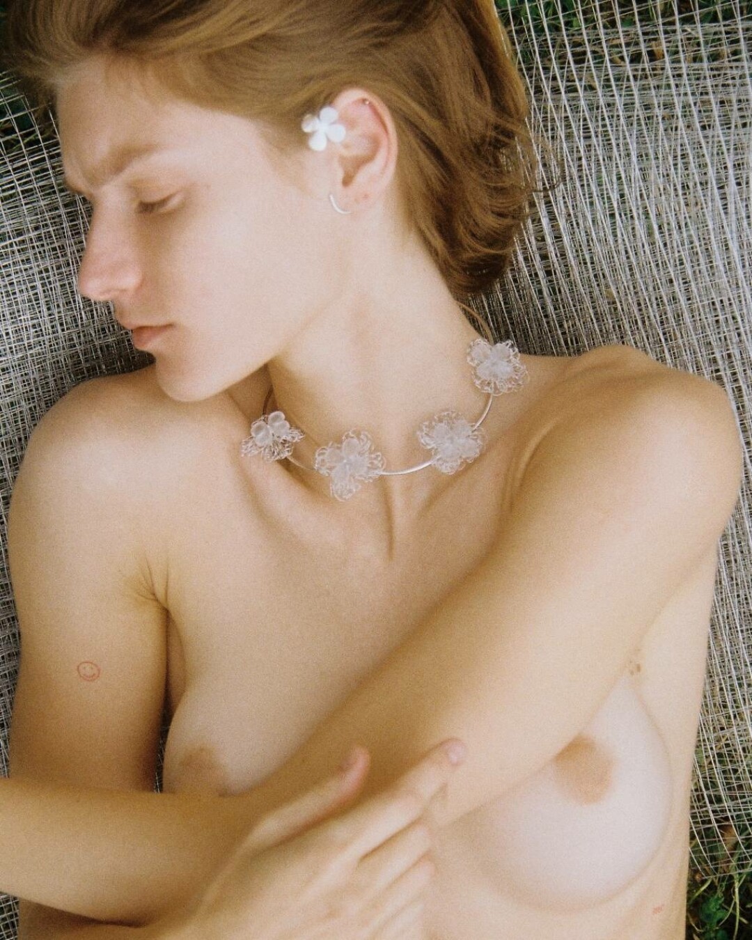 Ювелирные цветоводы из Петербурга Alvaar вместе с Варей Щербаковой-Литвяк (основательницей курса по вязанию крючком Love to knit) сочинили лимитированную коллекцию «Связанные цветы». Теперь фирменные четырехлистники из плексигласа располагаются на подложке из связанных из латунной пряжи копий. В +29 мечтаем, как героиня съемки, развалиться где-нибудь под деревьями Таврического — в чокере «Вязаный венок» и моносерьге и больше ни в чем!