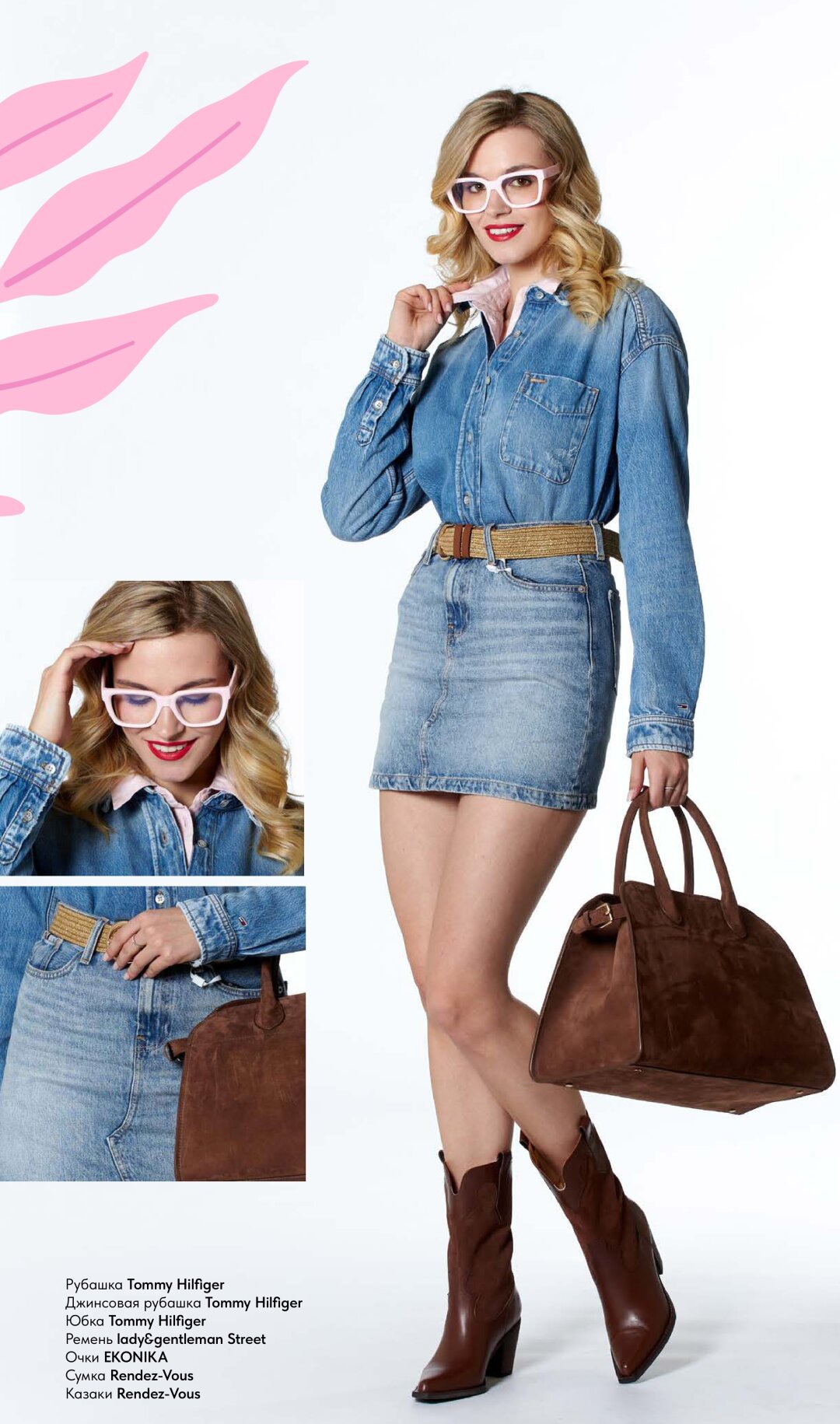 Сочетание на все времена: классическая синяя джинса с темно-коричневыми аксессуарами всех фактур. Добавим изысканности, сделав первым слоем бледно-розовую рубашку. А градус задора резко повышаем имиджевыми очками!