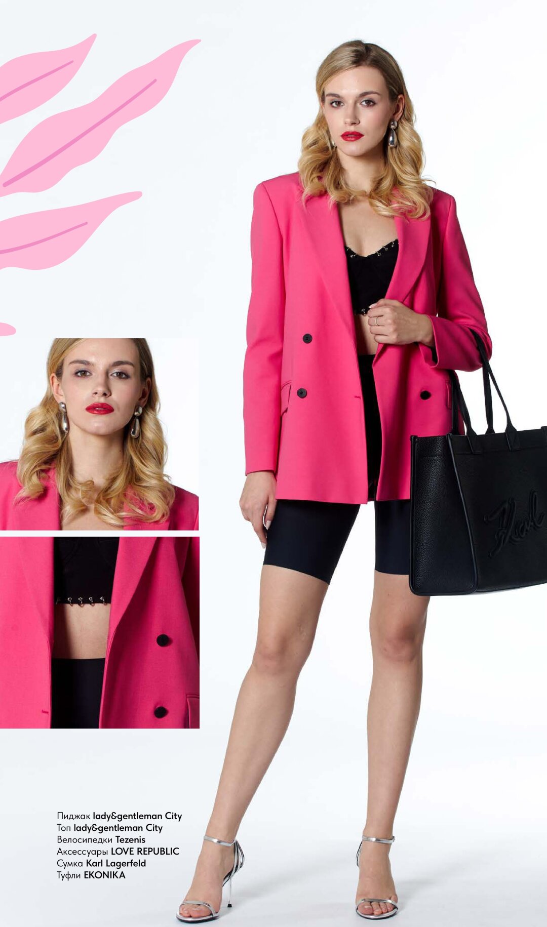 Немного от Барби, немного от эмо: кроп-топ с металлическими кольцами по нижнему канту, велосипедки и пиджак оверсайз цвета фуксии, шпилька, – и этот смелый образ сложно будет забыть.
