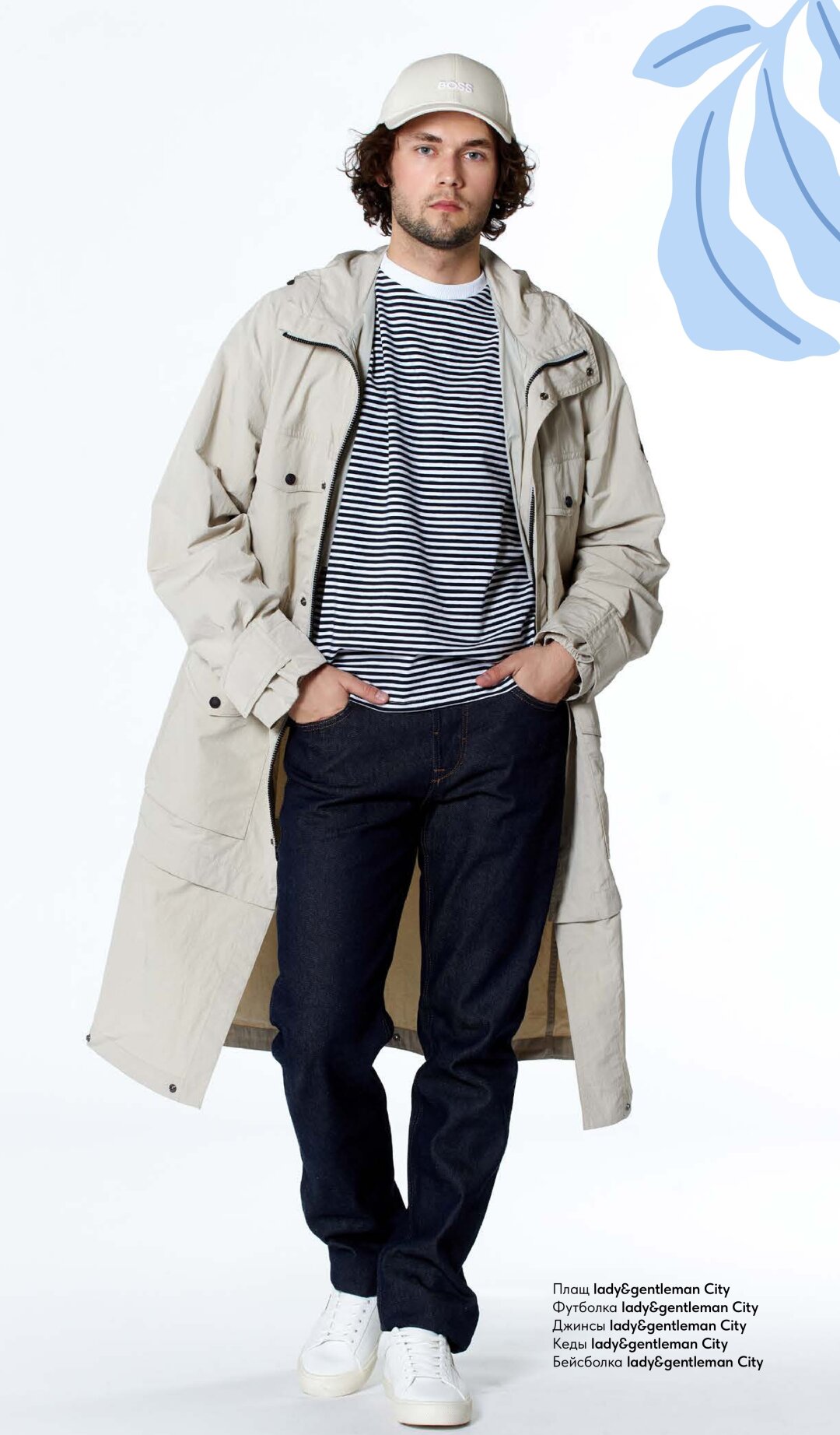 Прогулки с компанией, соло или любимой женщиной. В таком образе — готовность к любому варианту развития событий: свитшот в полосочку создаст динамику, тренч — чувство защищенности от ветра и внезапного дождя, а в случае форсмажора его можно накинуть на плечи любимой женщины.
