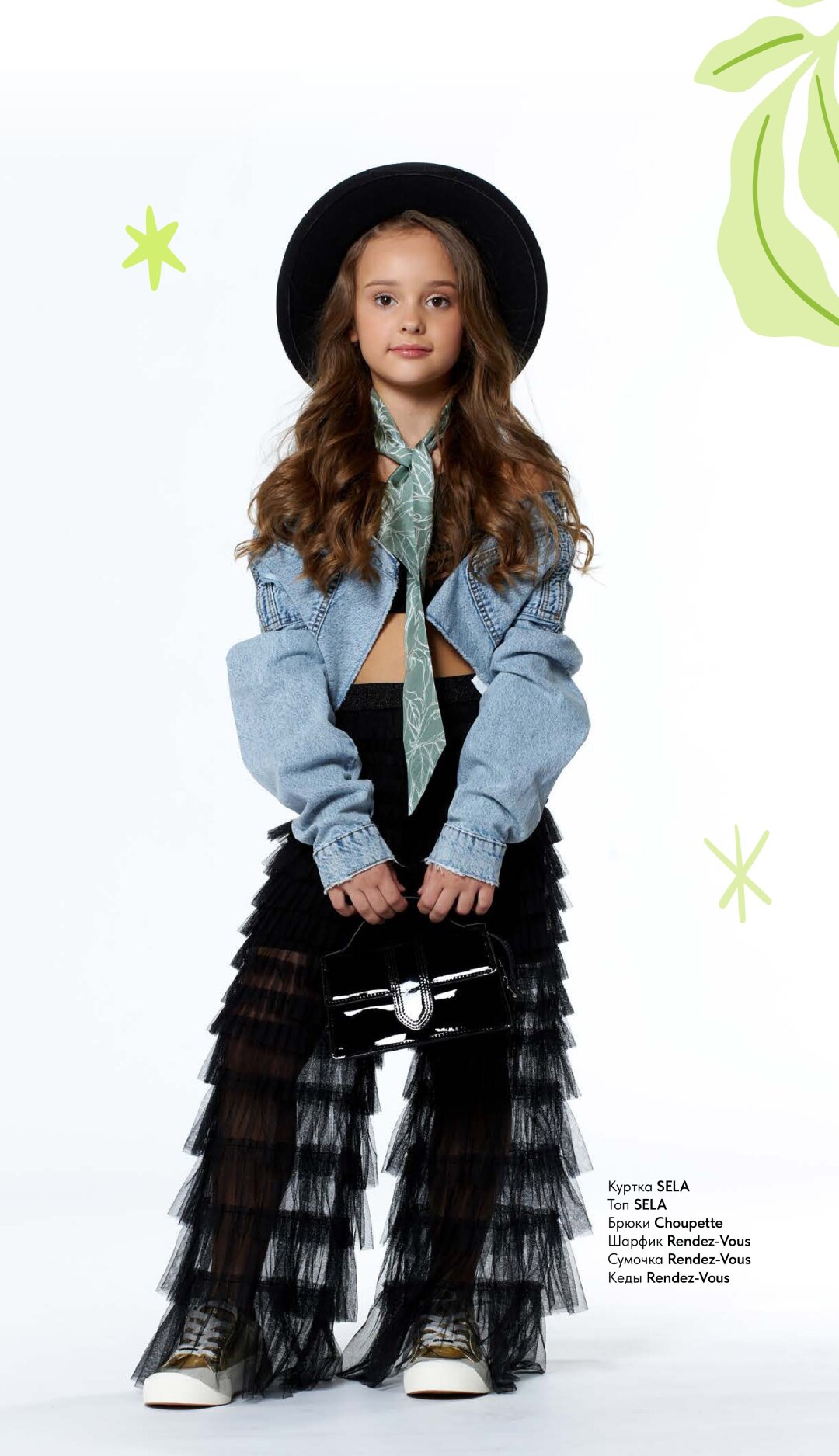 Первые светские выходы начинаются с выпускного в детском саду, продолжаются с первым звонком и не прекращаются, кажется, уже никогда. Пример яркого образа — вариация на тему ковбойских штанов из органзы с оборками, поддерживается косухой из денима и шляпой. Тот случай когда классика звучит молодежно и органично даже модницам младшего школьного возраста.