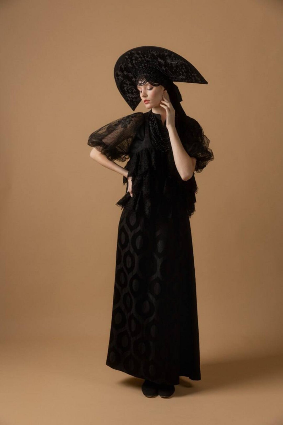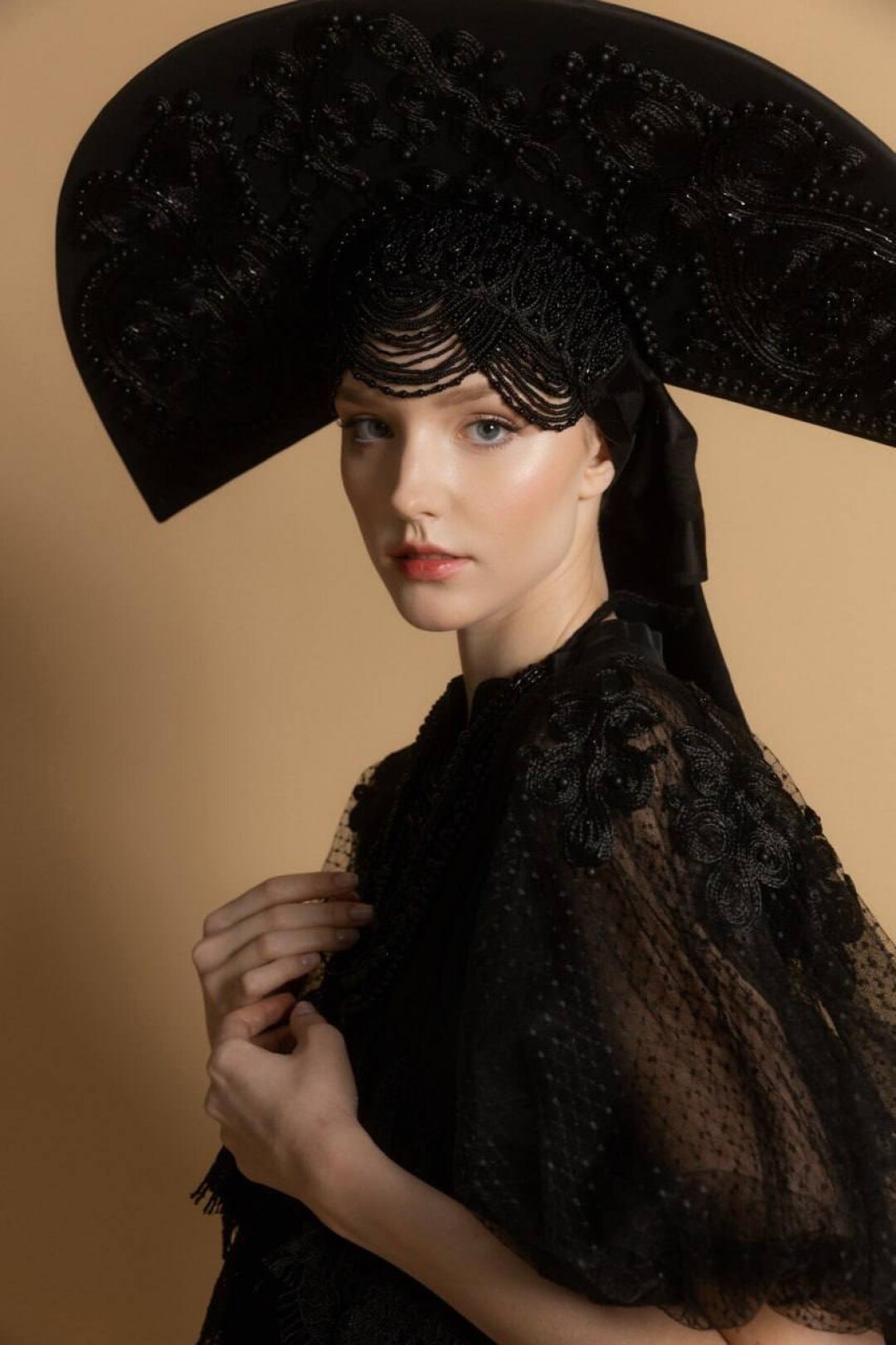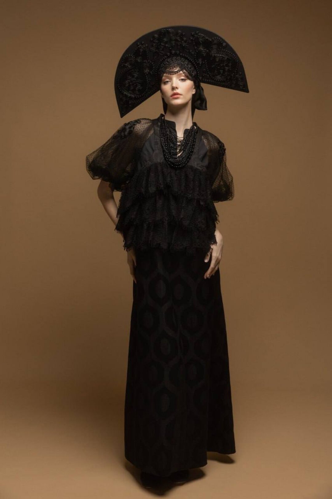 А что до титульного монохромного макси, тут вдохновились васнецовскими Сириным и Алконостом. Венчает образ царственный кокошник-лунник, от которого и произошло имя бренда: «Сейчас нам непривычны образы с головным убором, а раньше он был доминантой любого традиционного костюма. Вспомнив о важности элемента, который носят на макушке, и появилось название MA’КUSHКА».