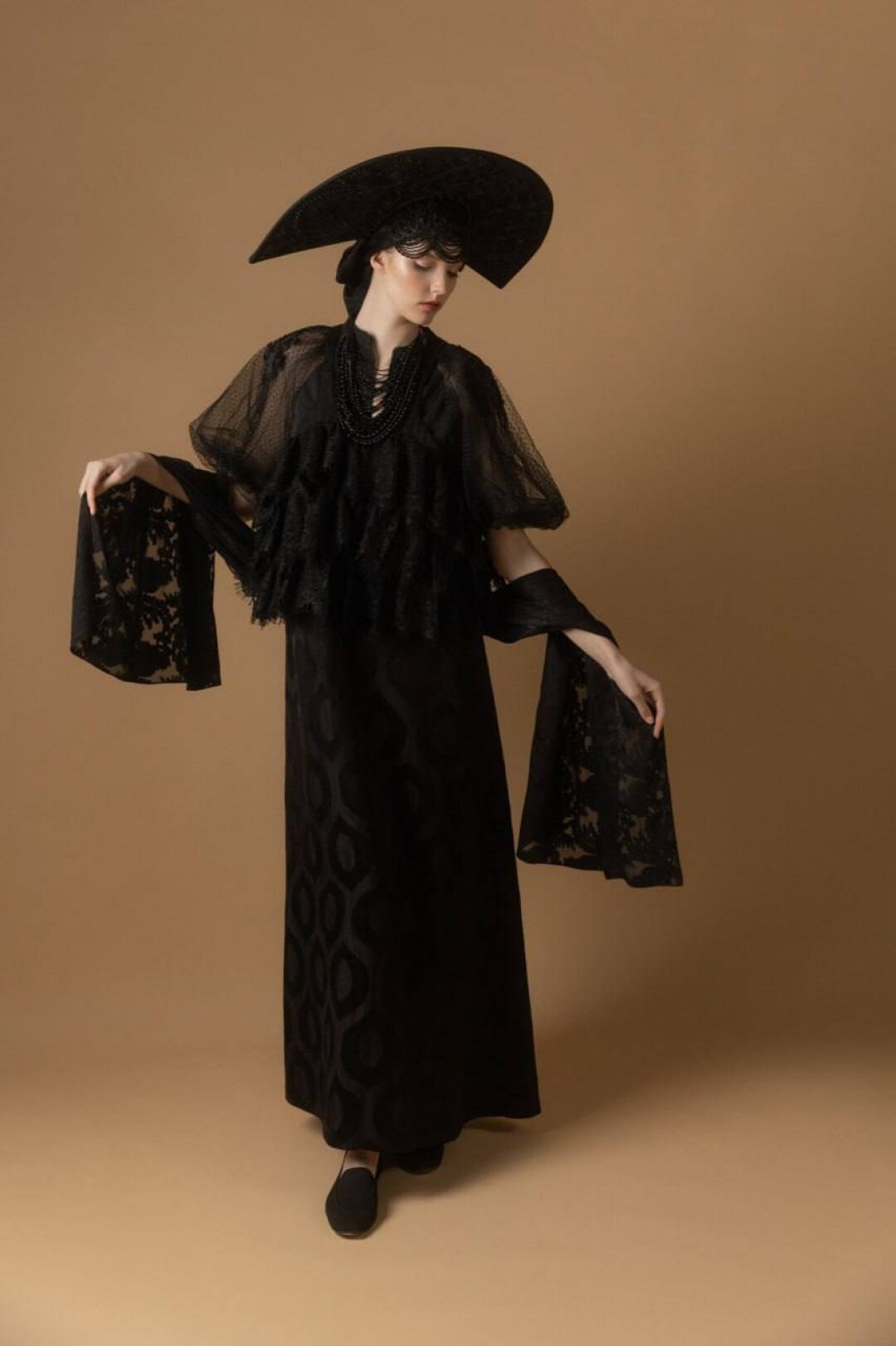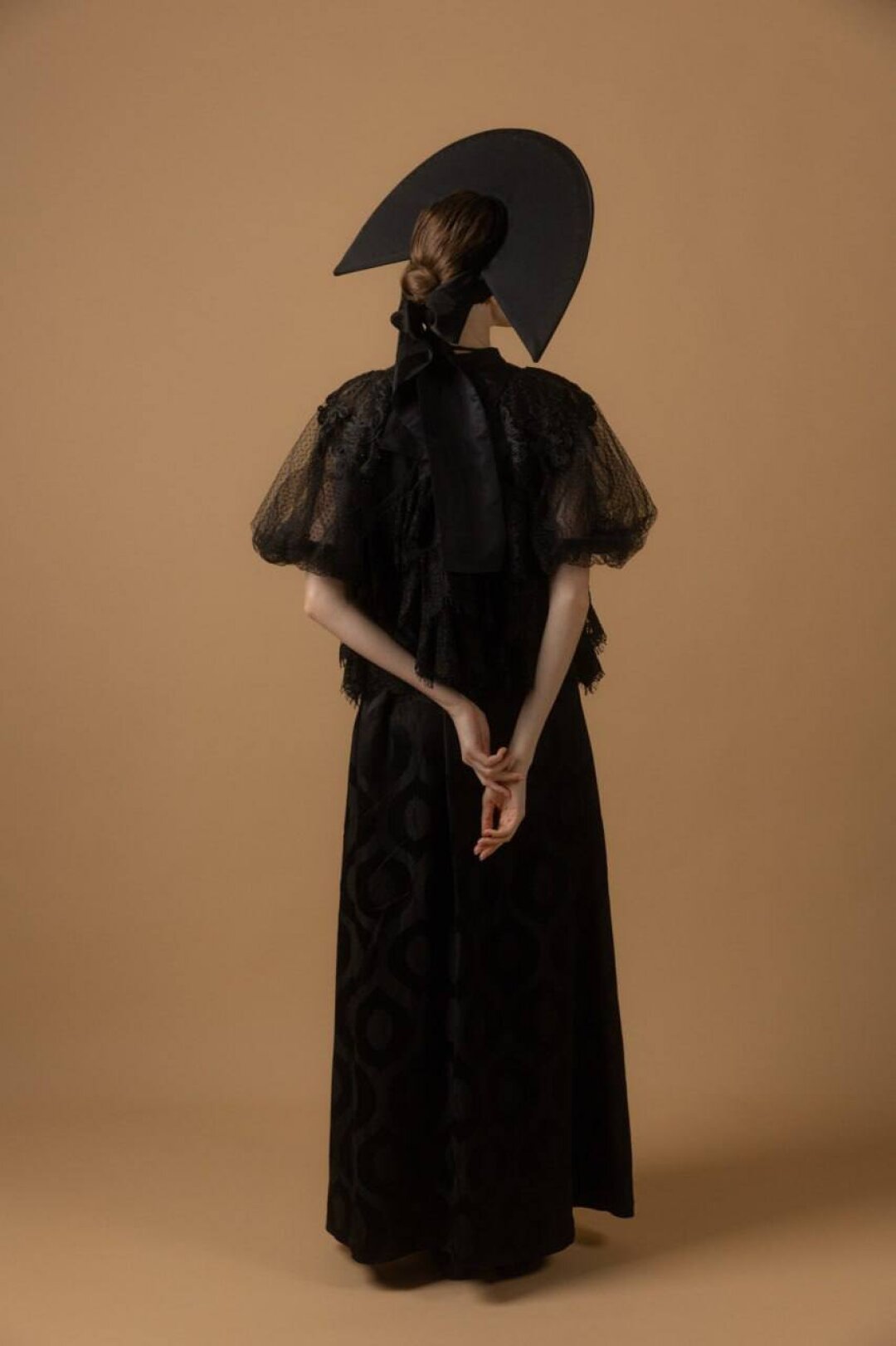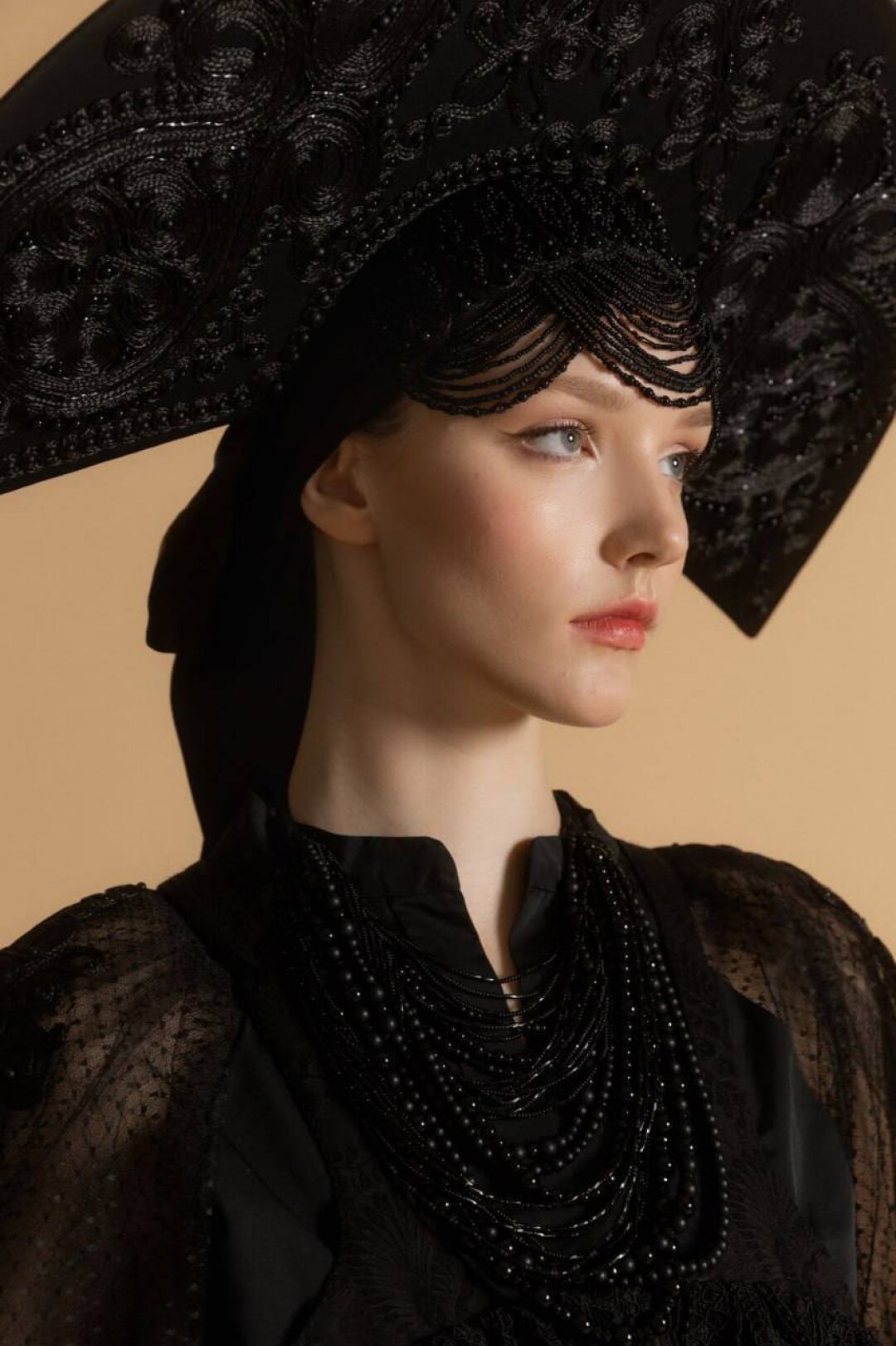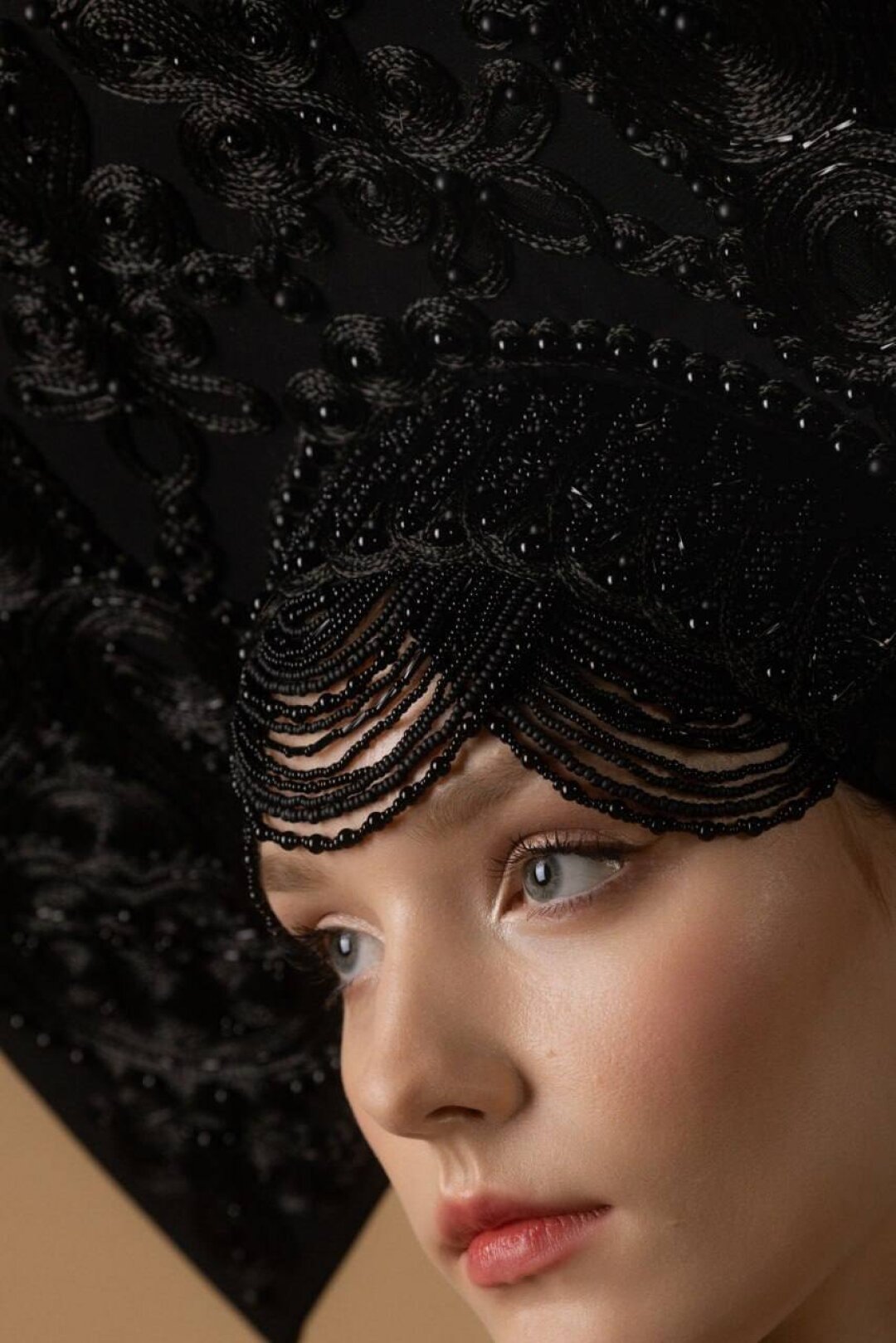 Оксана Кузнечикова: «Говоря о традиционном русском костюме, в первую очередь вспоминаются яркие пятна вышивки, лент и набивных тканей. Нам хотелось обратить внимание на силуэт и формы, а для этого лучше всего подходит черный. Этот цвет давно вне времени – тоже важный момент, когда показываешь традиции в современном прочтении. Решение делать костюм в монохроме стало не ограничением, а возможностью ярко показать фактуры и формы, игру света на глянцевых и матовых материалах. Черный черному – рознь. Мы точно знаем».