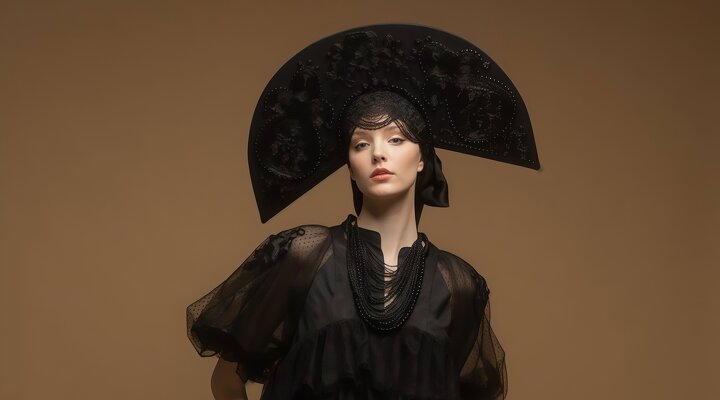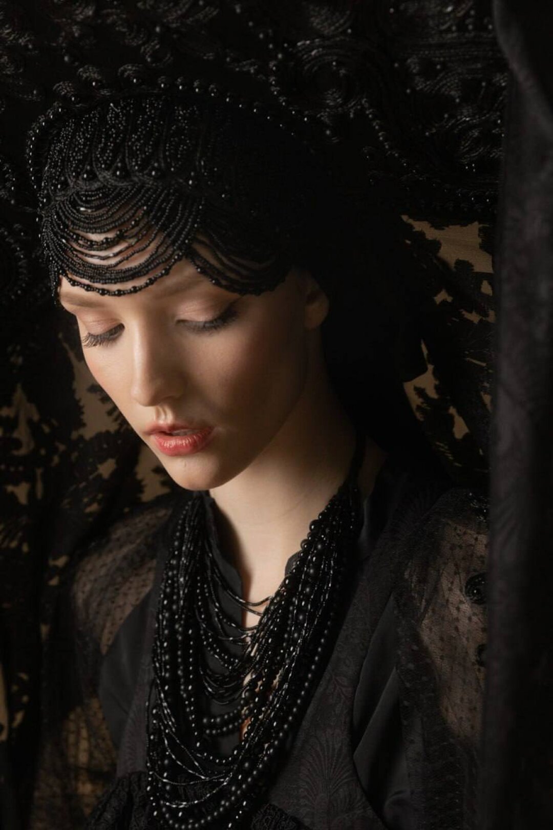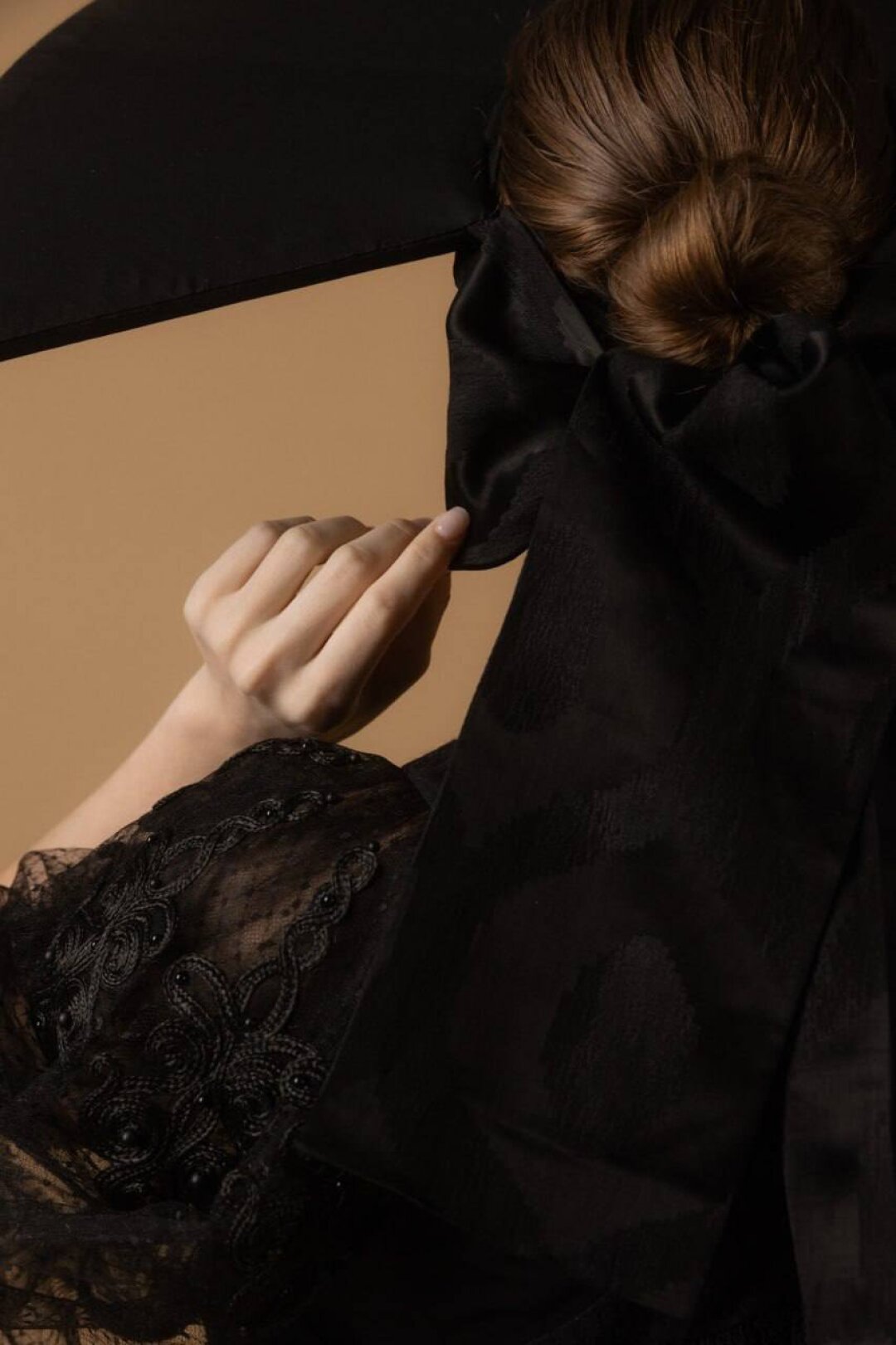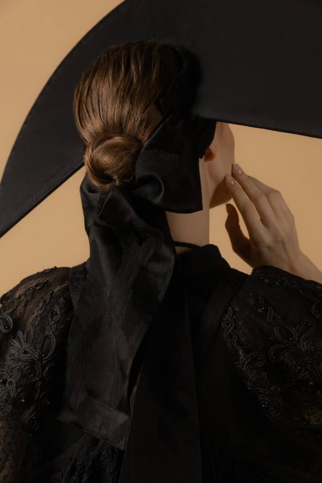 Оксана Кузнечикова: «Говоря о традиционном русском костюме, в первую очередь вспоминаются яркие пятна вышивки, лент и набивных тканей. Нам хотелось обратить внимание на силуэт и формы, а для этого лучше всего подходит черный. Этот цвет давно вне времени – тоже важный момент, когда показываешь традиции в современном прочтении. Решение делать костюм в монохроме стало не ограничением, а возможностью ярко показать фактуры и формы, игру света на глянцевых и матовых материалах. Черный черному – рознь. Мы точно знаем».
