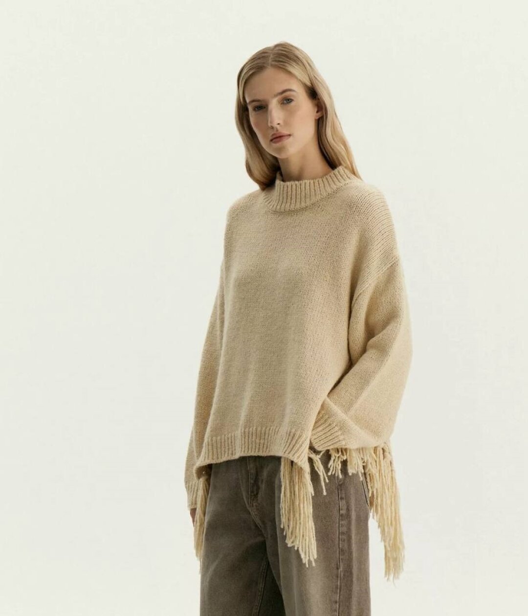 Джемпер с бахромой: игривость, динамика и основа для стилизаций в стиле бохо (дополняем замшей и терракотовыми аксессуарами) или вестерн (кожа, деним и ультрамодные этой осенью казаки).