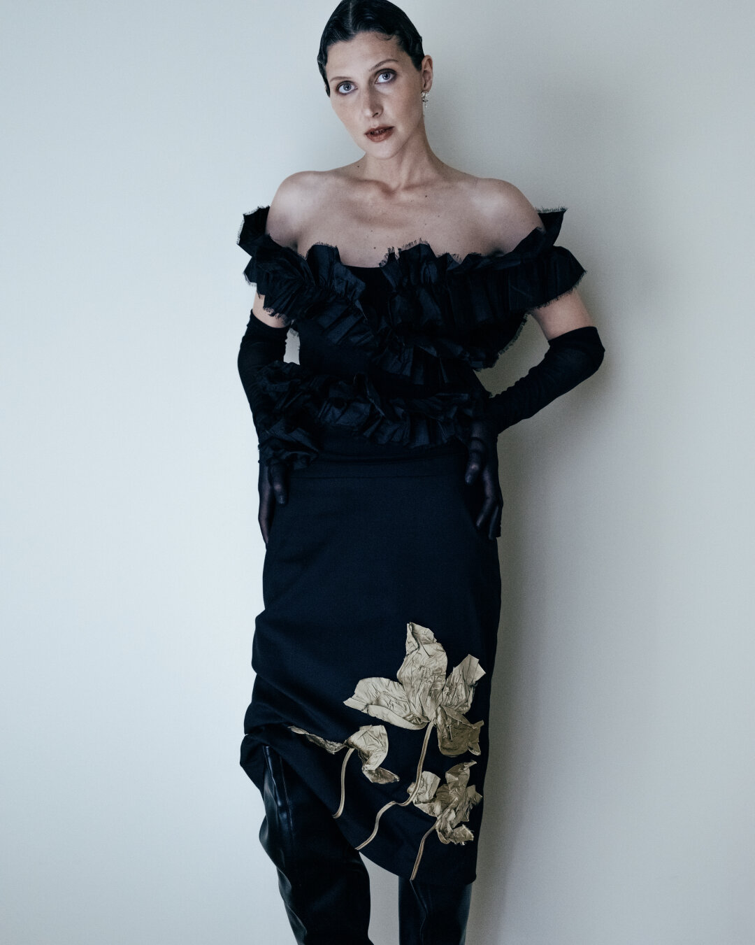 ITEM – это место для вдумчивых и стильных людей. Существовать в вакууме невозможно, нам нужен диалог с сильными и «непопсовыми» локациями. Поп-ап – это не просто точка продаж, а живое общение, возможность проверить, насколько наша философия и дизайн откликаются у аудитории. Мы знакомили ее с нашей новой коллекцией через тактильный опыт: когда человек может примерить вещь, почувствовать ткань, пообщаться с нами лично – это создает гораздо более глубокую связь. Коллекция называется «Предчувствие бала»: это не та классическая «Гапанович-форма», к которой все, возможно, привыкли, а ее праздничная, театральная ипостась. Мы отобрали вещи, которые полностью раскрывают эту концепцию: вещи с блеском и стразами, например рубашки с вышивкой пайетками или пушистые блузы с мерцающей нитью. Глубокие «зимние» цвета – бордо, изумруд, темный сапфир добавляют им внутреннего свечения, как огни ночного города на снегу. Мы хотим показать, что «русскость» – это не только гимнастерки и рабочая романтика, но и блеск императорских балов, театральные подмостки, дворянская роскошь, которую мы переосмыслили в современном ключе.