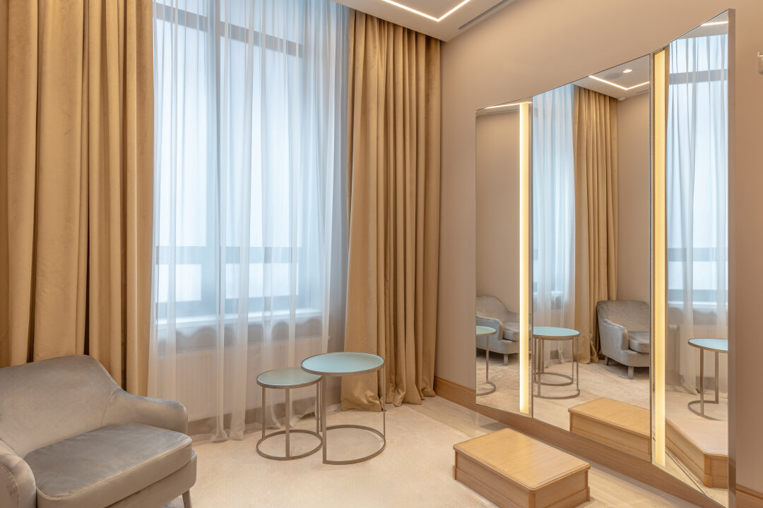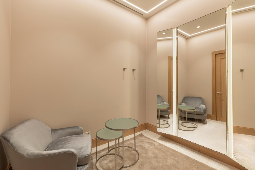 Огромные зеркала и профессиональное освещение в четырех просторных примерочных позволяют не просто оценить общий вид, а рассмотреть фактуру тканей и детали, которыми богаты актуальные коллекции.