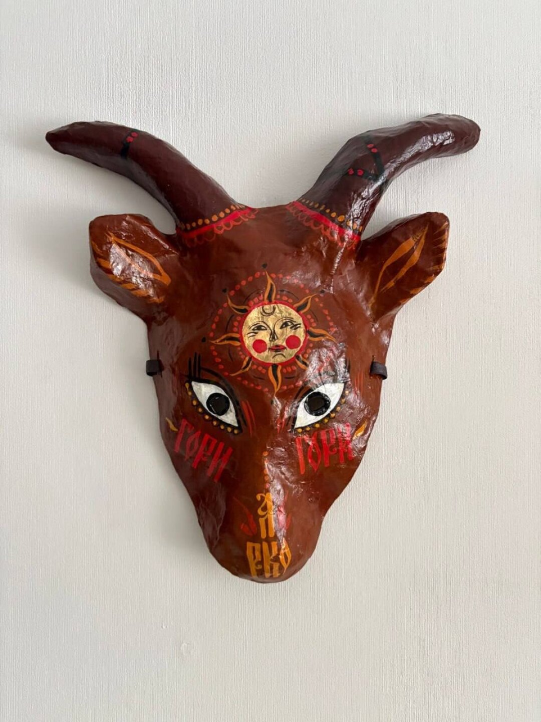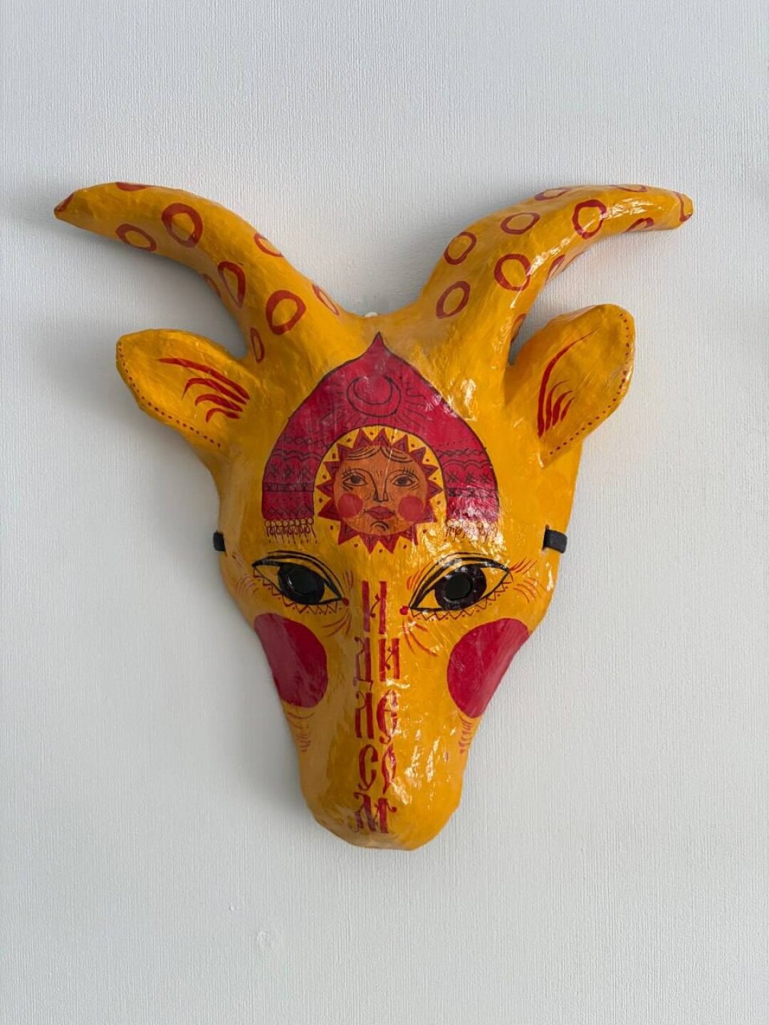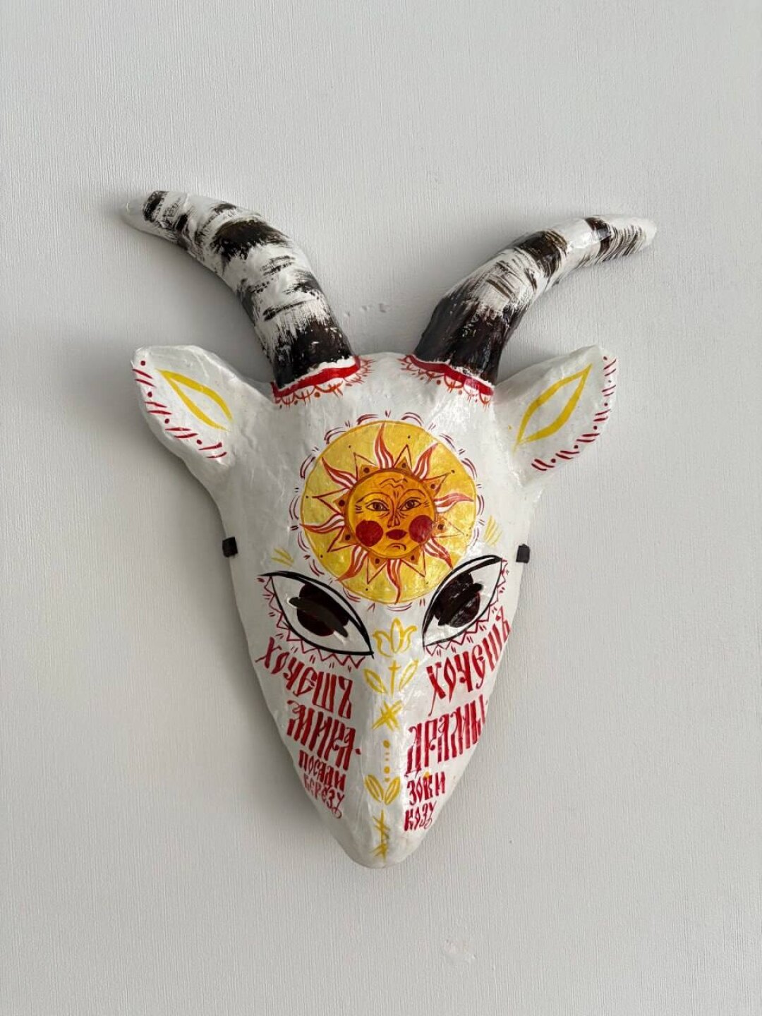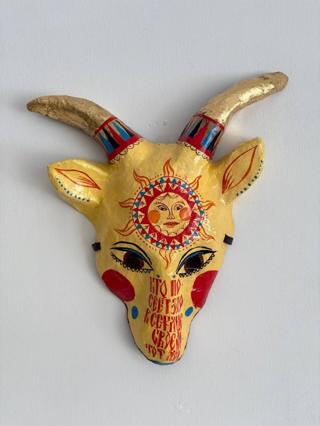 В росписи шести козьих личин из папье-маше нашли солнце в кокошнике, березы, а также разные мотивационные установки и мудрости, выведенные славянской вязью: «Иди лесом», «Гори-гори ярко», «Хочешь мира – посади березу, хочешь драмы – зови козу».
