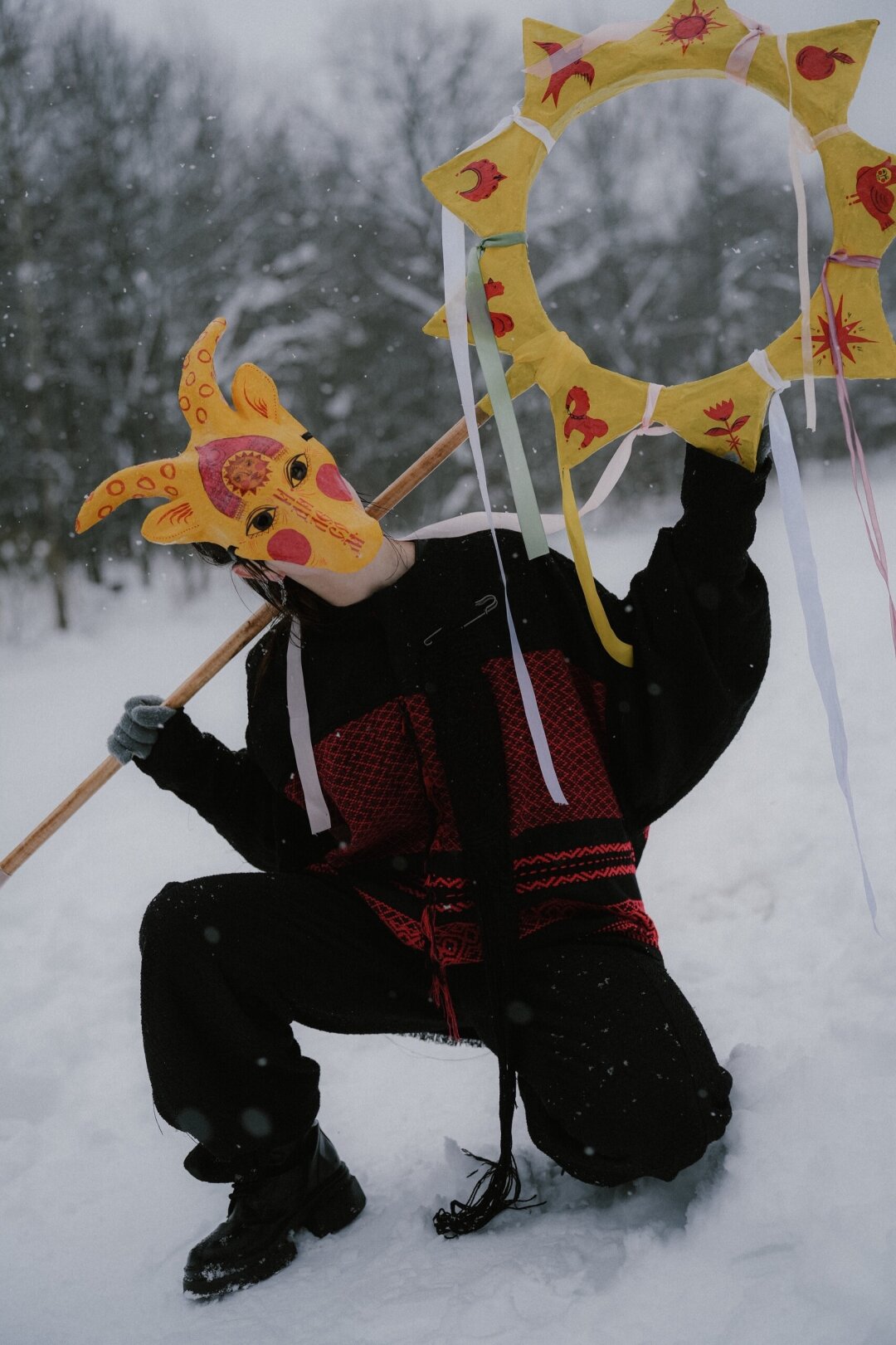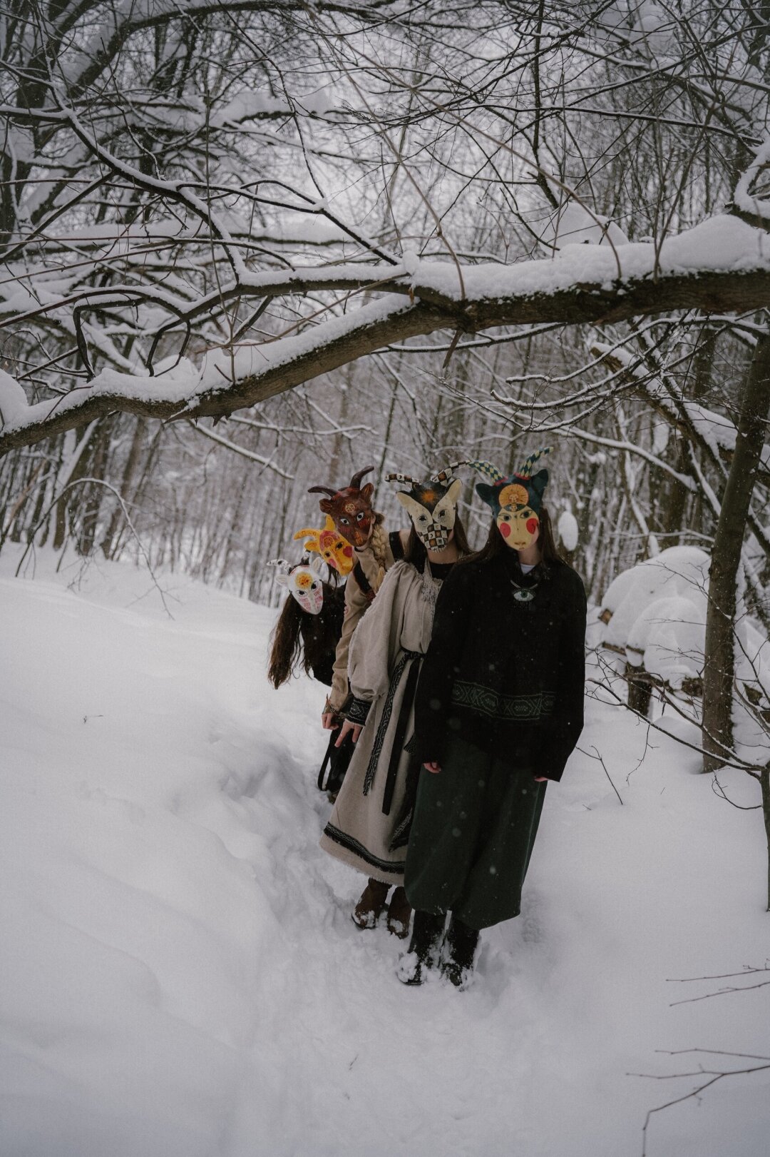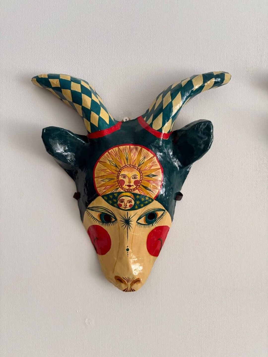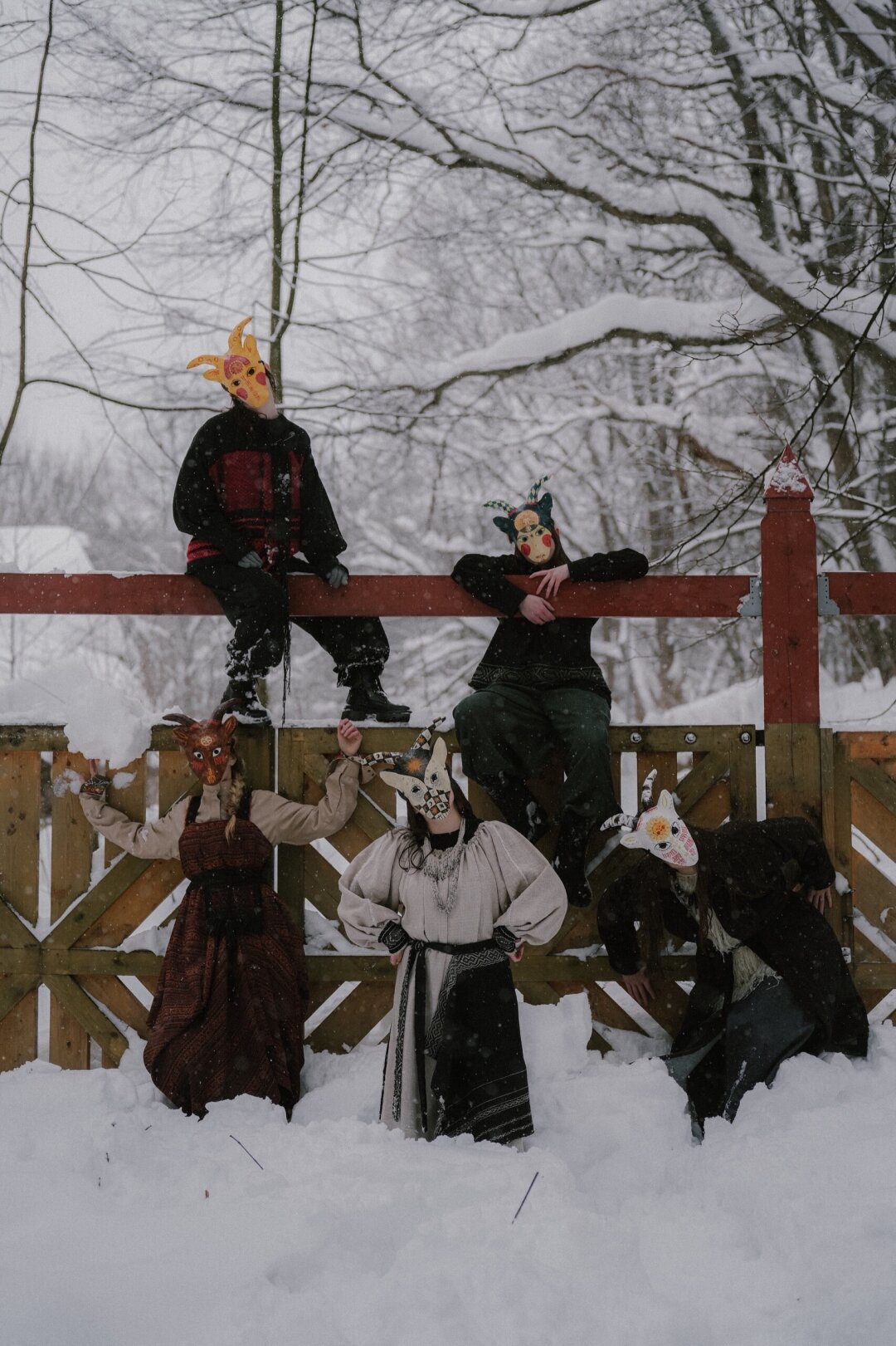 В росписи шести козьих личин из папье-маше нашли солнце в кокошнике, березы, а также разные мотивационные установки и мудрости, выведенные славянской вязью: «Иди лесом», «Гори-гори ярко», «Хочешь мира – посади березу, хочешь драмы – зови козу».