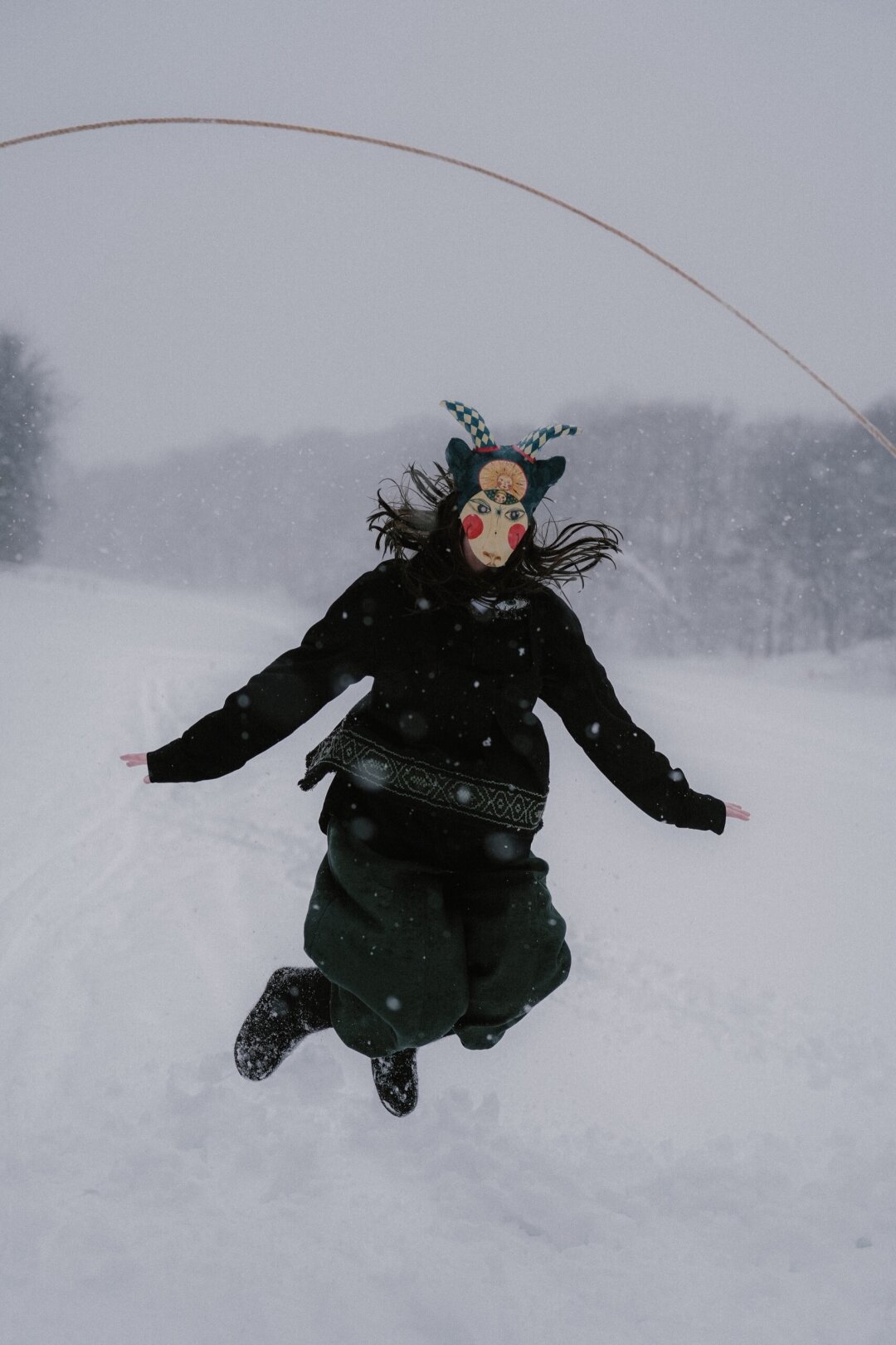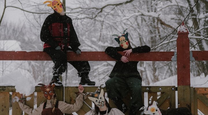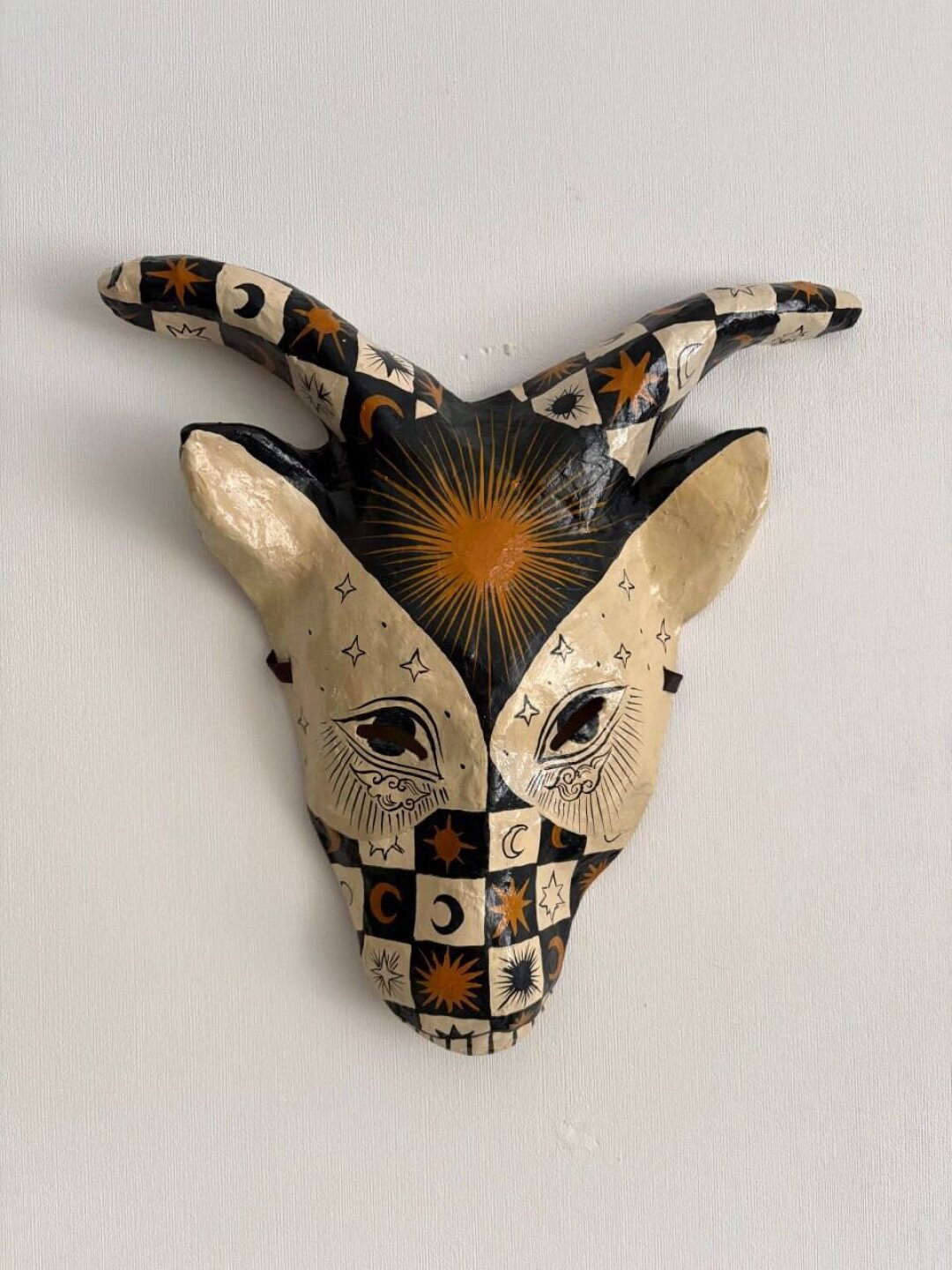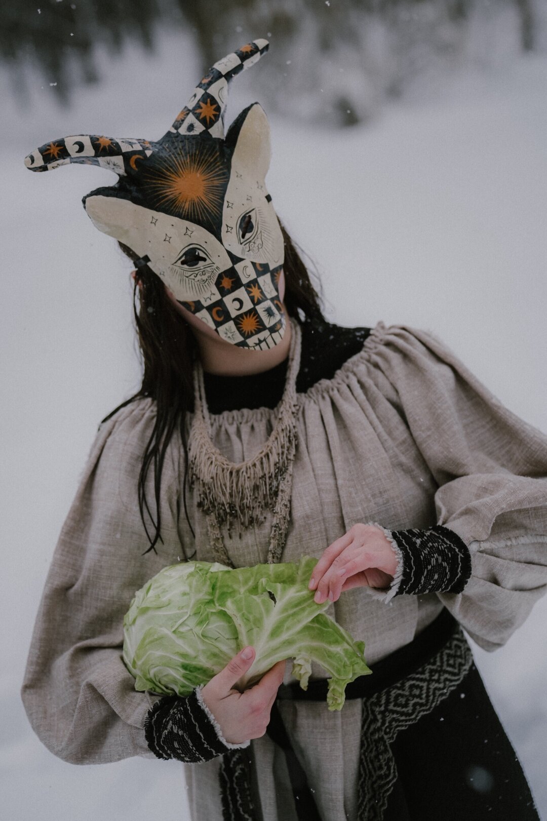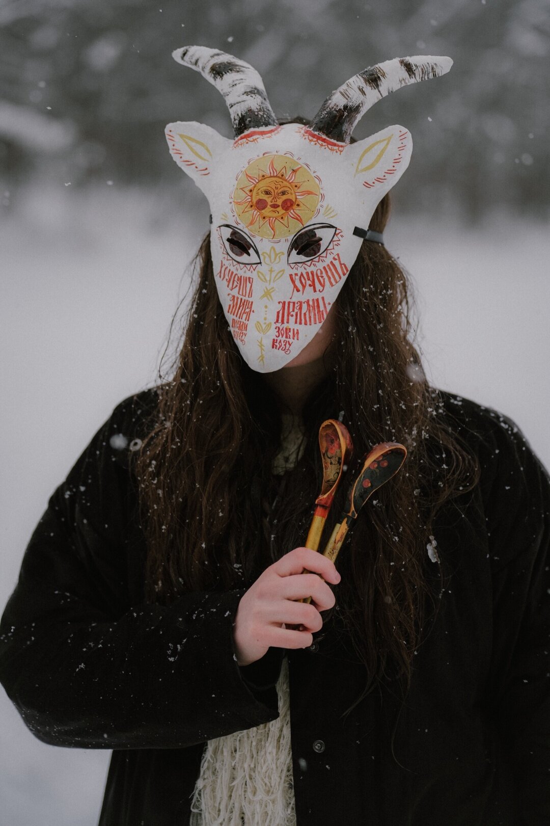 Чтобы изготовить маску, Александра делает форму из скульптурного пластилина или картона, на которую по слоям наклеивает небольшие кусочки бумаги. После высыхания – грунт, роспись темперными красками и лак. Веселые козы уже отметились в фотопроекте с брендом одежды Kichka, посвященном традиции колядования. А в прошлом году похожие рогатые появлялись на съемке для проекта авторской бижутерии «НечегоНадеть».