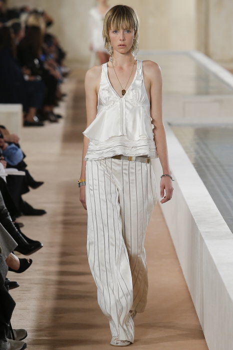 Как и всегда, в коллекции Celine представлены только вневременные вещи: в таких можно выглядеть одинаково современно что сейчас, что через пять лет. Желанными вмиг стали платья-комбинации, пальто с широким поясом-корсетом и простые платья с рукавами-фонариками. Что касается обуви, то здесь Файло продолжает экспериментировать с уродливо-очаровательными моделями: в этом сезоне опыты вылились в плетеные туфли, напоминающие о казаках и челси с прямоугольным носом.