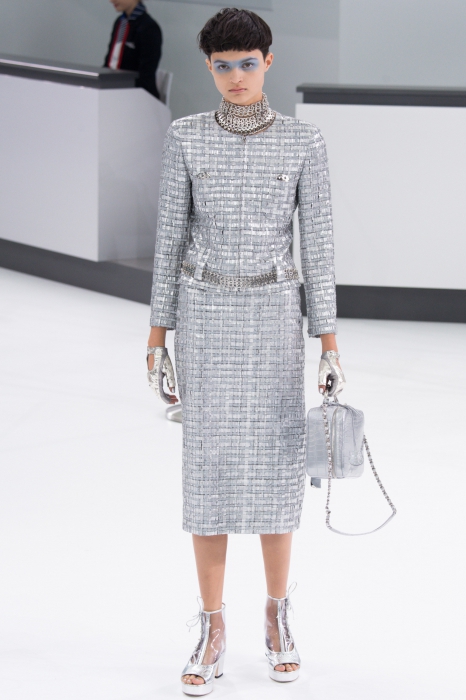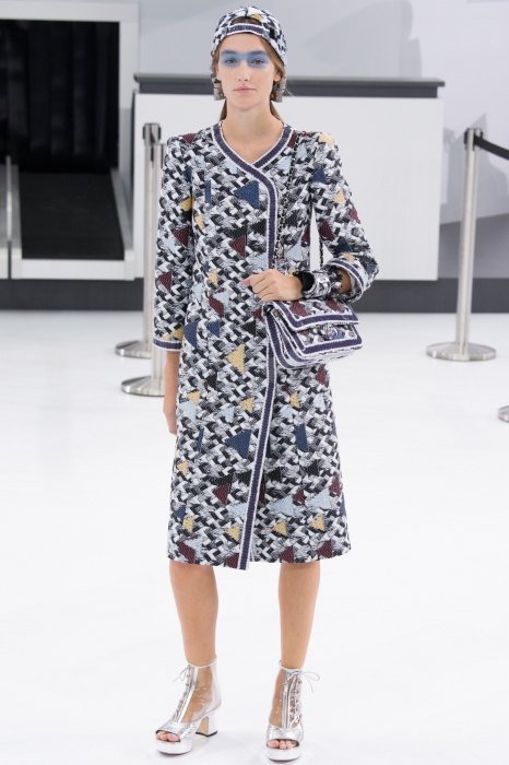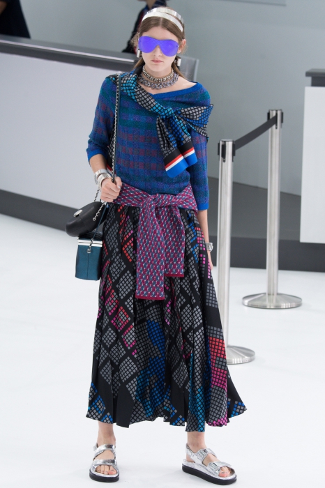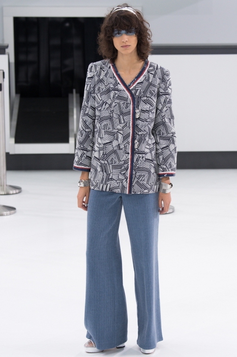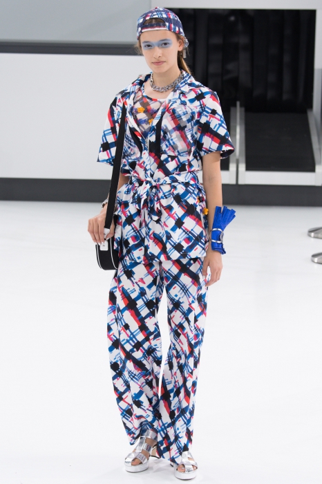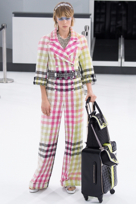 Карл Лагерфельд уже делал площадками для своих шоу супермаркет, брассерию и казино. В этот раз Chanel превратили Гран Пале в терминал аэропорта. Чтобы увидеть шоу, нужно было показать свой билет, пройти паспортный контроль на стойках регистрации и получить посадочный. Коллекция продолжала воздушную тему: броши в виде самолетов, очки и макияж, имитирующие повязку для сна, и, главное, комфортные вещи для перелетов: юбки-брюки, широкие штаны, твидовый жакет, который теперь можно повязать на поясе, бейсболки и суперудобные светящиеся в темноте сандалии на липучке. Вожделенным маст-хэвом коллекции должна стать крошечная сумка, выполненная в форме дорожного чемодана Chanel.