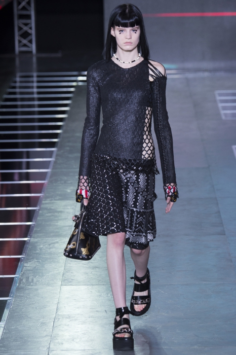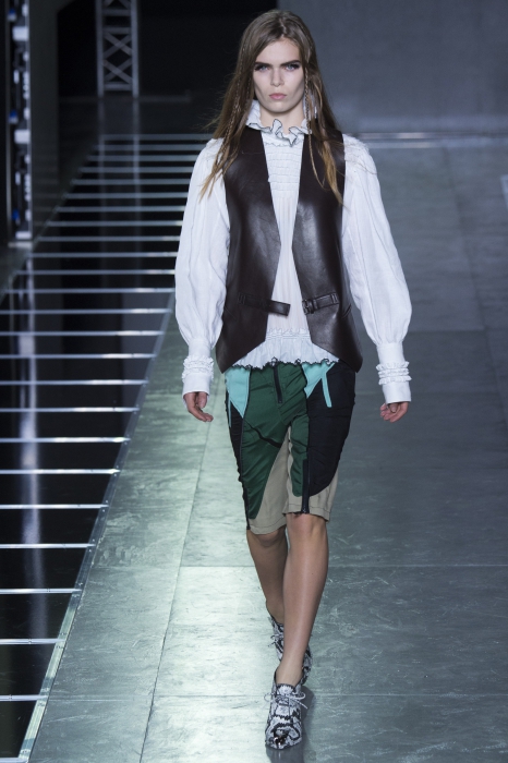 Последний день Paris Fashion Week начался с показа Louis Vuitton. Шоу прошло в музее Foundation в стеклянном паруснике, который построил Фрэнк Гери на опушке Булонского леса. Дизайнер Николя Гескьер продолжает гнуть свою тему футуризма, только в этом сезоне к нему добавился киберпанк: шоу открыла Фернанда Хин-Лин-Лай с розовыми волосами и кожанкой в тон. Также из будущего пришли майки из технологичной сети, комбинезоны из как будто сожженного денима, юбки со сложным кожаным плетением и жилеты с монограммой, который дизайнер стилизует с блузами и платьями в викторианском стиле.
