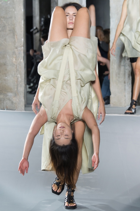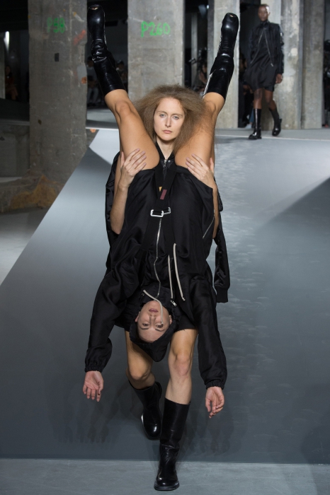 Рик Оуэнс уже выводил на подиум мужчин без белья и отряд танцовщиц плюс-сайз. Новая выходка — рюкзаки из женщин: дизайнер превратил моделей в живые аксессуары. После Оуэнс объяснил, что хотел показать, как нелегко приходится современным женщинам и как часто они помогают друг другу: «Женщины воспитывают женщин, женщины становящиеся женщинами, женщины поддерживающие женщин — все это мир женщин, о котором я имею достаточно смутное представление».