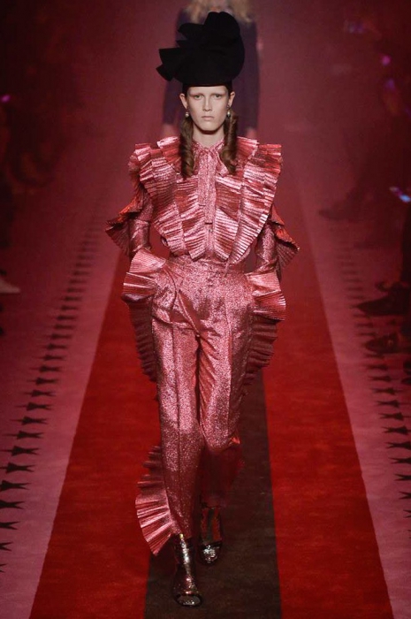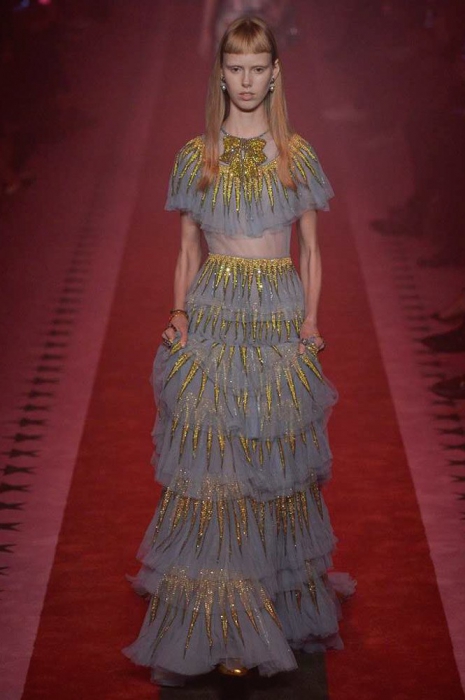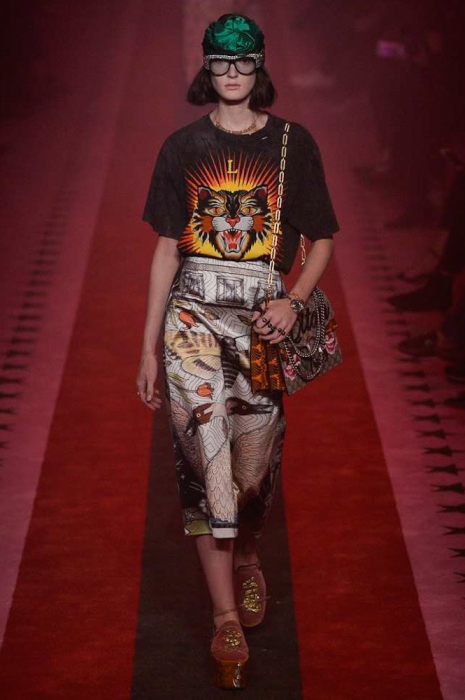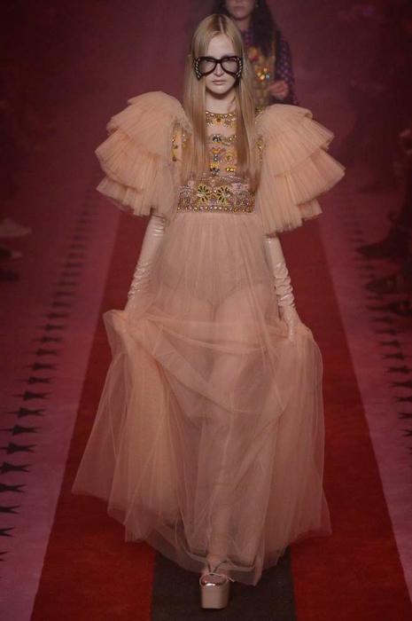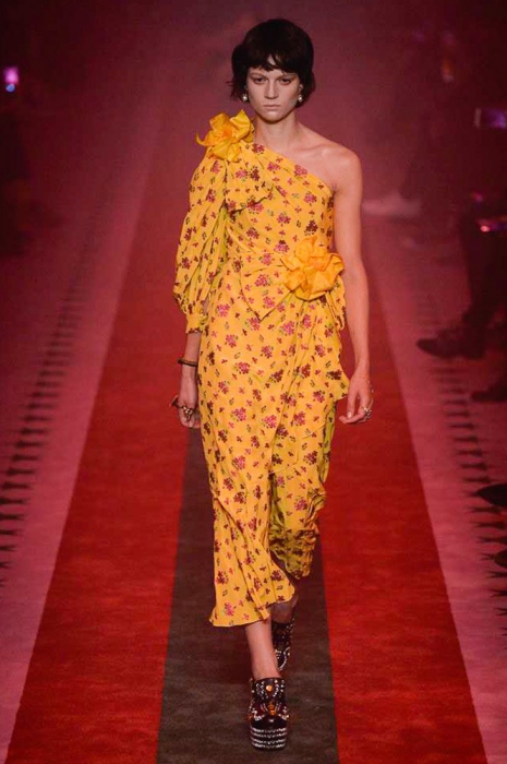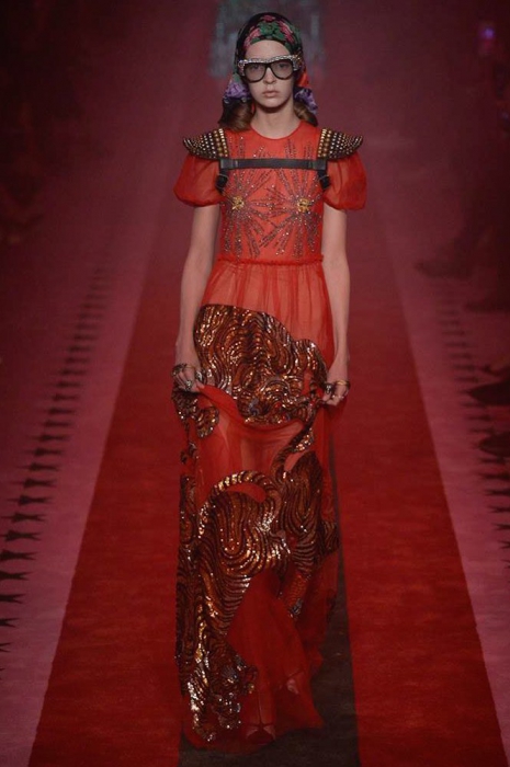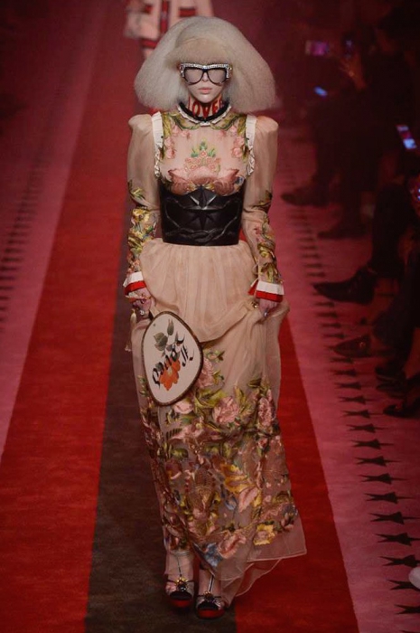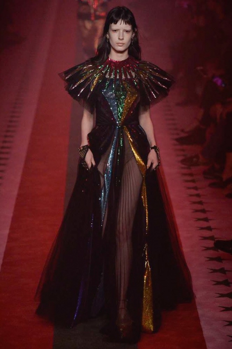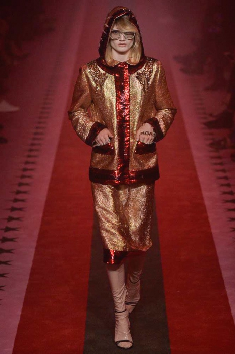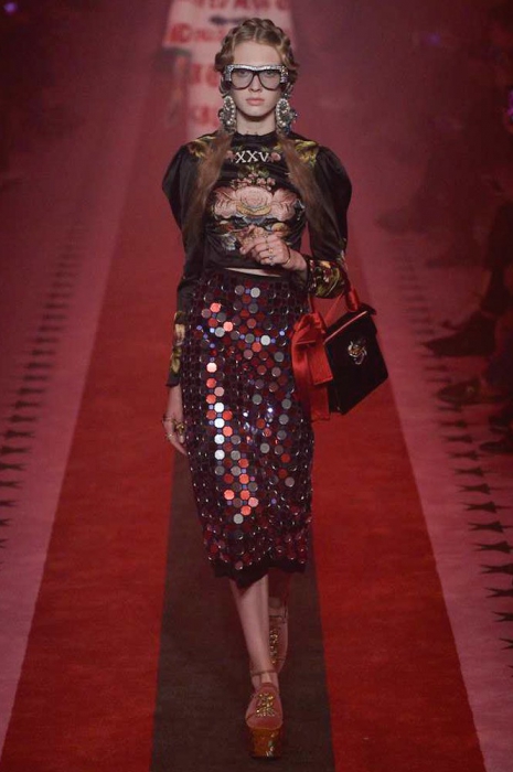 В весенне-летний сезон перешли и трикотажные комплекты, и цветочные платья в пол, но кроме них в вещах считаются еще с десяток кодов. От готической культуры коллекции достались черные шифоновые платья, кейпы и кожаные корсеты, от восьмидесятых — сверкающие мини, розовые костюмы в пайетках и блузы с объемными плечами, от двухтысячных — тысячи страз, например, на оправах очков.