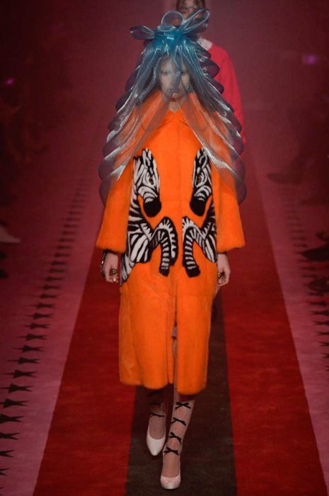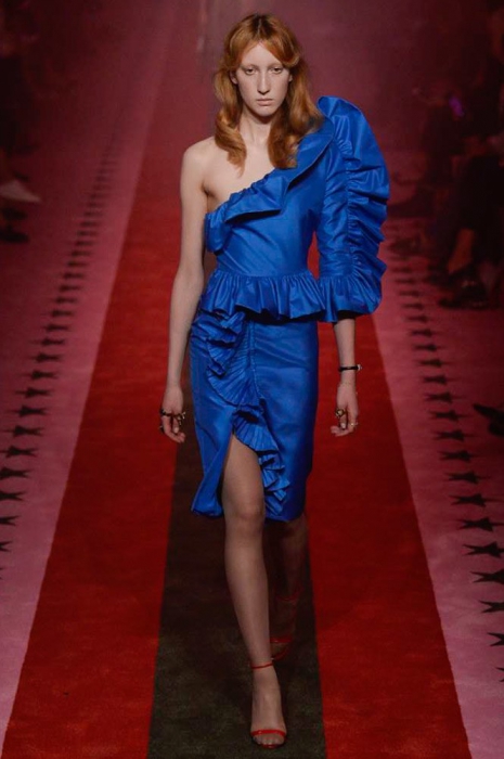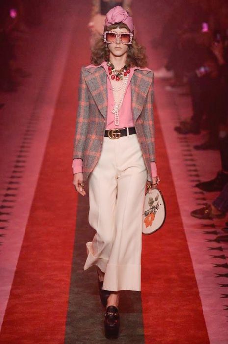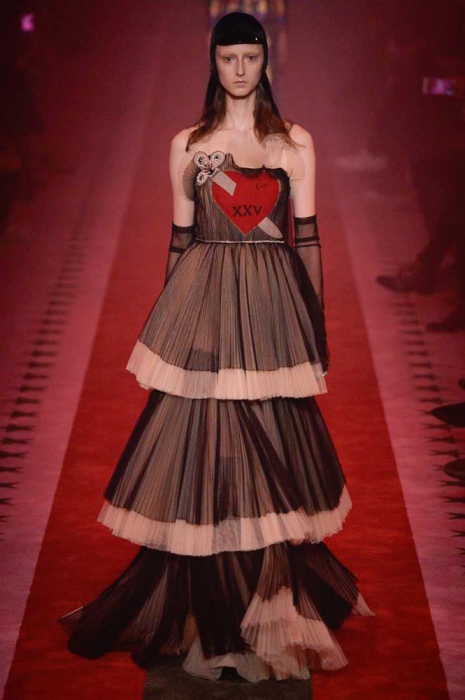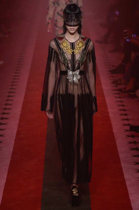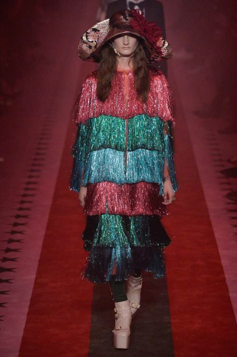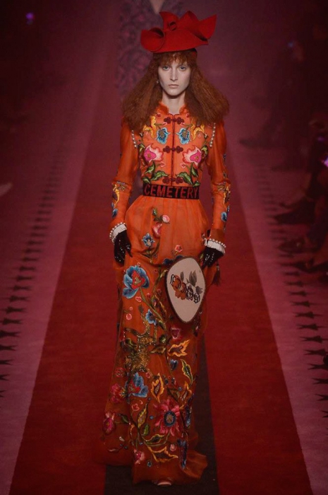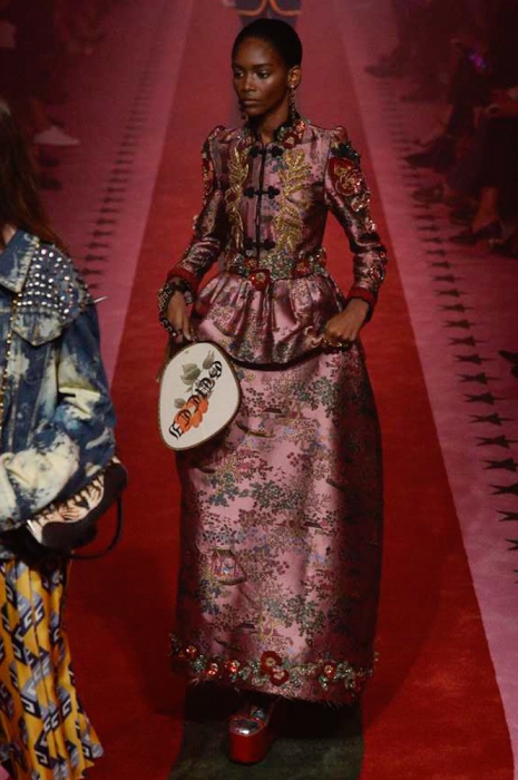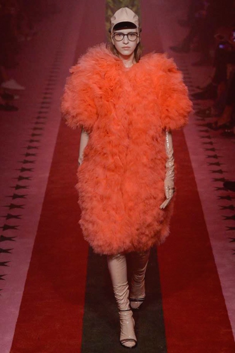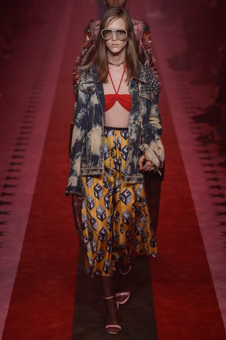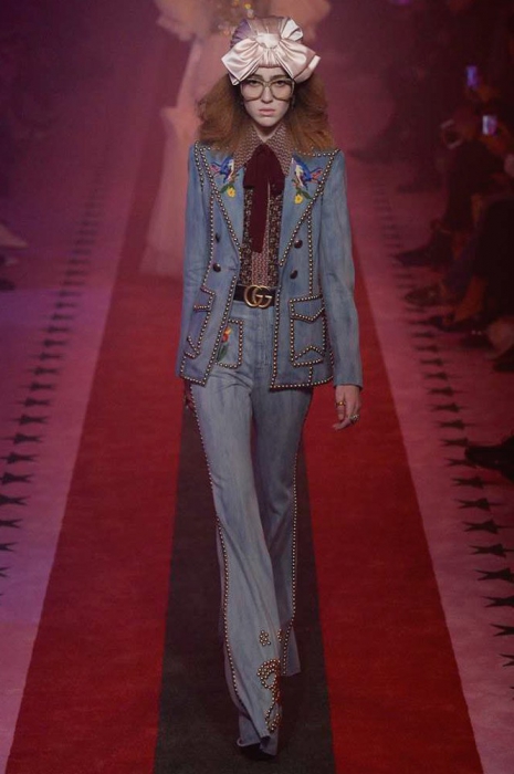 В весенне-летний сезон перешли и трикотажные комплекты, и цветочные платья в пол, но кроме них в вещах считаются еще с десяток кодов. От готической культуры коллекции достались черные шифоновые платья, кейпы и кожаные корсеты, от восьмидесятых — сверкающие мини, розовые костюмы в пайетках и блузы с объемными плечами, от двухтысячных — тысячи страз, например, на оправах очков.