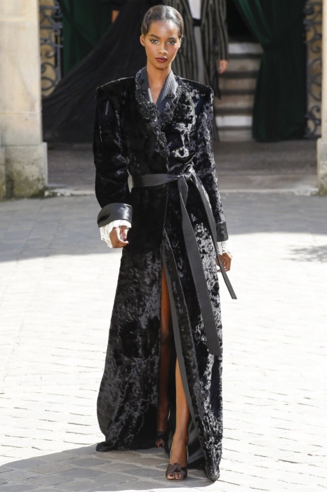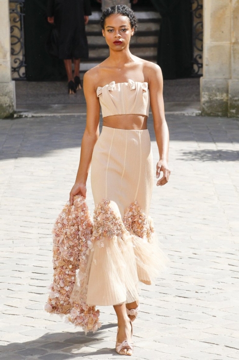 Для своеобразной игры в мафию дизайнер выбрала закрытый двор Лицея Генриха IV, и, чтобы отдать дань моде эпохи Бурбонов, сделала вторую часть показа более светлой и торжественной. Черные костюмы из плотных тканей сменили любимые Ульяной инфантильные платья-рубашки с цветочным принтом, полупрозрачные юбки с надетым под них боди, а также коктейльные платья с корсетами. Образы хотя и отвечали сегодняшним трендам на бахрому, открытые плечи, оборки и легкую ткань, больше делали крен в ретро-стилистику. Как призналась Ульяна за несколько дней до презентации, в процессе подготовки новой коллекции она обращалась к архивным снимкам своих бабушек, которые вдохновили дизайнера умением одеваться даже в тяжелые времена.