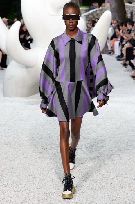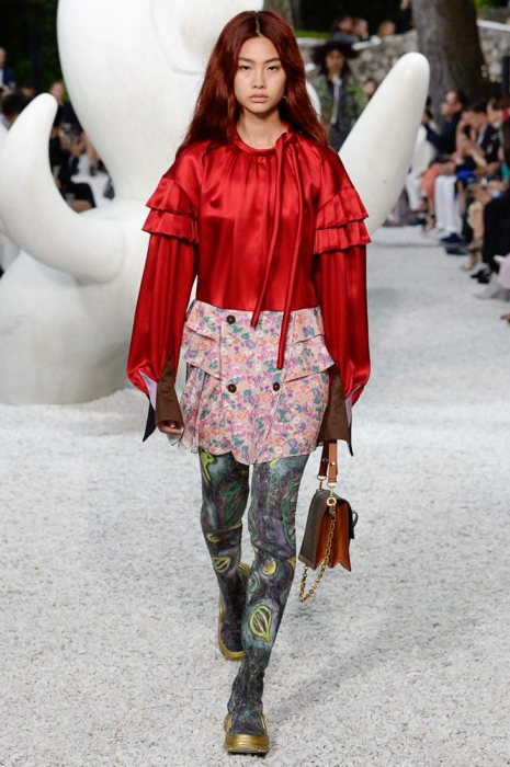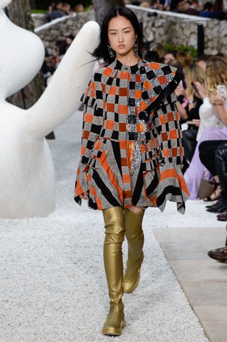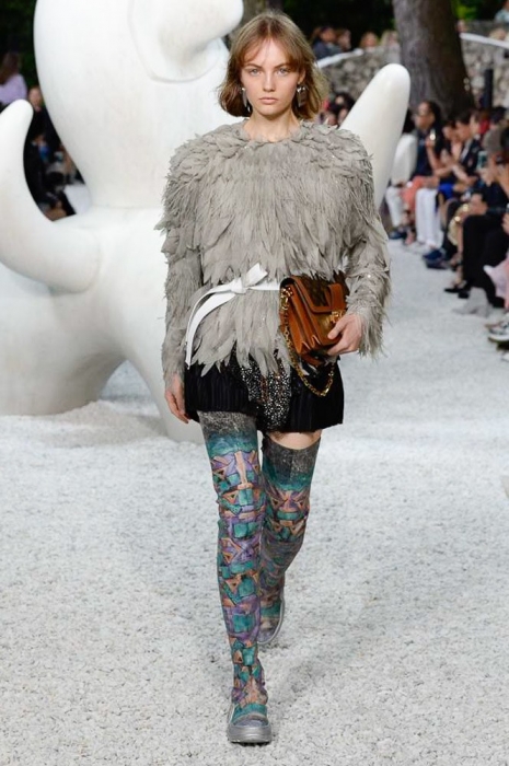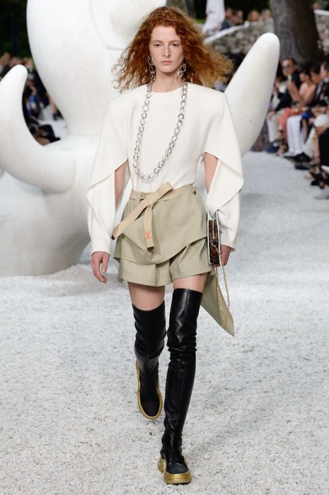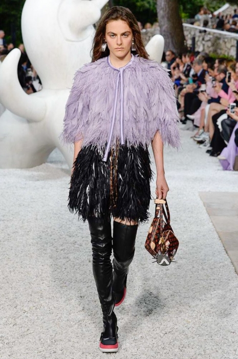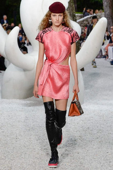 За несколько часов до показа resort-коллекции Louis Vuitton команда бреда выложила в «инстаграм» мультяшного котика — он «позировал» на фоне голубого неба и держал в руках мышь: смысл картинки подписчики так и не уловили. Оказалось, что «котик» — это брелок на новых футуристичных сумках марки (не все же ей быть из сезона в сезон серьезной!), а в качестве других стейтмент-элементов выступили ковбойские шляпы, жакеты из перьев, очки из клипа «Satisfaction» и кроссовки-ботфорты — видимо, ботфорты-чулки и кроссовки-носки Николя Гескьеру уже кажутся пережитком прошлого.