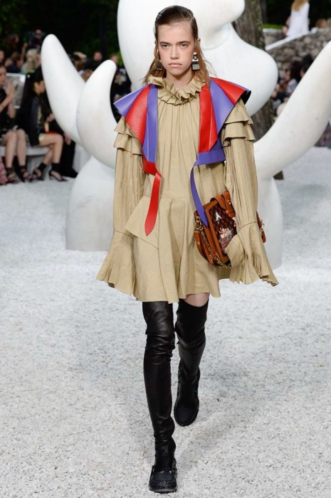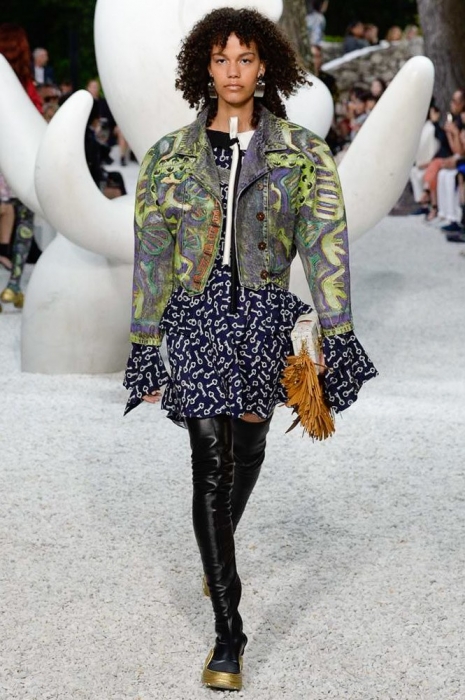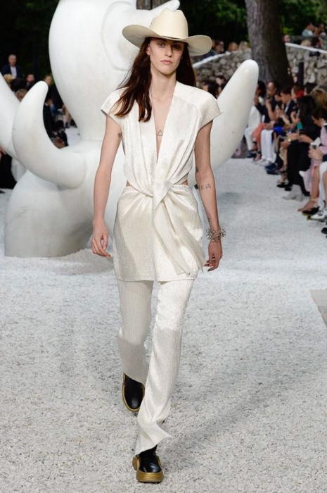 Ирония была и в самом сет-дизайне шоу: во дворе музея современного искусства Fondation Maeght в Сен-Поль де Вансе были установлены фигуры, имитировавшие походку моделей. Жаль, по сравнению с девушками в шелковых красных блузах, белоснежных брючных костюмах, оверсайз-джинсовках, этнических туниках и кожаных жакетах они выглядели очень голо и очень скучно.