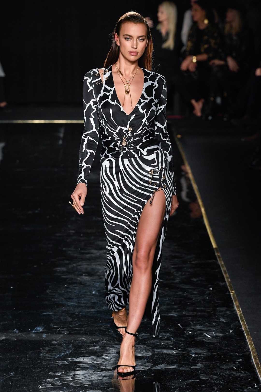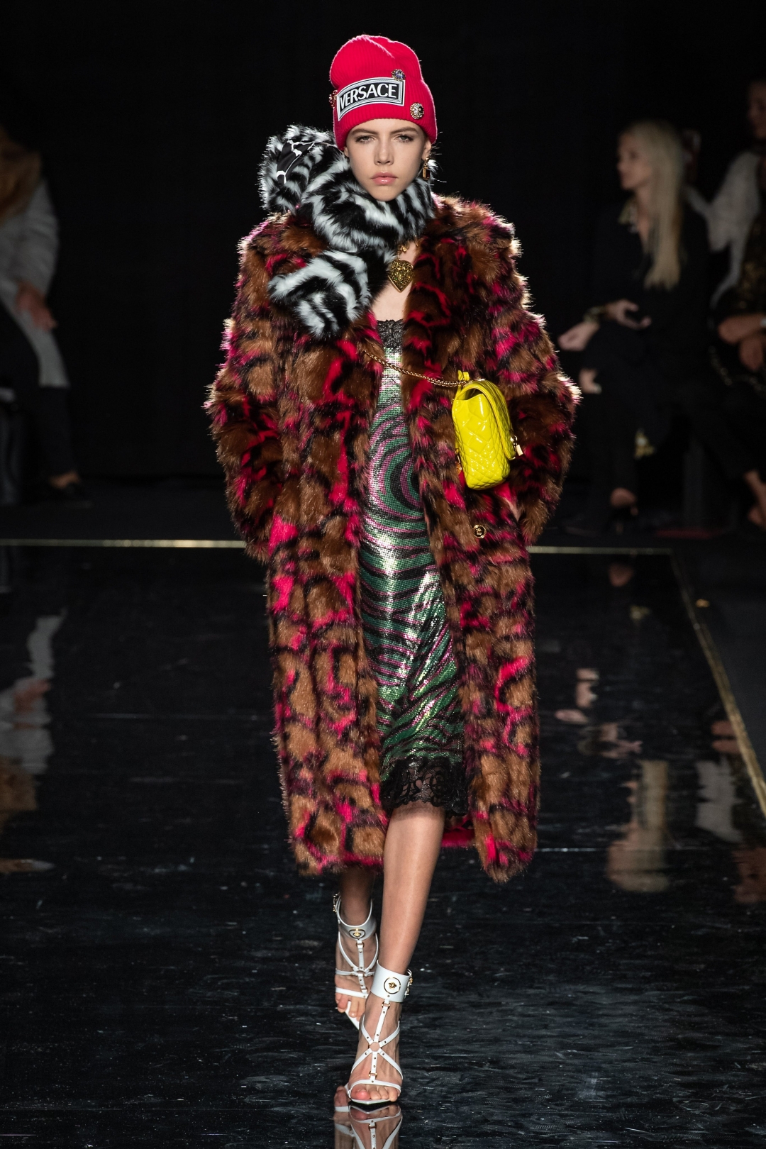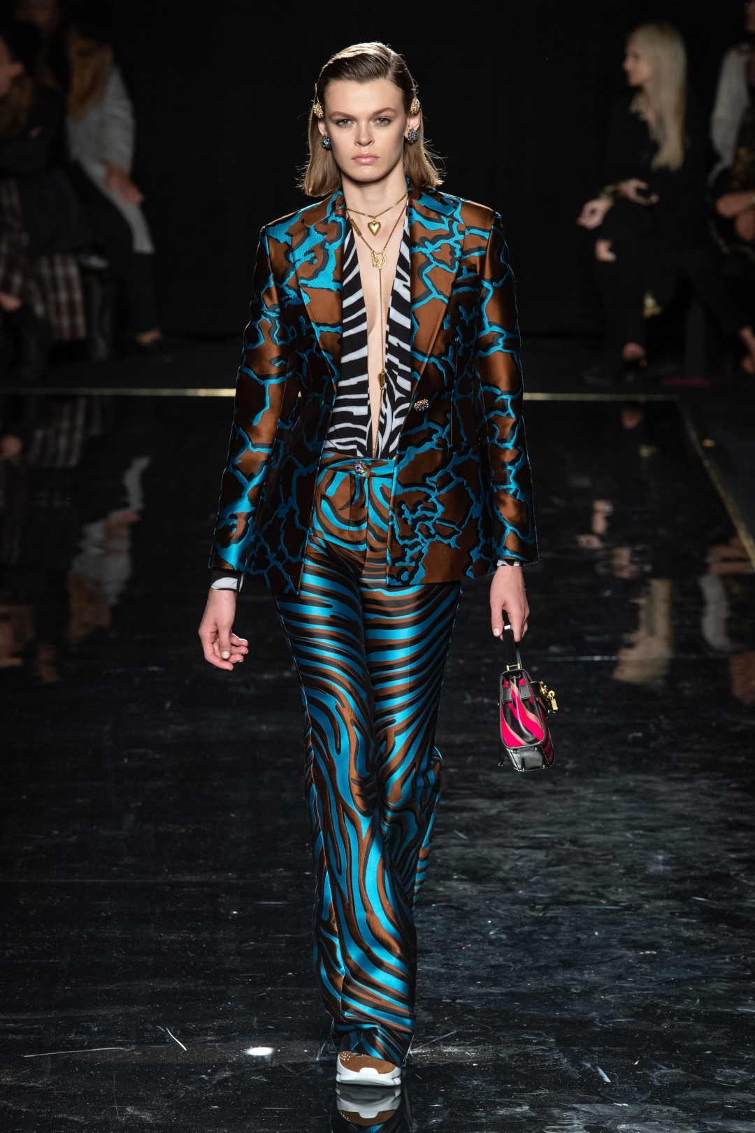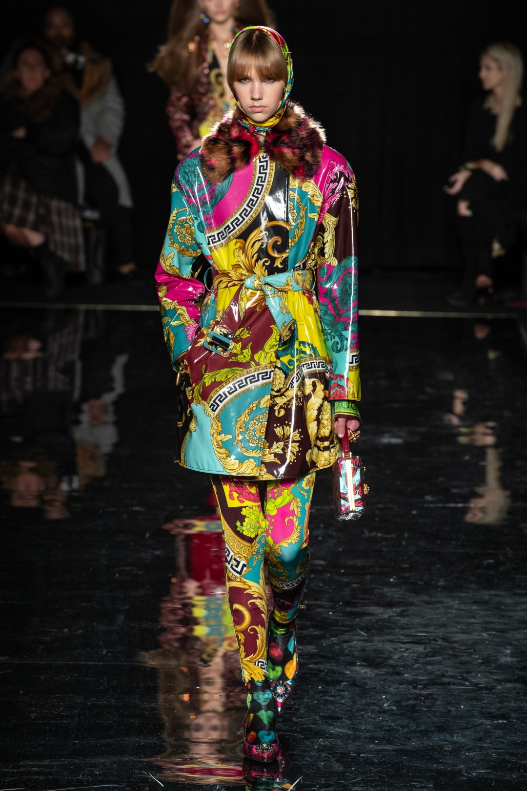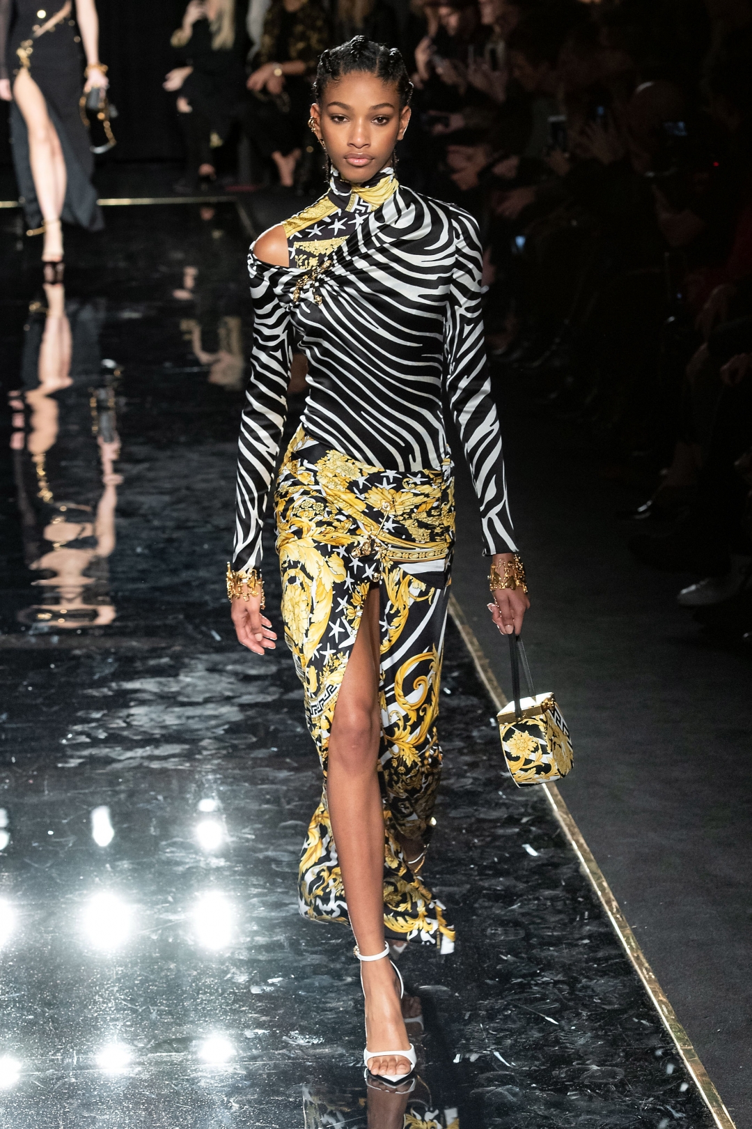 Донателла Версаче продолжает переиначивать коллекции брата и свои собственные: в 2019 году она снова предлагает носить костюмы с позолоченными вензелями из архивов 1994-го, платье Элизабет Херли с декольте и булавками и наряд Дженнифер Лопес с церемонии Grammy в 2000 году, снова представленном в финале показа Эмбер Валлеттой. Но помимо этого, в новой коллекции Versace смешались культурные коды из других модных домов: пятнистые костюмы Roberto Cavalli, зебровые платья Dolce & Gabbana, куртки Prada с розовой оторочкой и виниловые мини Moschino кислотных тонов.