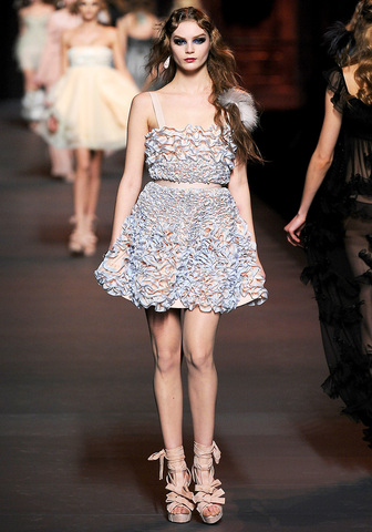 Коктейльные платья в складках, воланах, перьях марабу - визитная карточка Дома с 1950-х, как и приталенные жакеты, для которых Гальяно выбрал мягкое трикотажное полотно.