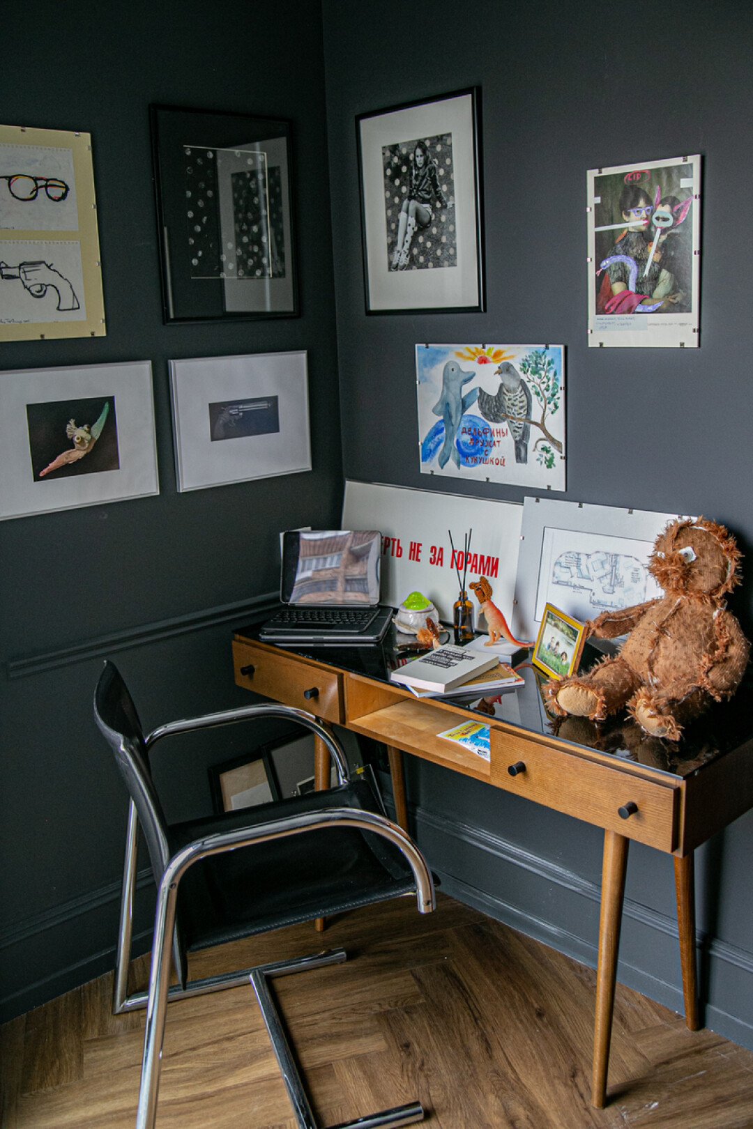 Эта квартира началась с выставки. Во время пандемии мы жили на даче, а здесь был голый бетон, мне хотелось как-то с этим пространством повзаимодействовать. Я предложила Якову Хореву сделать выставку. Художники присылали свои эскизы, а Яков с Егором Тоем воплощали их на стенах. Это отсылка к уличным работам на стенах, только внутри дома. Назвали проект «Коммуникации»: это и коммуникации в стенах, и коммуникации между гостями и хозяевами. Когда запреты отменили, мы начали проводить экскурсии по пространству. С той поры ничего не сохранилось, но такова судьба уличного искусства. Возможно, сделаем выставку «Коммуникации 2.0».