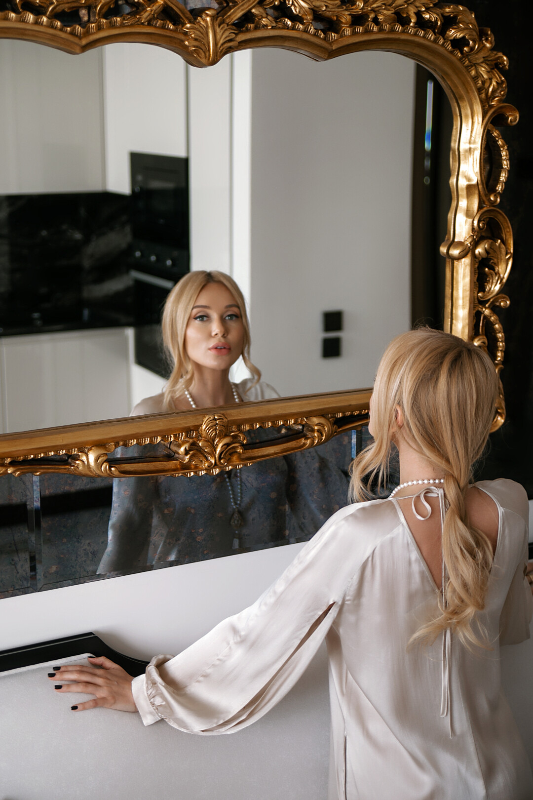 Яна Хилова, и я очень благодарна ей за то, что она тонко отразила мои пожелания. Эта квартира для отдыха, место, где я могу побыть одна, наполниться энергией. Чтобы выдержать стиль французской неоклассики, мы объединили строгие черные линии, состаренные зеркала в барочных рамах, лепнину и современное искусство. Уделили внимание фактурам, комбинируя текстиль самого высокого качества, лаковые поверхности, дерево и стекло. Большая часть предметов была сделана на заказ по нашим эскизам. Например, элементы графичной черно-белой обивки для банкеток подбирались мастерами вручную несколько месяцев. Интерьер получился лаконичный, но в то же время очень современный.