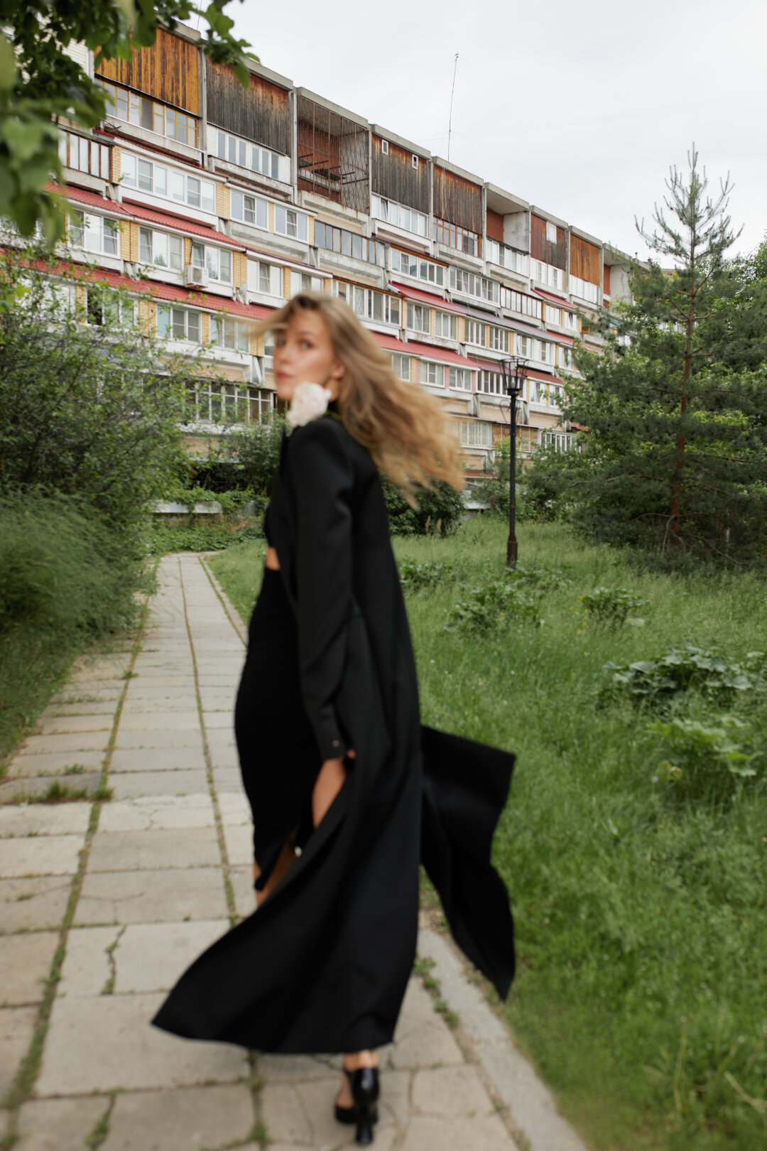Александра Винер сфотографирована в родном дворе – в экспериментальном жилом комплексе Мещерское озеро, который стал апробацией новой системы типового домостроения международного уровня. Этот микрорайон – попытка реализовать мечту об идеальных «панельках». Проект разрабатывался московским ЦНИИЭП жилища (архитектор Дмитрий Животов) в партнерстве с ГДР, а для внедрения серии домов Э-600 специально был создан ЗКПД-4. К 1991 году проект был реализован наполовину и приостановлен. Его новаторство и влияние на массовое жилищное строительство – в процессе осмысления.