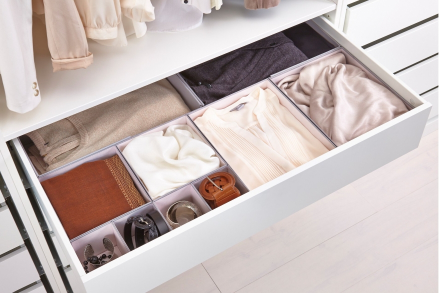Они стоят дороже полок, но это неплохая инвестиция в эргономику шкафа: в ящиках и корзинах удобно хранить нижнее белье, колготки, домашнюю одежду и свитера. Поддерживать порядок в ящиках помогут разделители.