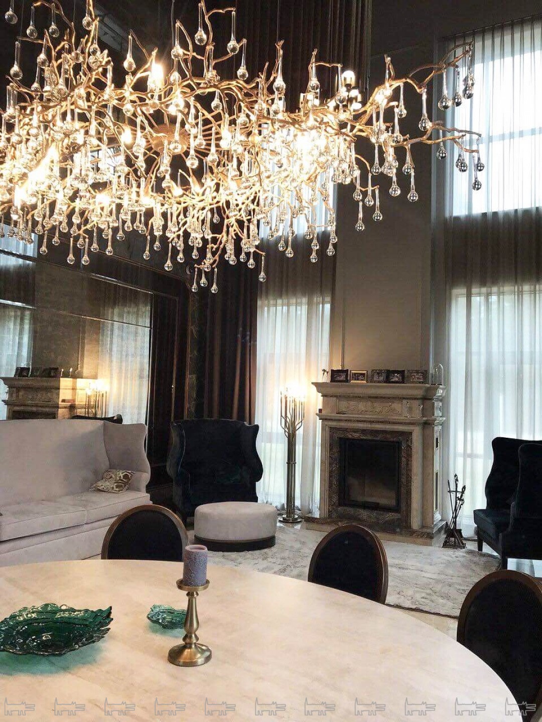 Проект Misterious castle - сочетание мистики и рационализма, возвышенности и целостности, явились основным источником вдохновения при проектировании гостиной в загородном доме. Концепция заключалась в формировании готического стиля, в современном авторском прочтении. Динамику устремлённых ввысь линии, образованные контурами уникальной авторской люстры, расположившейся на высоте семи метров от пола. Сложившуюся композицию, дополняет живописное панно и камин, облицованного мрамором, а так же, торшер и мягкая мебель. Отдельного внимания заслуживает и обеденная зона, образованная столом с подстольем, напоминающим арочные своды. Во внешние спинки стульев интегрирована паутинка готической розы. В завершении образа появляется волшебная люстра, с изящными латунными веточками, и прозрачными стеклянными капельками. Получившийся интерьер, покоряет с первого взгляда, каждого гостя, вошедшего в дом.