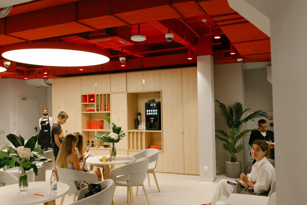 Никаких преград между клиентом и Альфа-Банком — это уже не просто маркетинговый слоган, а самая настоящая реальность. Рhygital-офисы построены по принципу студии: стильные и удобные зоны не разделены стенами (собственного кабинета нет даже у руководителя!), есть только несколько переговорных для клиентов, которые хотят решить свои вопросы в приватной атмосфере. Зато для гостей (а клиент здесь чувствует себя именно желанным гостем) есть отдельные столики, за которыми можно выпить кофе, диваны, на которых удобно обсудить все интересующие вопросы, и даже многофункциональный стол-кракен для разговора в более деловом и быстром формате. Но даже при таком современном подходе решают все люди.