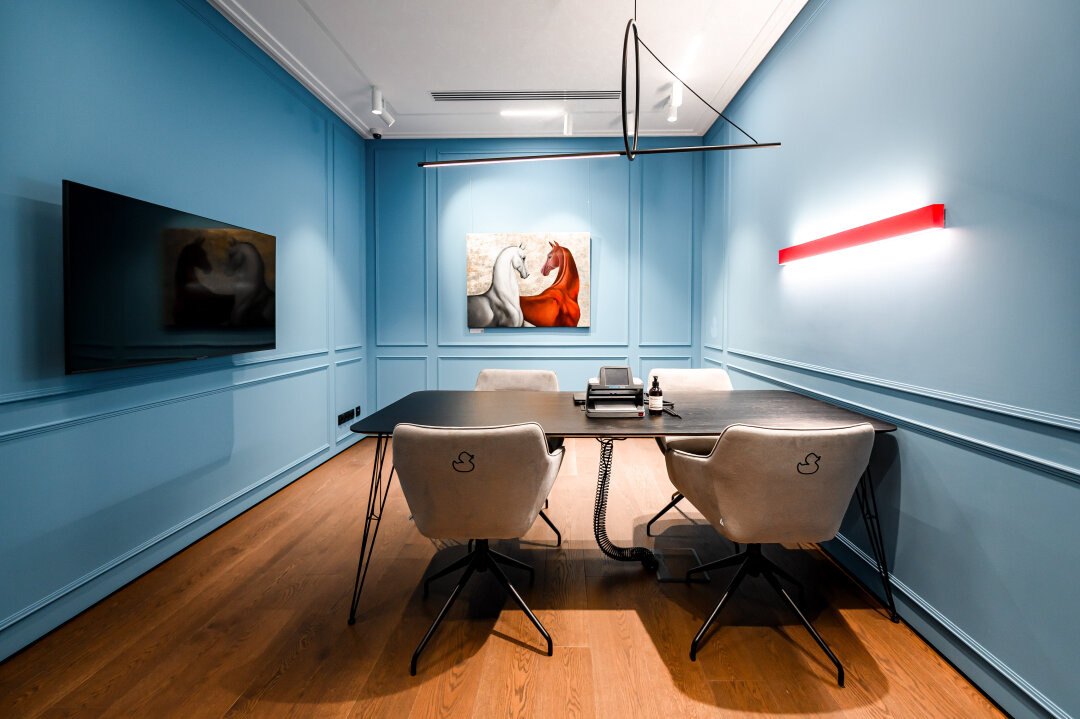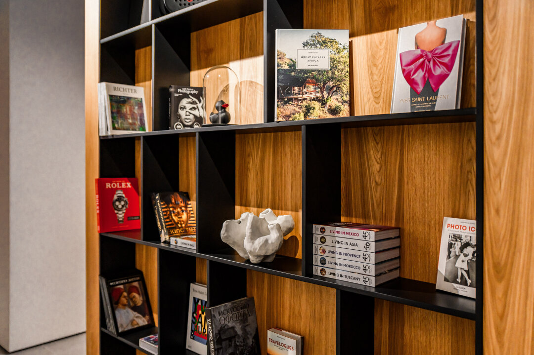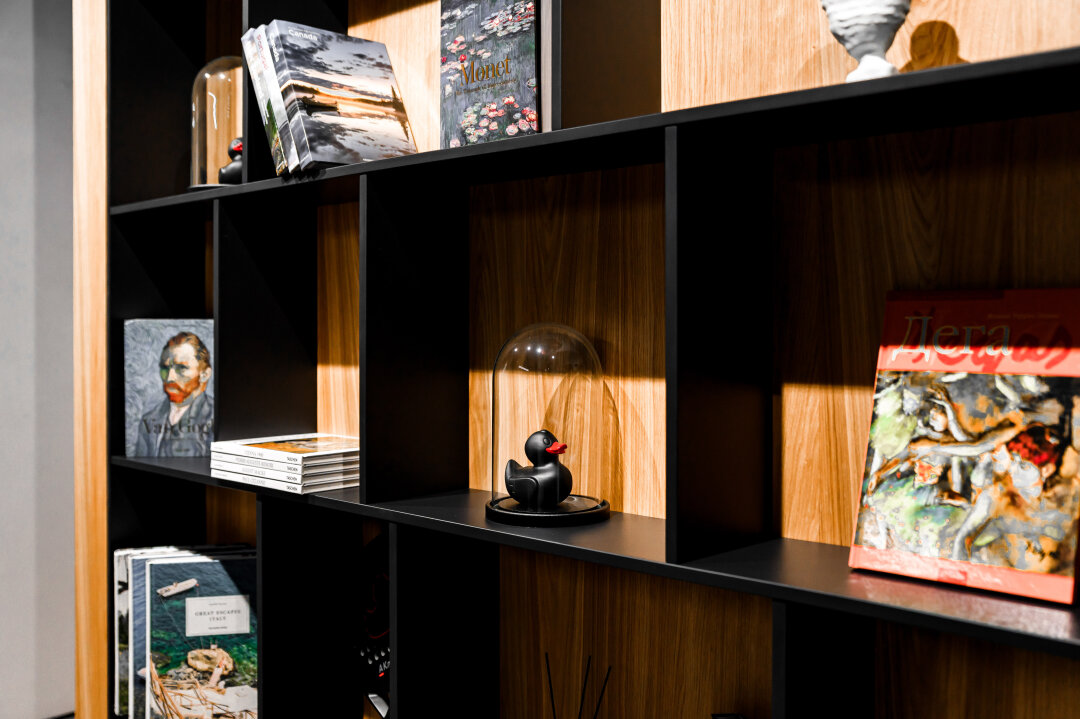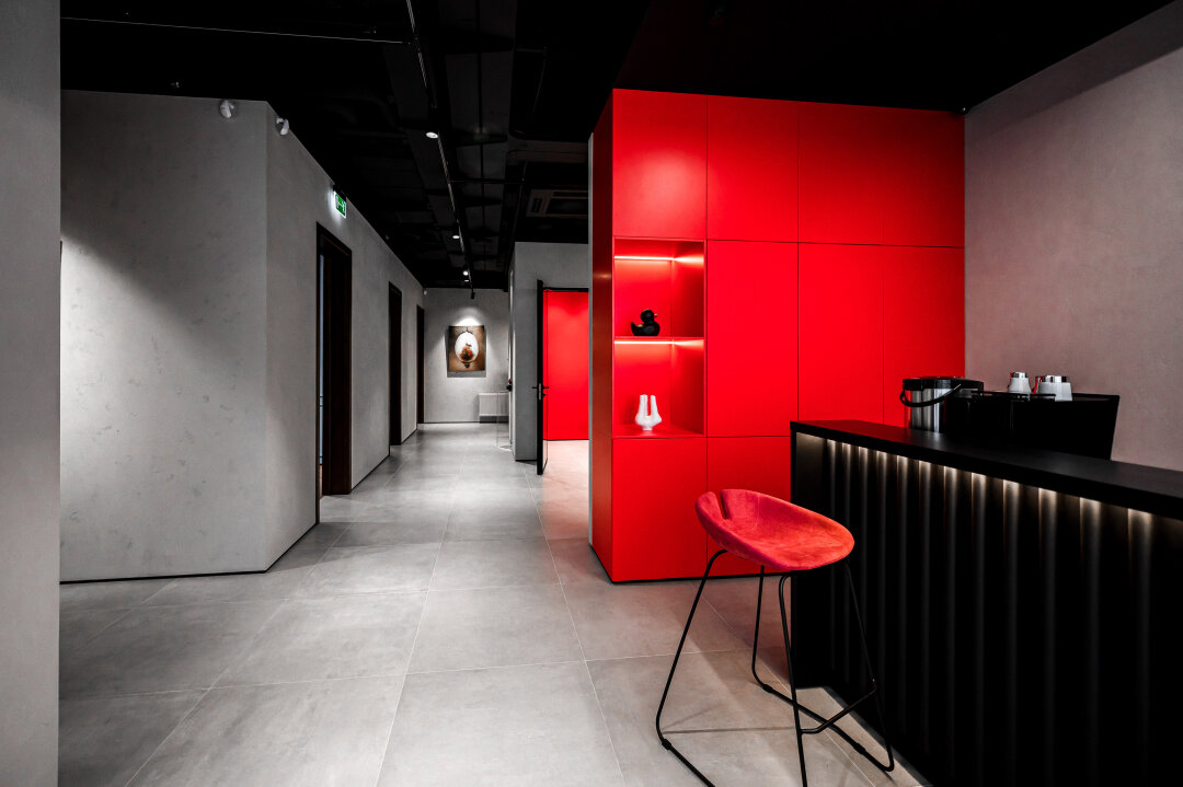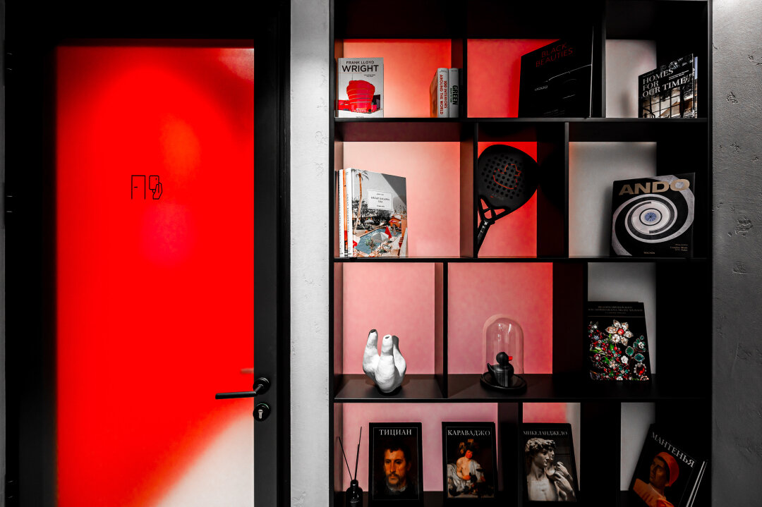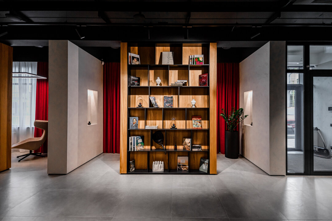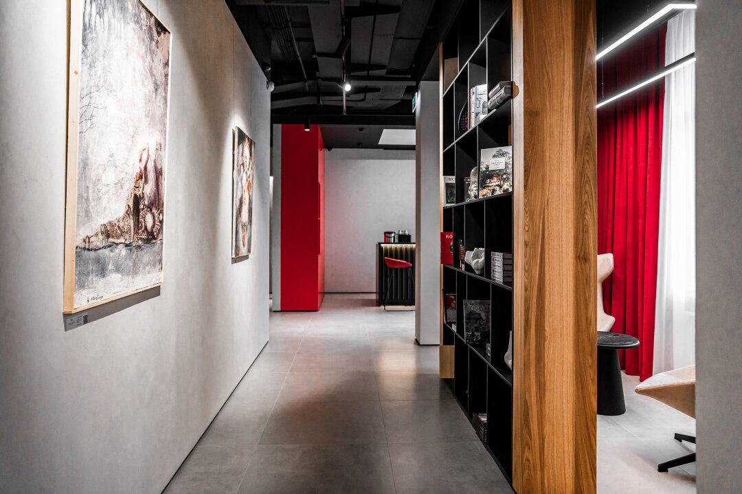 Интерьер объединяет эстетику современного искусства и функциональность делового пространства. В зале размещена коллекция галереи G1 — одной из крупнейших частных галерей России. Атмосферу дополняет фирменный аромат Scent of Red, созданный в сотрудничестве с брендом KĒBROC, а на стеллажах размещена библиотека по архитектуре, дизайну и культуре брендов.